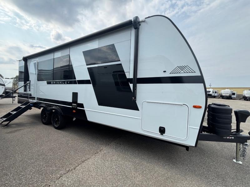 The lightweight Model I travel trailer by Brinkley is the perfect choice for those looking for an easy tow and at-home comforts! There is a drop-frame chassis, high-performance Road Armor suspension equalizer system, and Demco EZ Latch trailer coupler that automatically latches when dropped onto a hitch ball without the need of a safety pin. Additional exterior features include square Euro frameless windows, automotive-grade paint, full-width LED strip lighting in the pass-thru, and a pet & property security campside tie-down to keep your gear and furry friends safe. Inside, you'll be wowed by Brinkley's CraftSense wood trim construction, residential solid surface kitchen countertops, dimmable bedroom lights, and marine-grade neon LED shower lighting to name a few stand-out features!