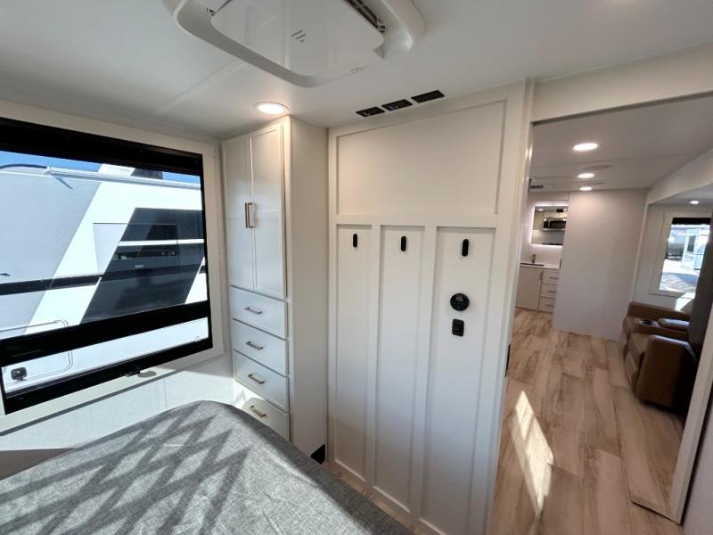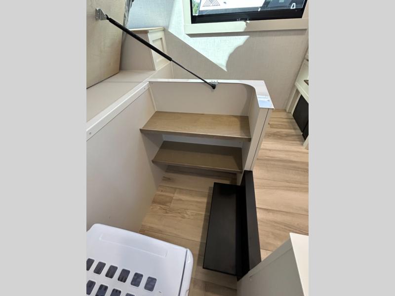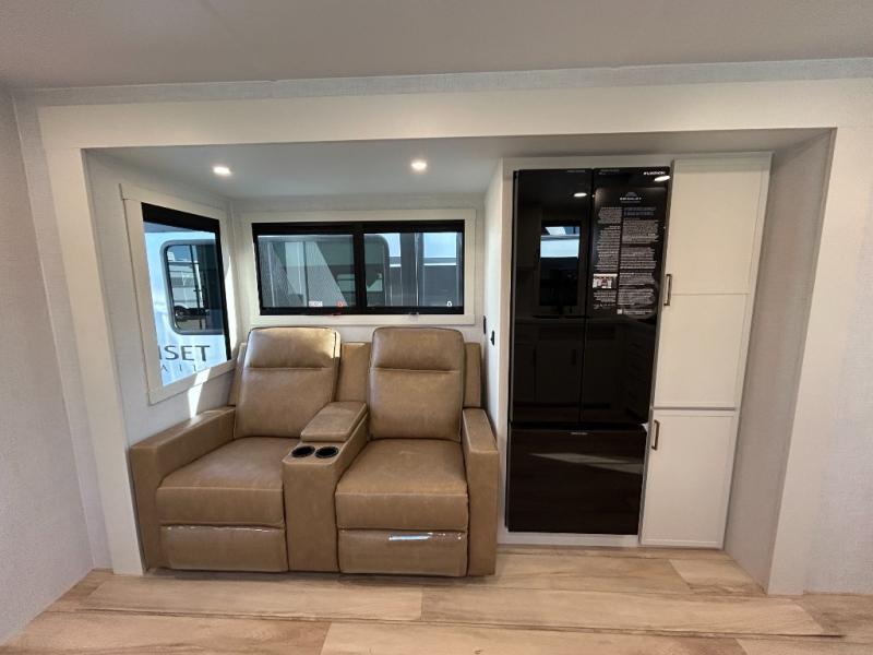 One look at this travel trailer and you'll be sold! The full rear bath features a spacious 42" x 30" shower with a built-in seat and Maxxair fan to name a few comforts. The front private bedroom features a 66" x 80" king bed with a MaxSpace Split-Level Wardrobe underneath to store shoes, clothes, and more! A slide out in the combined living area and kitchen makes your space more open, and you'll enjoy relaxing on the theater seating here in the evenings. The full kitchen includes a three burner stovetop, residential 30" convection microwave, 12 cu. ft. 12V refrigerator, plus a trash bin and Stow N' Go paper towel holder for added convenience. You can choose to eat outdoors under the 19' electric awning with LED lights or stay inside to dine at the pull-out dining table with a drawer for added storage! And if you're needing more sleeping space, just choose the optional tri-fold sofa in place of the theater seating!