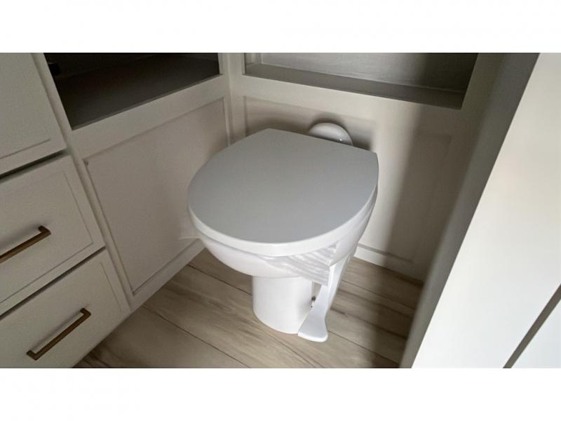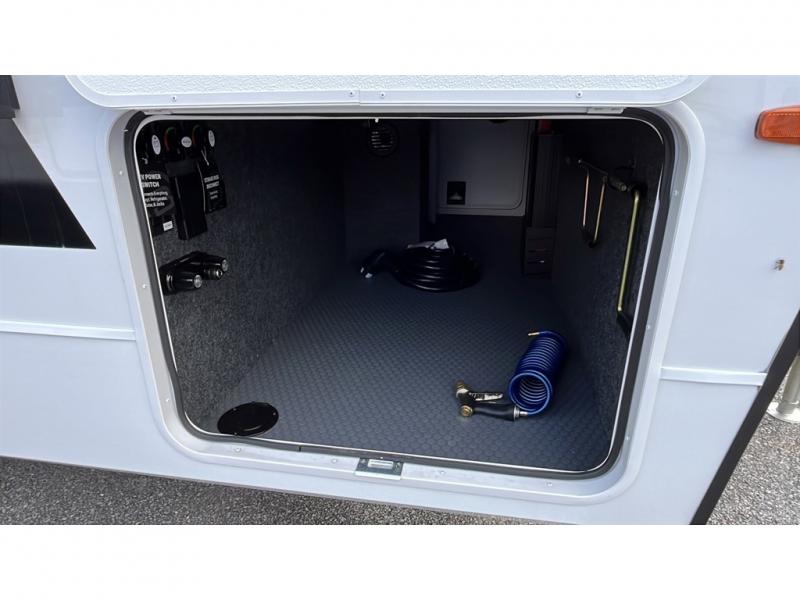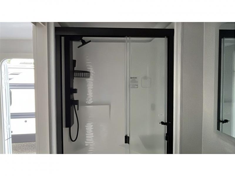 One look at this travel trailer and you'll be sold! The full rear bath features a spacious 42" x 30" shower with a built-in seat and Maxxair fan to name a few comforts. The front private bedroom features a 66" x 80" king bed with a MaxSpace Split-Level Wardrobe underneath to store shoes, clothes, and more! A slide out in the combined living area and kitchen makes your space more open, and you'll enjoy relaxing on the theater seating here in the evenings. The full kitchen includes a three burner stovetop, residential 30" convection microwave, 12 cu. ft. 12V refrigerator, plus a trash bin and Stow N' Go paper towel holder for added convenience. You can choose to eat outdoors under the 19' electric awning with LED lights or stay inside to dine at the pull-out dining table with a drawer for added storage! And if you're needing more sleeping space, just choose the optional tri-fold sofa in place of the theater seating!