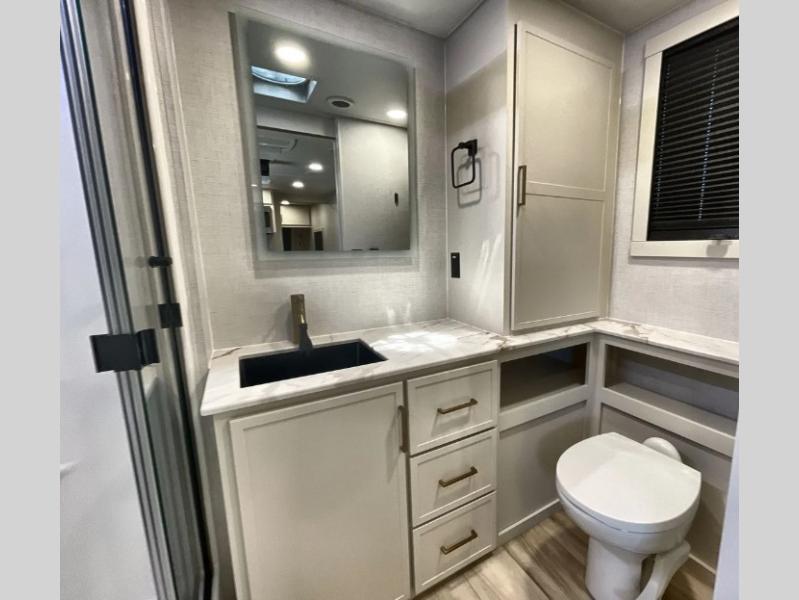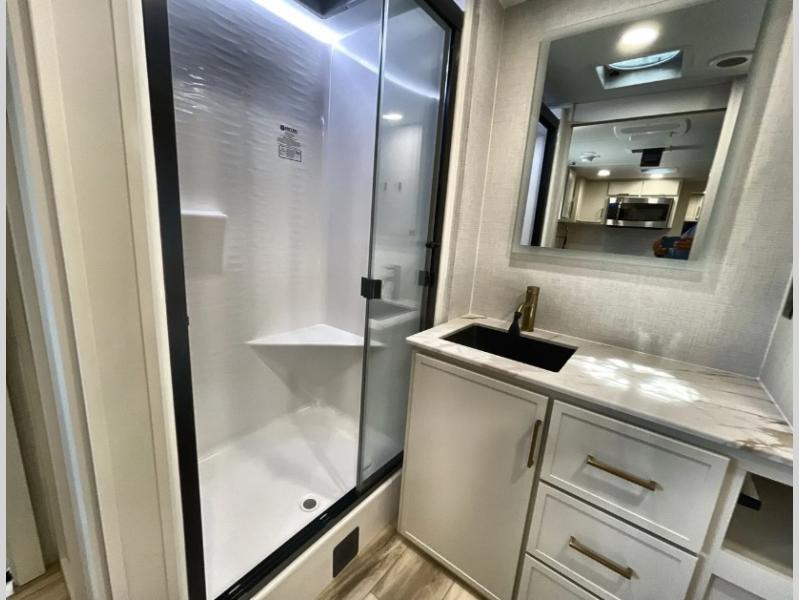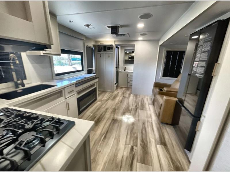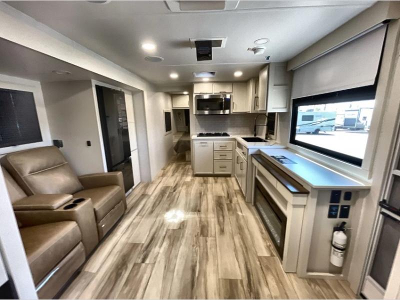 One look at this travel trailer and you'll be sold! The full rear bath features a spacious 42" x 30" shower with a built-in seat and Maxxair fan to name a few comforts. The front private bedroom features a 66" x 80" king bed with a MaxSpace Split-Level Wardrobe underneath to store shoes, clothes, and more! A slide out in the combined living area and kitchen makes your space more open, and you'll enjoy relaxing on the theater seating here in the evenings. The full kitchen includes a three burner stovetop, residential 30" convection microwave, 12 cu. ft. 12V refrigerator, plus a trash bin and Stow N' Go paper towel holder for added convenience. You can choose to eat outdoors under the 19' electric awning with LED lights or stay inside to dine at the pull-out dining table with a drawer for added storage! And if you're needing more sleeping space, just choose the optional tri-fold sofa in place of the theater seating!