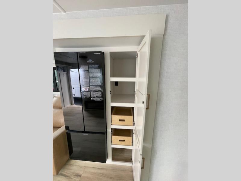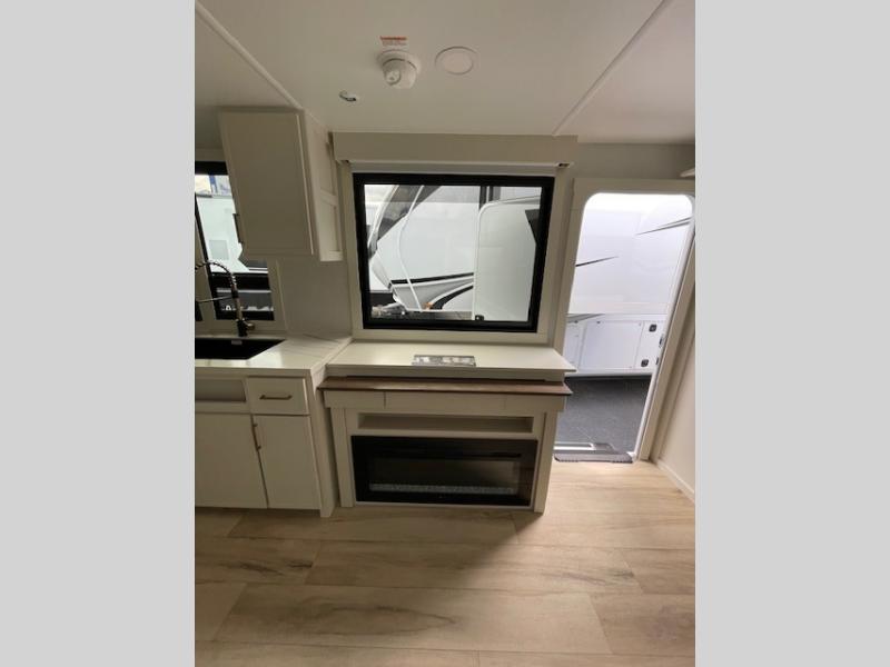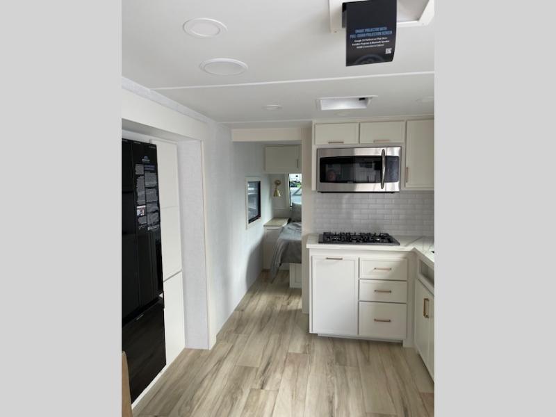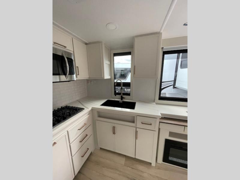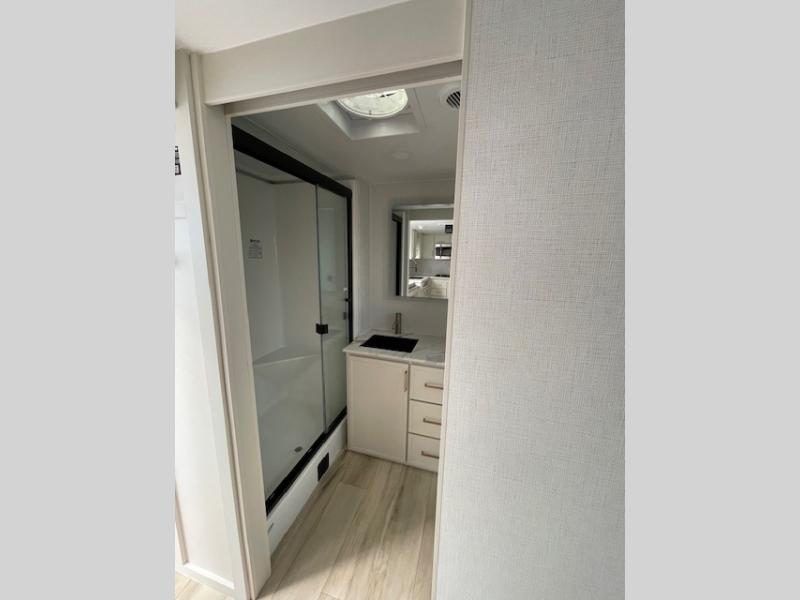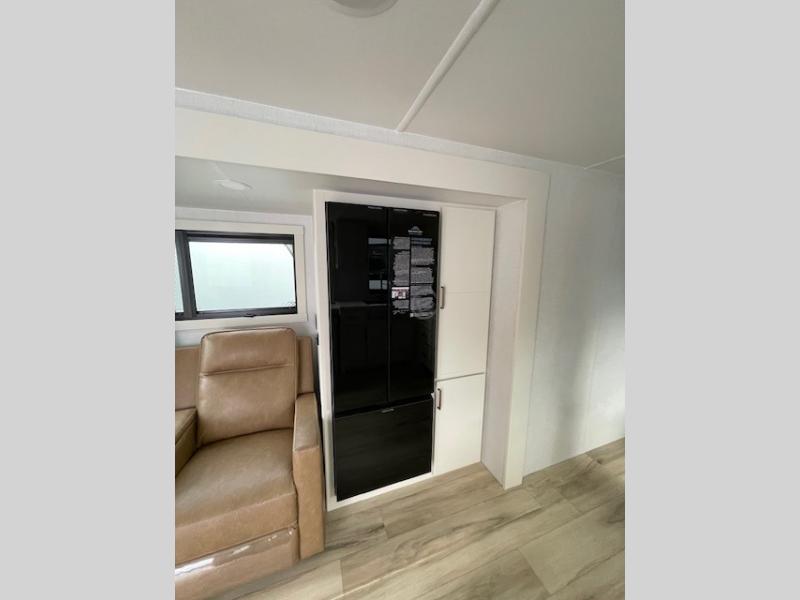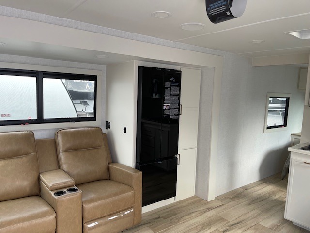 One look at this travel trailer and you'll be sold! The full rear bath features a spacious 42" x 30" shower with a built-in seat and Maxxair fan to name a few comforts. The front private bedroom features a 66" x 80" king bed with a MaxSpace Split-Level Wardrobe underneath to store shoes, clothes, and more! A slide out in the combined living area and kitchen makes your space more open, and you'll enjoy relaxing on the theater seating here in the evenings. The full kitchen includes a three burner stovetop, residential 30" convection microwave, 12 cu. ft. 12V refrigerator, plus a trash bin and Stow N' Go paper towel holder for added convenience. You can choose to eat outdoors under the 19' electric awning with LED lights or stay inside to dine at the pull-out dining table with a drawer for added storage! And if you're needing more sleeping space, just choose the optional tri-fold sofa in place of the theater seating!