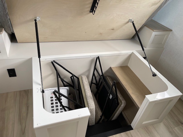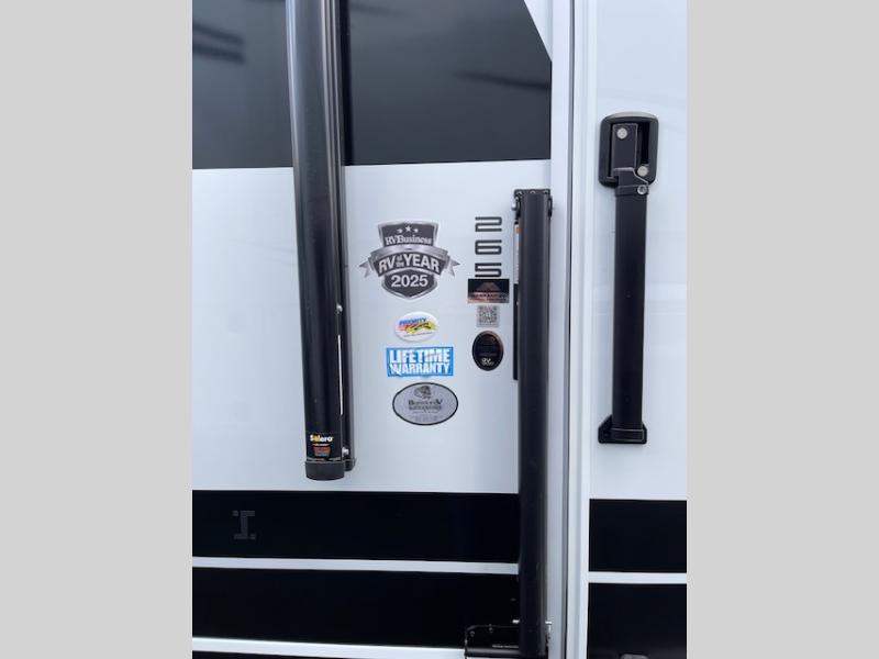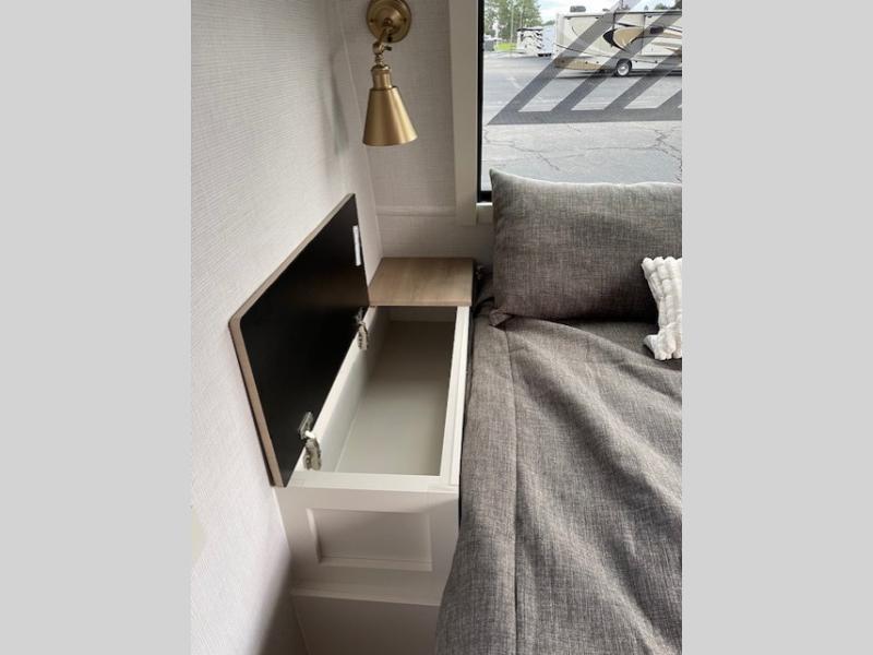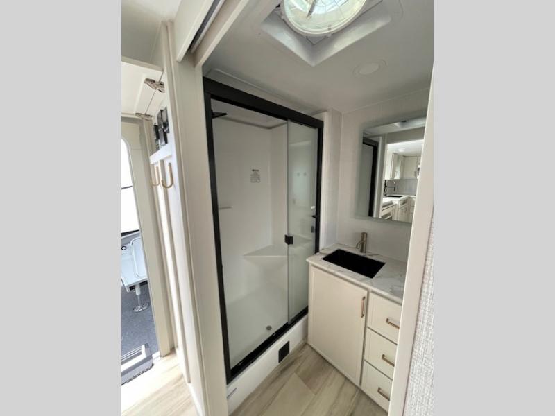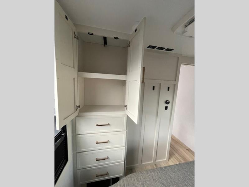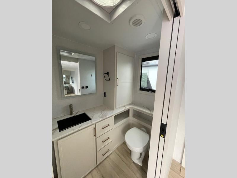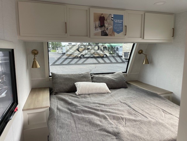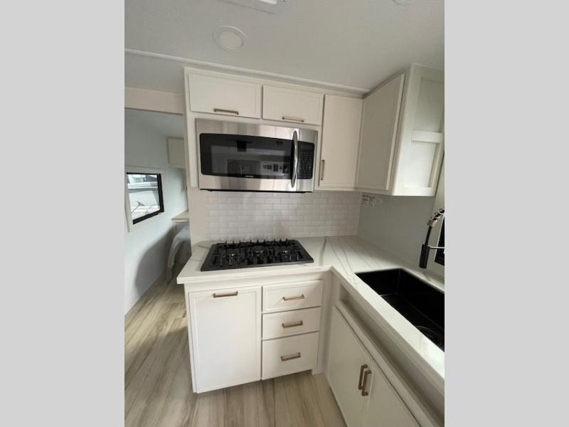 One look at this travel trailer and you'll be sold! The full rear bath features a spacious 42" x 30" shower with a built-in seat and Maxxair fan to name a few comforts. The front private bedroom features a 66" x 80" king bed with a MaxSpace Split-Level Wardrobe underneath to store shoes, clothes, and more! A slide out in the combined living area and kitchen makes your space more open, and you'll enjoy relaxing on the theater seating here in the evenings. The full kitchen includes a three burner stovetop, residential 30" convection microwave, 12 cu. ft. 12V refrigerator, plus a trash bin and Stow N' Go paper towel holder for added convenience. You can choose to eat outdoors under the 19' electric awning with LED lights or stay inside to dine at the pull-out dining table with a drawer for added storage! And if you're needing more sleeping space, just choose the optional tri-fold sofa in place of the theater seating!