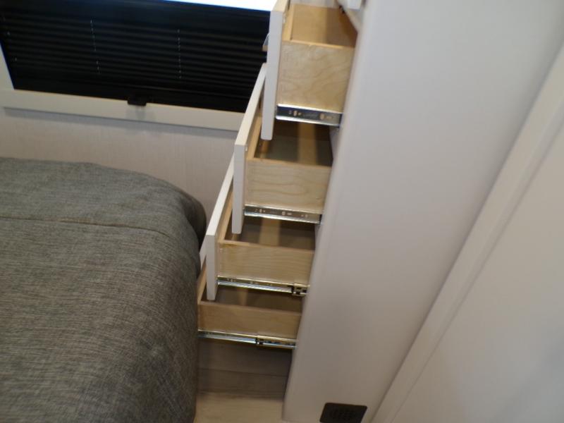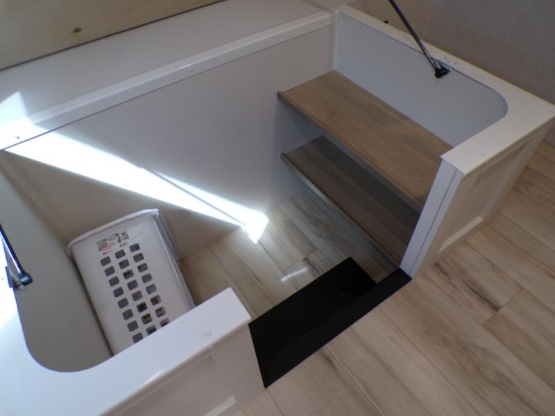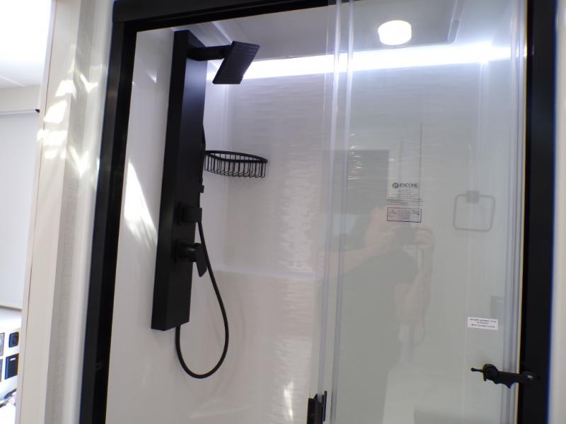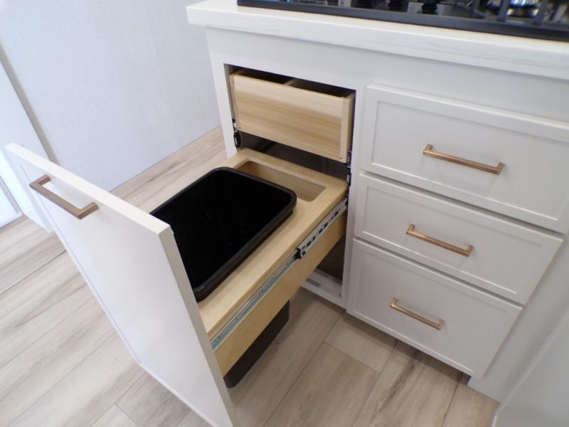 One look at this travel trailer and you'll be sold! The full rear bath features a spacious 42" x 30" shower with a built-in seat and Maxxair fan to name a few comforts. The front private bedroom features a 66" x 80" king bed with a MaxSpace Split-Level Wardrobe underneath to store shoes, clothes, and more! A slide out in the combined living area and kitchen makes your space more open, and you'll enjoy relaxing on the theater seating here in the evenings. The full kitchen includes a three burner stovetop, residential 30" convection microwave, 12 cu. ft. 12V refrigerator, plus a trash bin and Stow N' Go paper towel holder for added convenience. You can choose to eat outdoors under the 19' electric awning with LED lights or stay inside to dine at the pull-out dining table with a drawer for added storage! And if you're needing more sleeping space, just choose the optional tri-fold sofa in place of the theater seating!