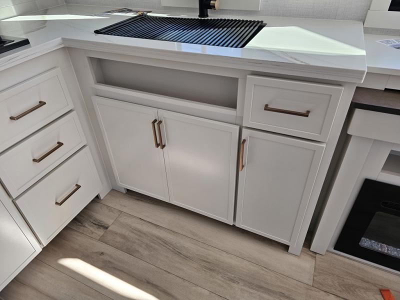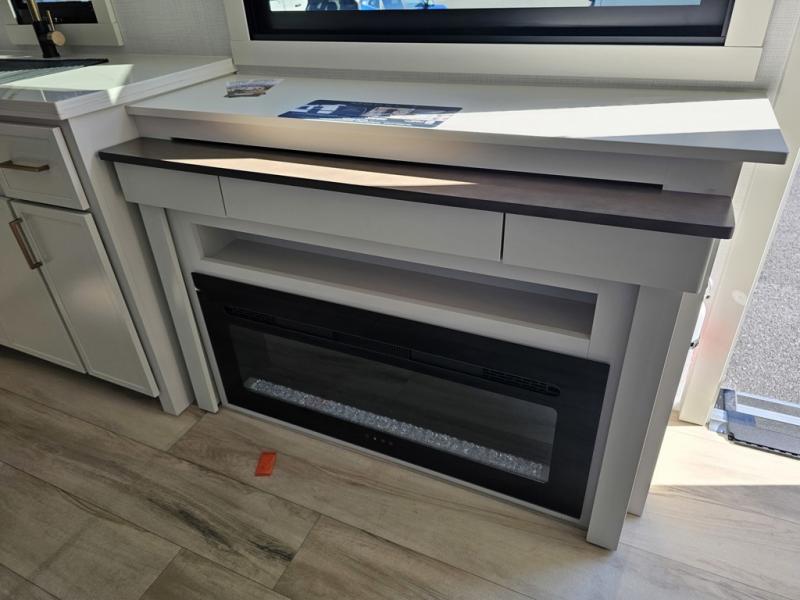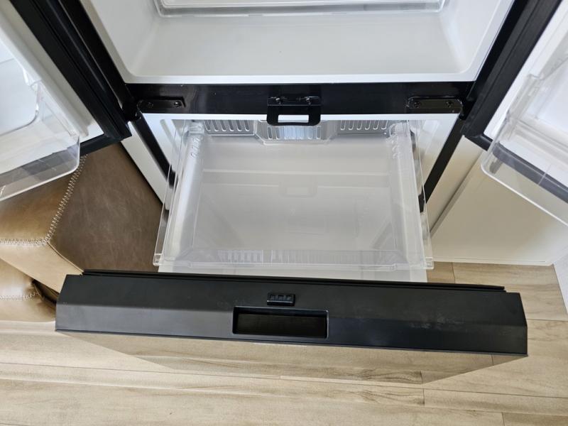 One look at this travel trailer and you'll be sold! The full rear bath features a spacious 42" x 30" shower with a built-in seat and Maxxair fan to name a few comforts. The front private bedroom features a 66" x 80" king bed with a MaxSpace Split-Level Wardrobe underneath to store shoes, clothes, and more! A slide out in the combined living area and kitchen makes your space more open, and you'll enjoy relaxing on the theater seating here in the evenings. The full kitchen includes a three burner stovetop, residential 30" convection microwave, 12 cu. ft. 12V refrigerator, plus a trash bin and Stow N' Go paper towel holder for added convenience. You can choose to eat outdoors under the 19' electric awning with LED lights or stay inside to dine at the pull-out dining table with a drawer for added storage! And if you're needing more sleeping space, just choose the optional tri-fold sofa in place of the theater seating!