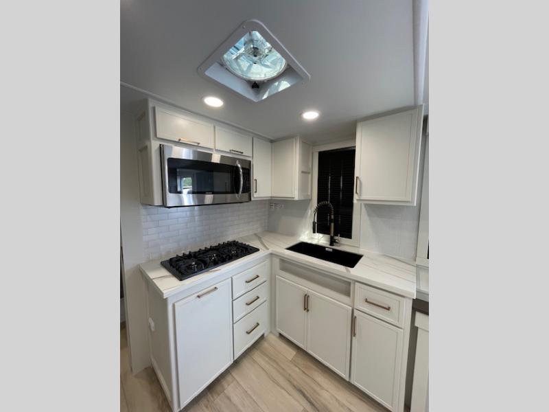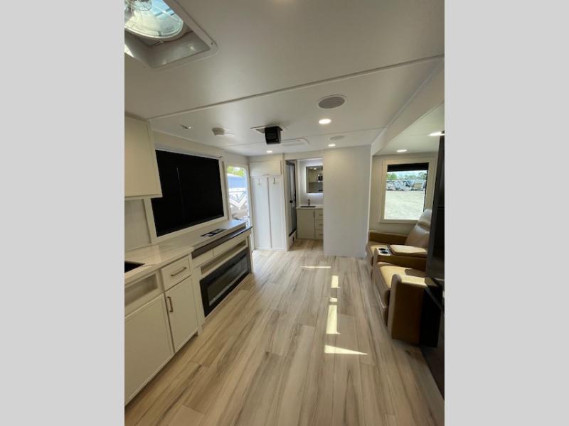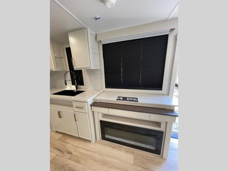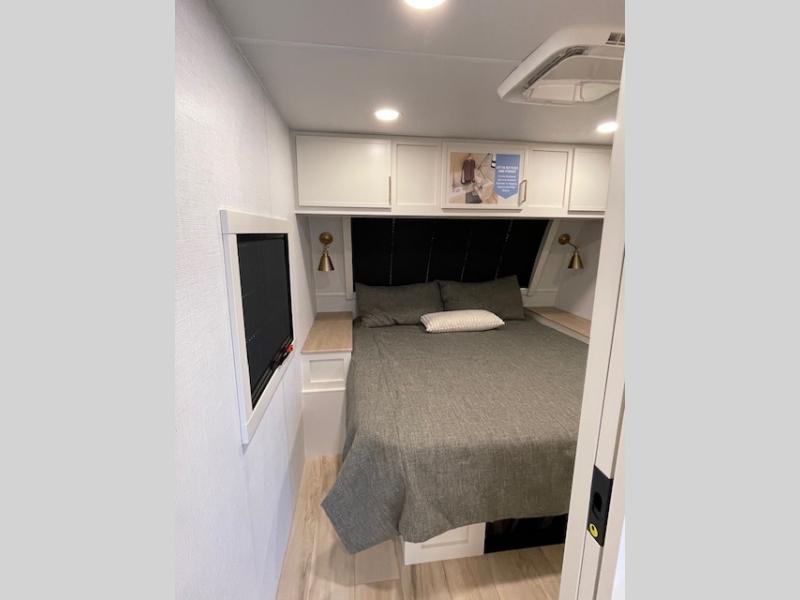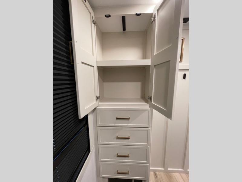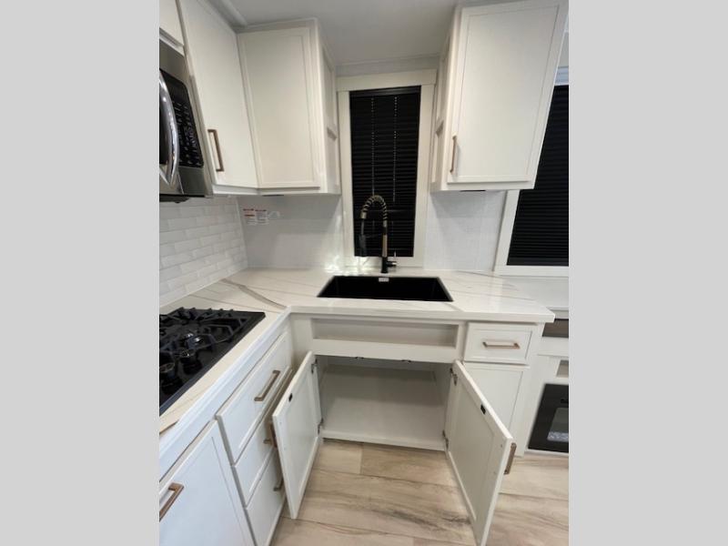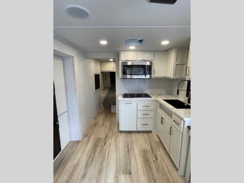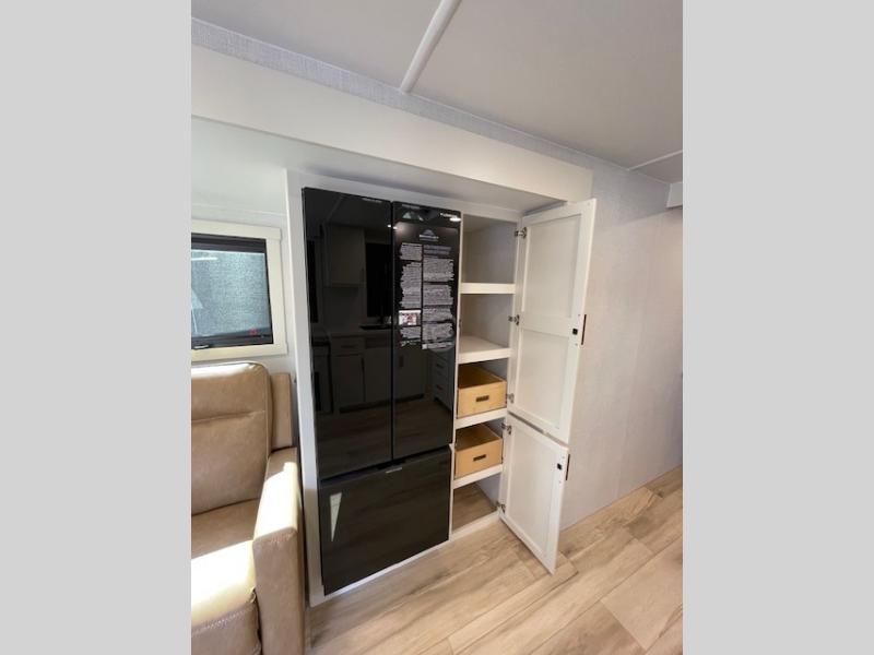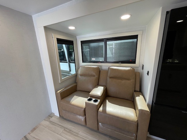 One look at this travel trailer and you'll be sold! The full rear bath features a spacious 42" x 30" shower with a built-in seat and Maxxair fan to name a few comforts. The front private bedroom features a 66" x 80" king bed with a MaxSpace Split-Level Wardrobe underneath to store shoes, clothes, and more! A slide out in the combined living area and kitchen makes your space more open, and you'll enjoy relaxing on the theater seating here in the evenings. The full kitchen includes a three burner stovetop, residential 30" convection microwave, 12 cu. ft. 12V refrigerator, plus a trash bin and Stow N' Go paper towel holder for added convenience. You can choose to eat outdoors under the 19' electric awning with LED lights or stay inside to dine at the pull-out dining table with a drawer for added storage! And if you're needing more sleeping space, just choose the optional tri-fold sofa in place of the theater seating!