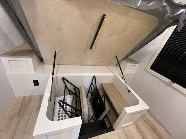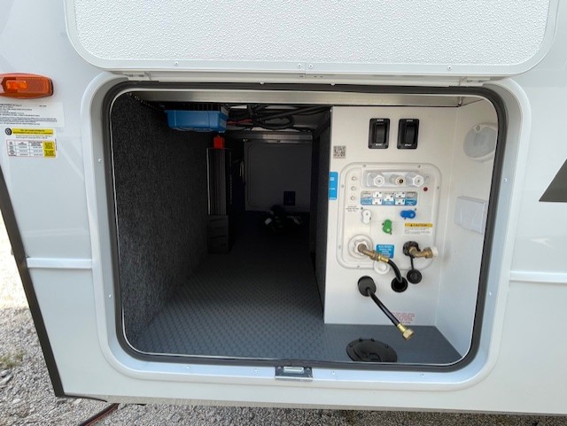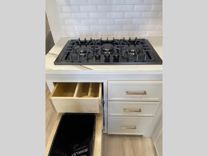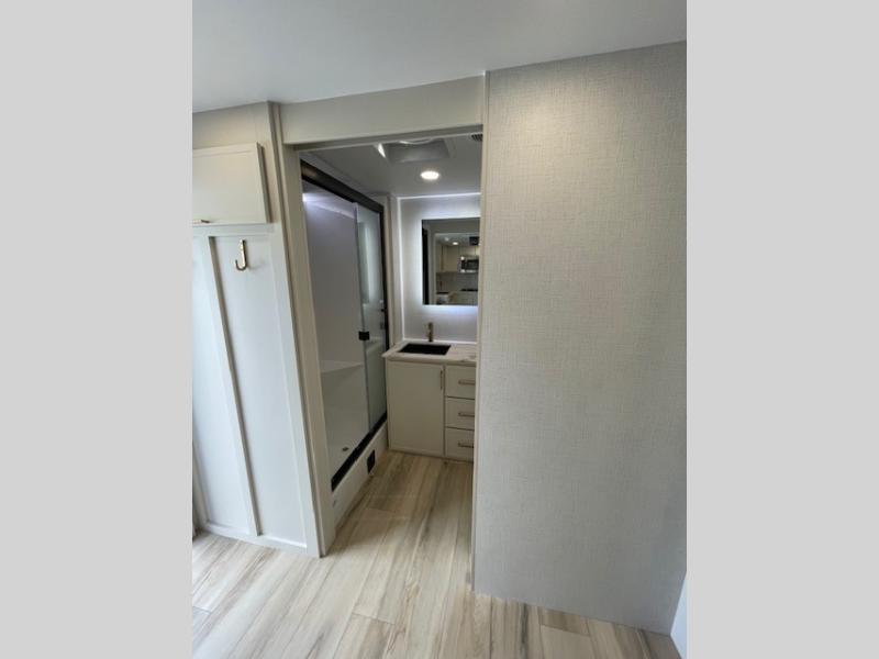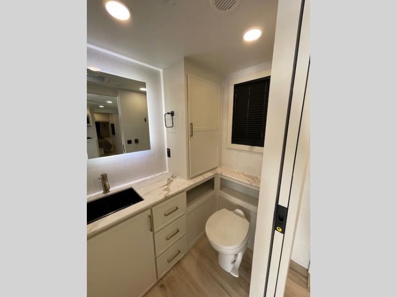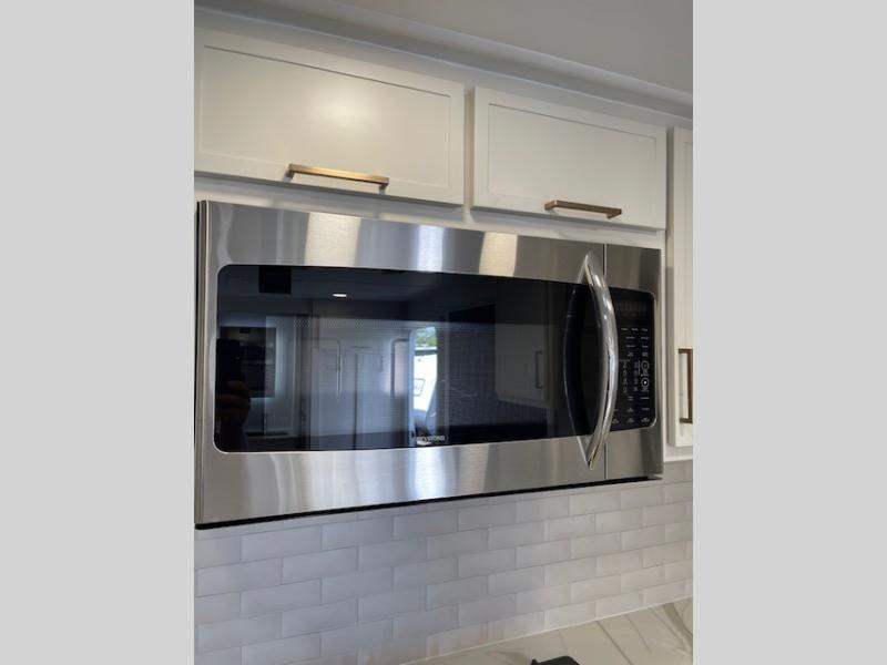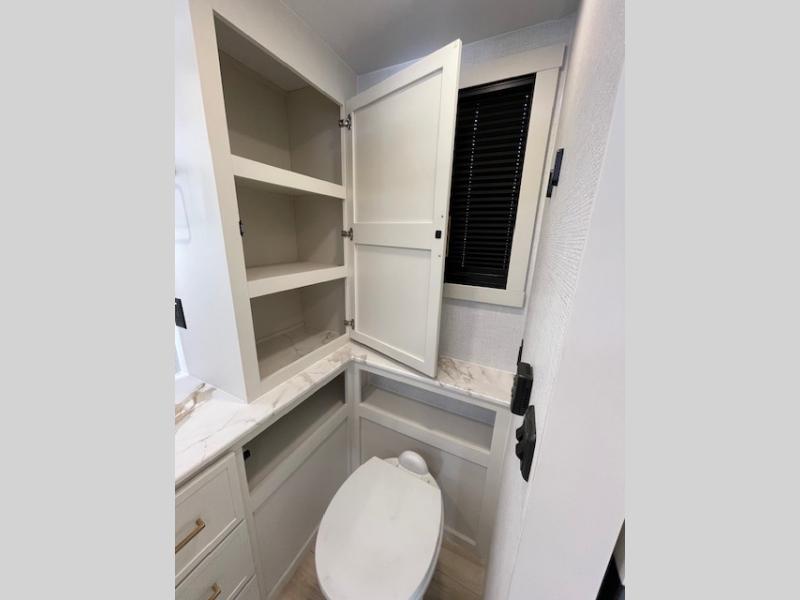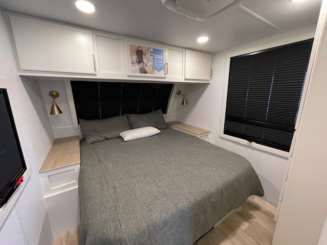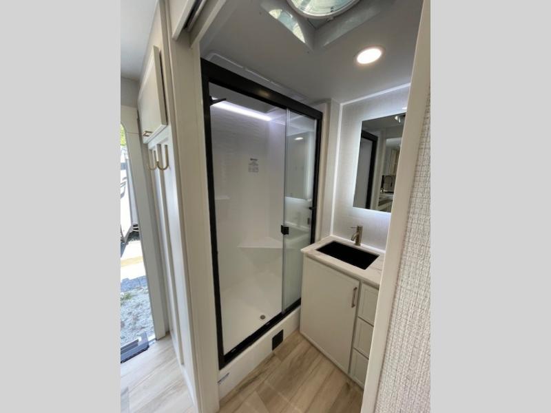 One look at this travel trailer and you'll be sold! The full rear bath features a spacious 42" x 30" shower with a built-in seat and Maxxair fan to name a few comforts. The front private bedroom features a 66" x 80" king bed with a MaxSpace Split-Level Wardrobe underneath to store shoes, clothes, and more! A slide out in the combined living area and kitchen makes your space more open, and you'll enjoy relaxing on the theater seating here in the evenings. The full kitchen includes a three burner stovetop, residential 30" convection microwave, 12 cu. ft. 12V refrigerator, plus a trash bin and Stow N' Go paper towel holder for added convenience. You can choose to eat outdoors under the 19' electric awning with LED lights or stay inside to dine at the pull-out dining table with a drawer for added storage! And if you're needing more sleeping space, just choose the optional tri-fold sofa in place of the theater seating!