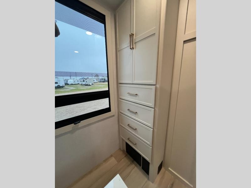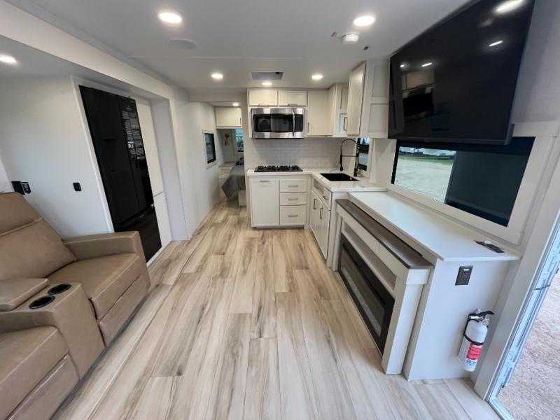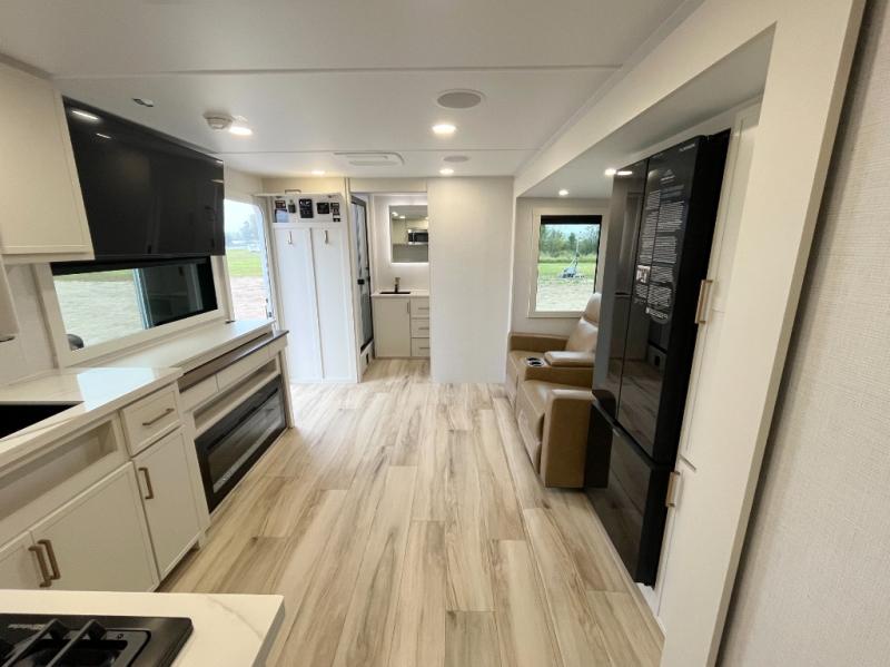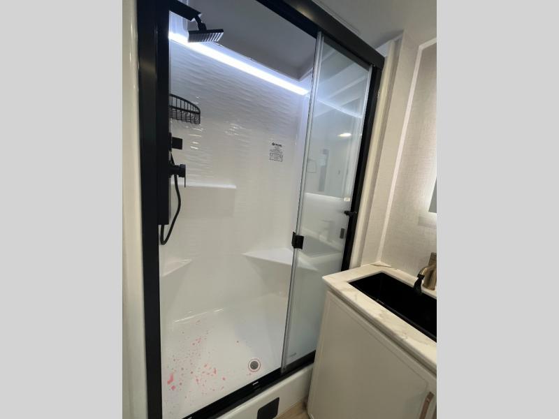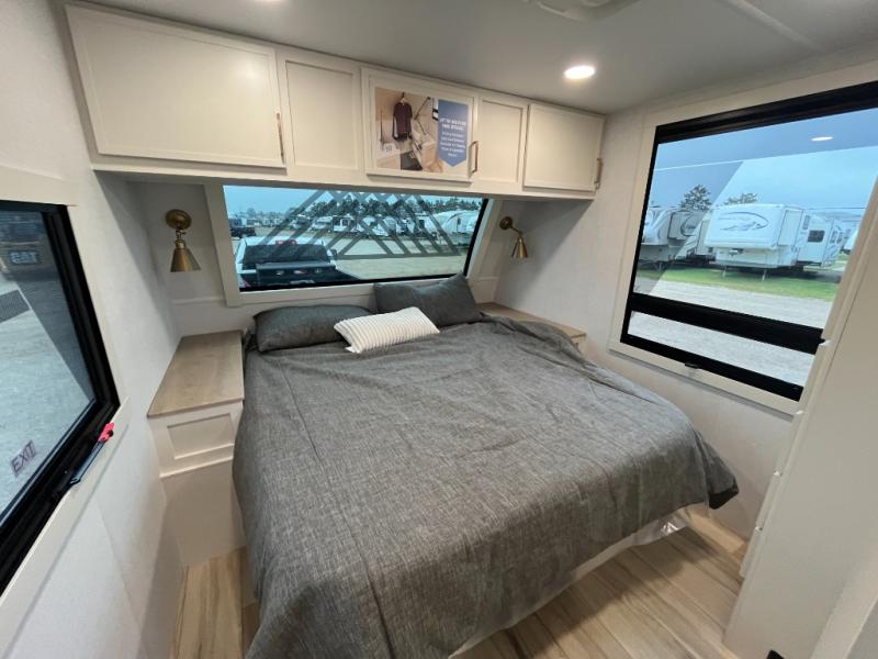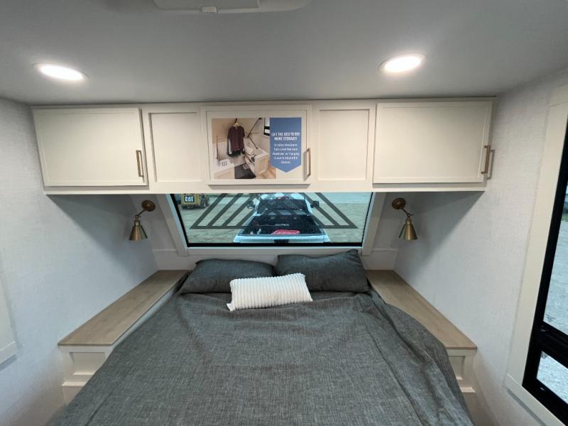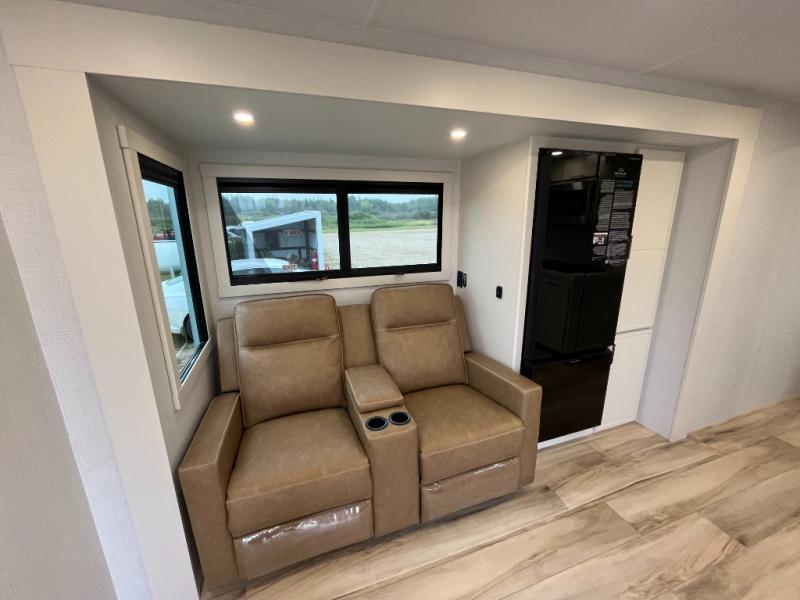 One look at this travel trailer and you'll be sold! The full rear bath features a spacious 42" x 30" shower with a built-in seat and Maxxair fan to name a few comforts. The front private bedroom features a 66" x 80" king bed with a MaxSpace Split-Level Wardrobe underneath to store shoes, clothes, and more! A slide out in the combined living area and kitchen makes your space more open, and you'll enjoy relaxing on the theater seating here in the evenings. The full kitchen includes a three burner stovetop, residential 30" convection microwave, 12 cu. ft. 12V refrigerator, plus a trash bin and Stow N' Go paper towel holder for added convenience. You can choose to eat outdoors under the 19' electric awning with LED lights or stay inside to dine at the pull-out dining table with a drawer for added storage! And if you're needing more sleeping space, just choose the optional tri-fold sofa in place of the theater seating!