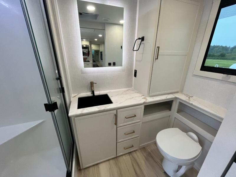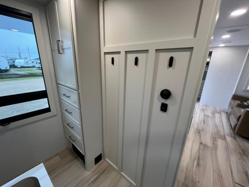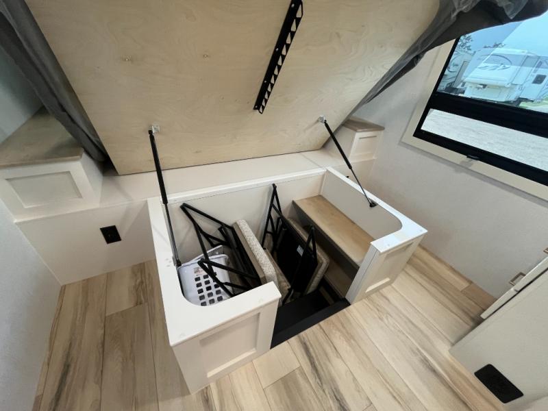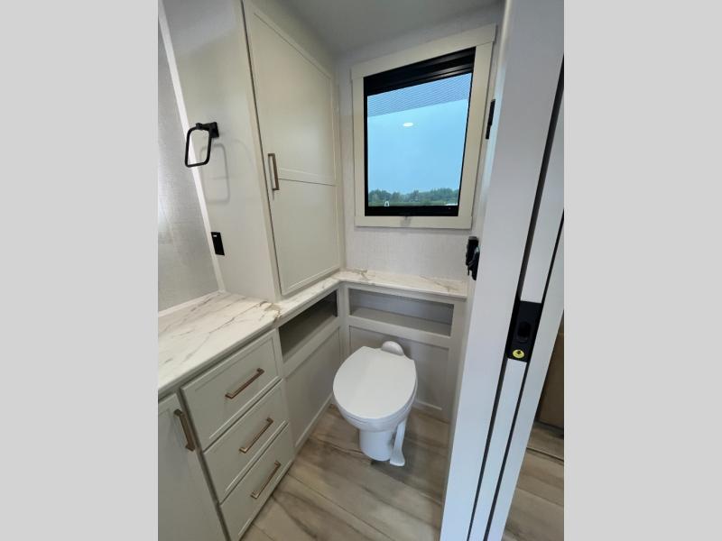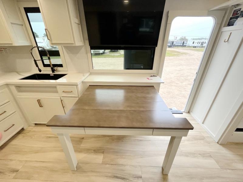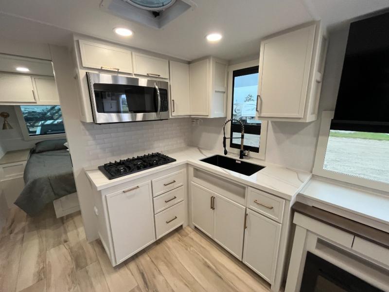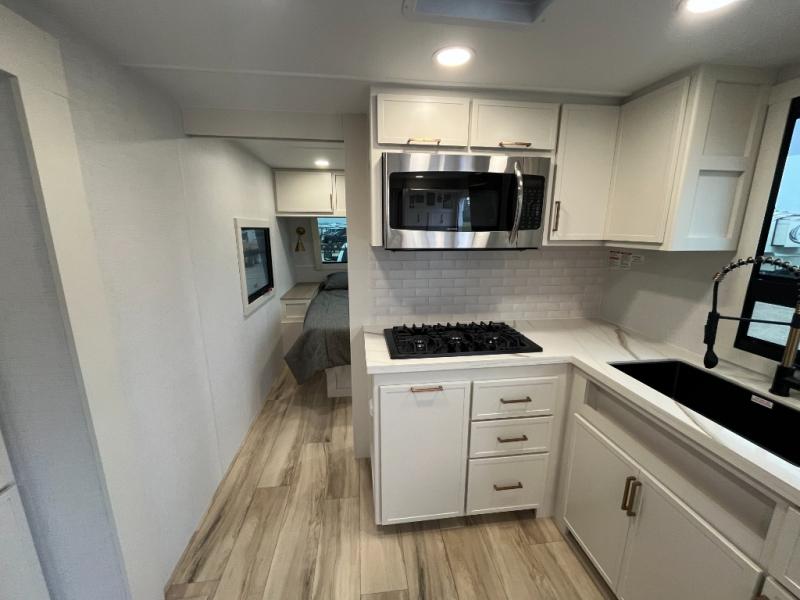 One look at this travel trailer and you'll be sold! The full rear bath features a spacious 42" x 30" shower with a built-in seat and Maxxair fan to name a few comforts. The front private bedroom features a 66" x 80" king bed with a MaxSpace Split-Level Wardrobe underneath to store shoes, clothes, and more! A slide out in the combined living area and kitchen makes your space more open, and you'll enjoy relaxing on the theater seating here in the evenings. The full kitchen includes a three burner stovetop, residential 30" convection microwave, 12 cu. ft. 12V refrigerator, plus a trash bin and Stow N' Go paper towel holder for added convenience. You can choose to eat outdoors under the 19' electric awning with LED lights or stay inside to dine at the pull-out dining table with a drawer for added storage! And if you're needing more sleeping space, just choose the optional tri-fold sofa in place of the theater seating!