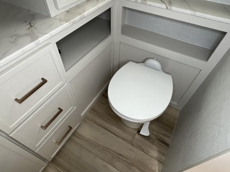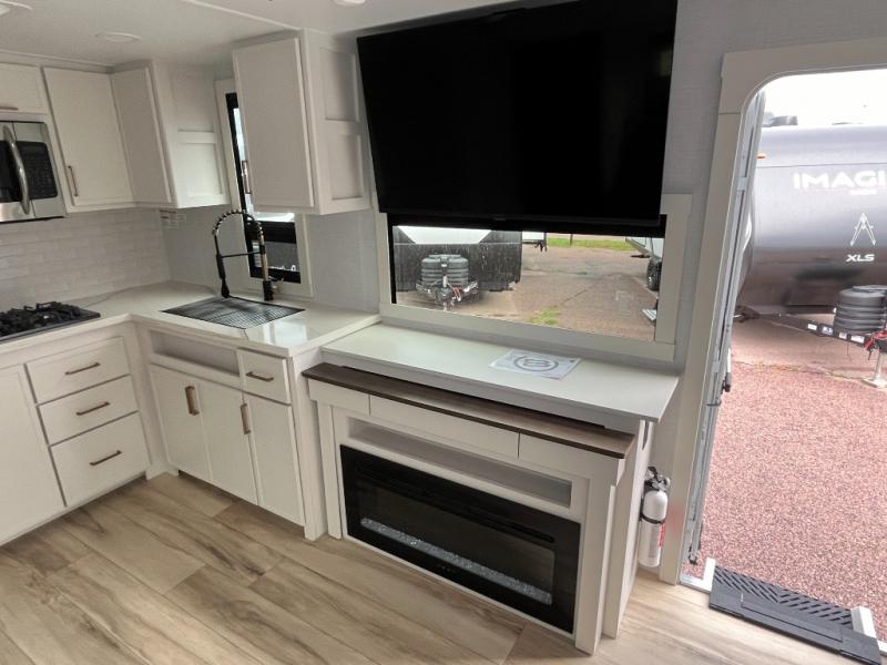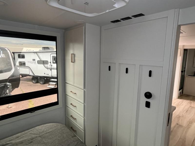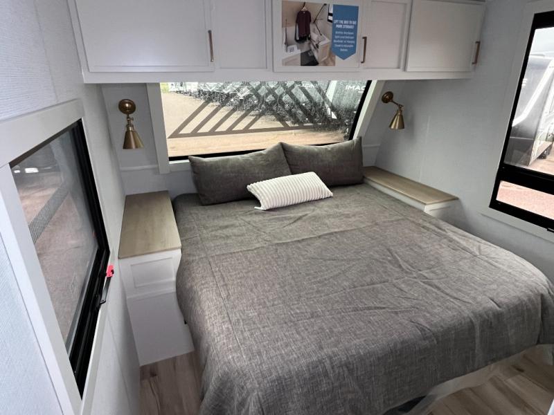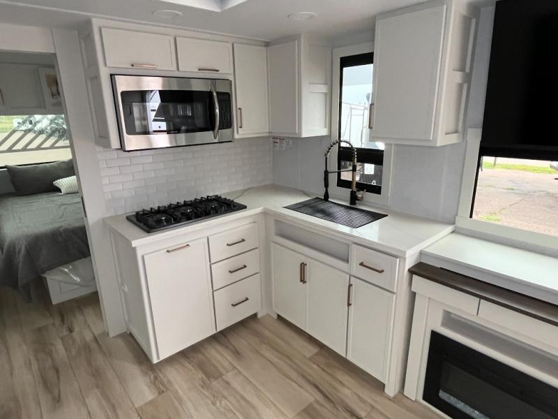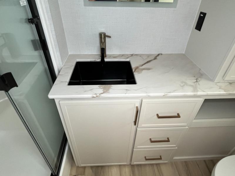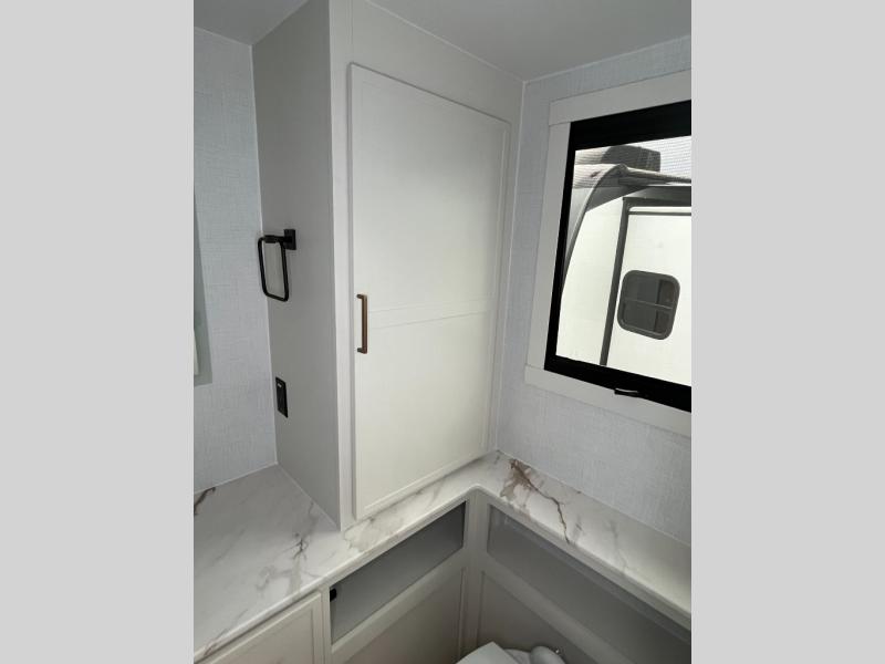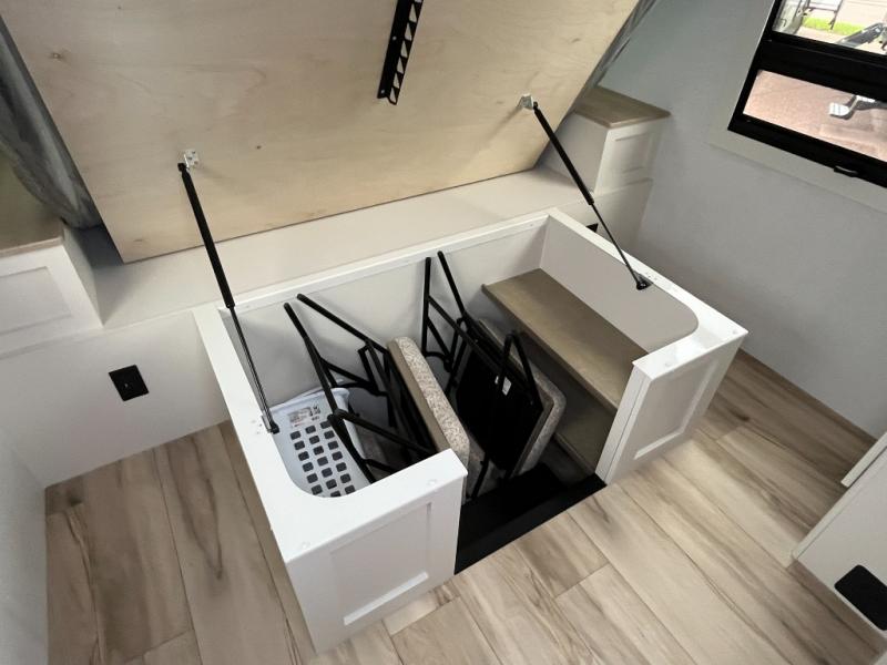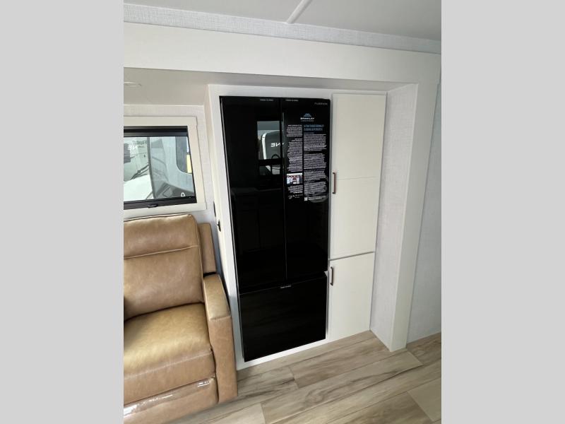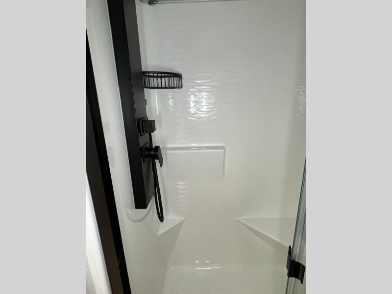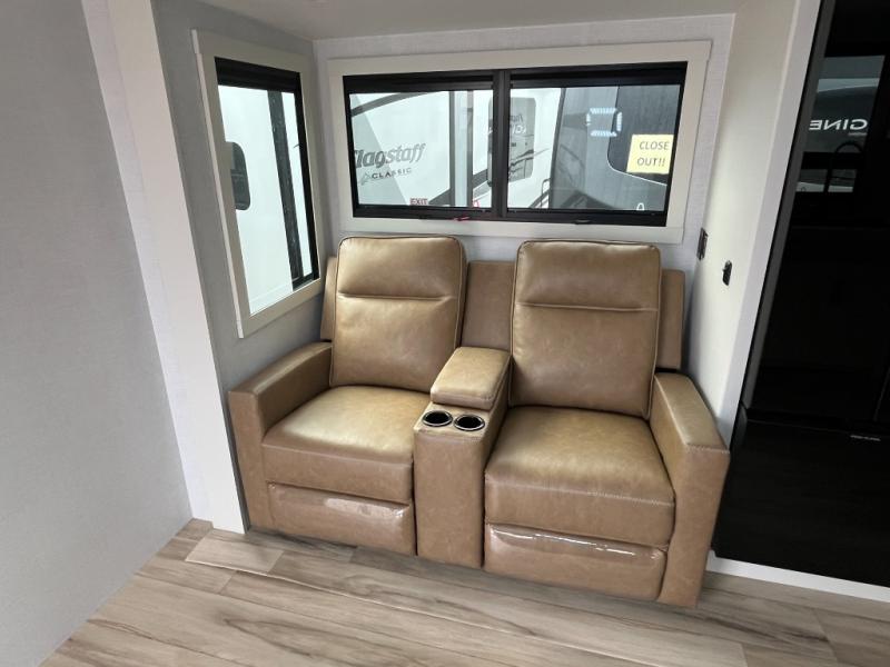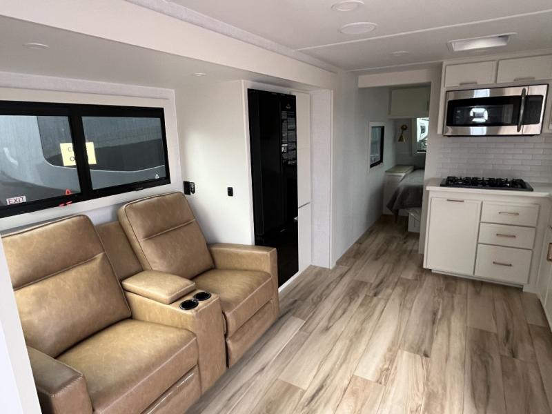 One look at this travel trailer and you'll be sold! The full rear bath features a spacious 42" x 30" shower with a built-in seat and Maxxair fan to name a few comforts. The front private bedroom features a 66" x 80" king bed with a MaxSpace Split-Level Wardrobe underneath to store shoes, clothes, and more! A slide out in the combined living area and kitchen makes your space more open, and you'll enjoy relaxing on the theater seating here in the evenings. The full kitchen includes a three burner stovetop, residential 30" convection microwave, 12 cu. ft. 12V refrigerator, plus a trash bin and Stow N' Go paper towel holder for added convenience. You can choose to eat outdoors under the 19' electric awning with LED lights or stay inside to dine at the pull-out dining table with a drawer for added storage! And if you're needing more sleeping space, just choose the optional tri-fold sofa in place of the theater seating!