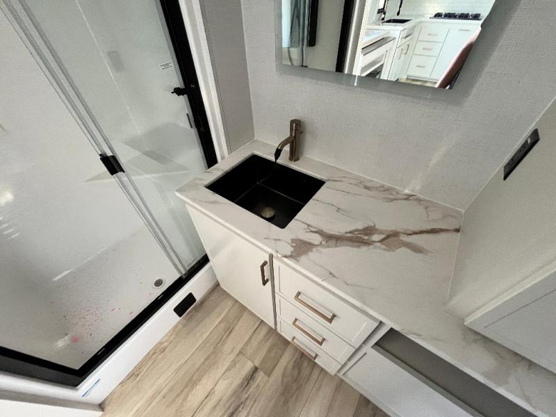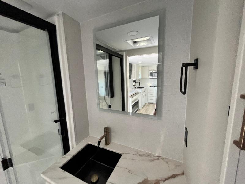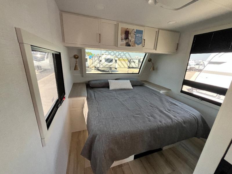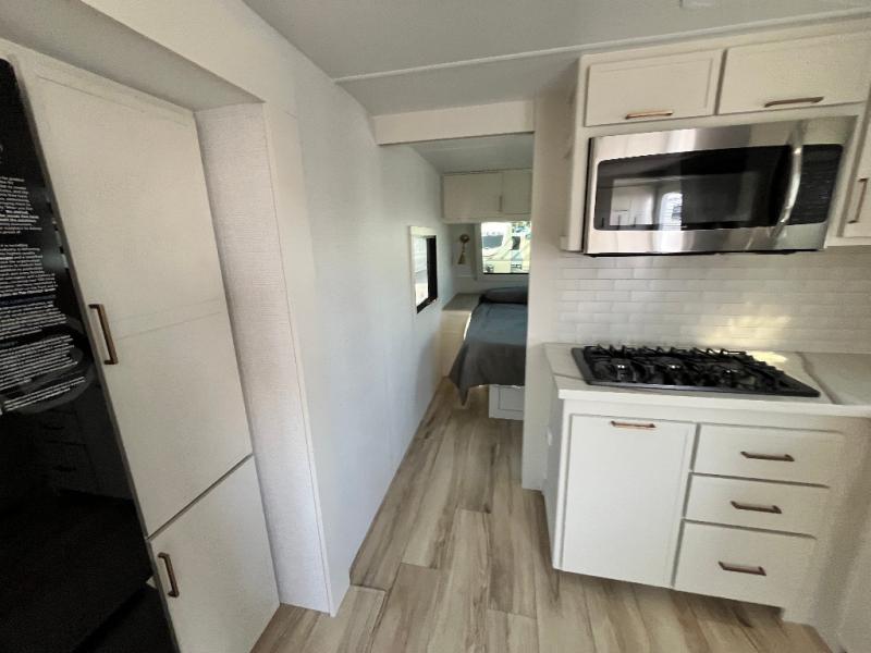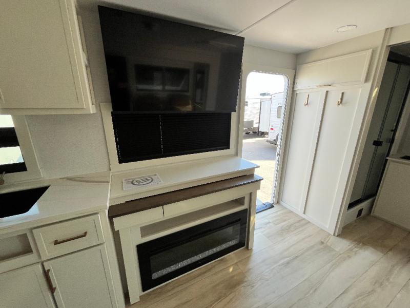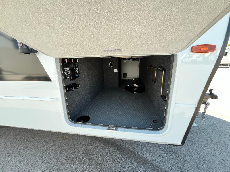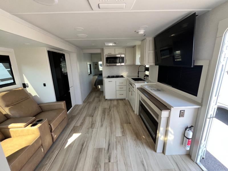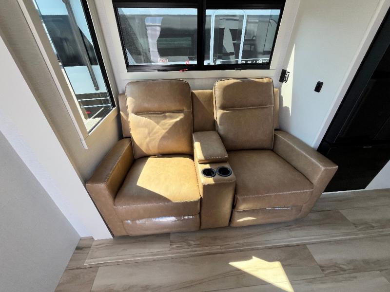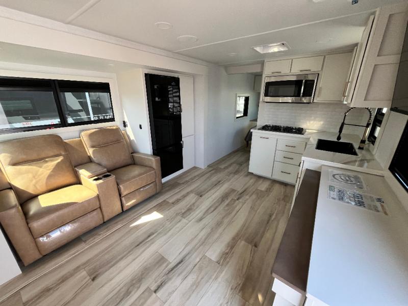 One look at this travel trailer and you'll be sold! The full rear bath features a spacious 42" x 30" shower with a built-in seat and Maxxair fan to name a few comforts. The front private bedroom features a 66" x 80" king bed with a MaxSpace Split-Level Wardrobe underneath to store shoes, clothes, and more! A slide out in the combined living area and kitchen makes your space more open, and you'll enjoy relaxing on the theater seating here in the evenings. The full kitchen includes a three burner stovetop, residential 30" convection microwave, 12 cu. ft. 12V refrigerator, plus a trash bin and Stow N' Go paper towel holder for added convenience. You can choose to eat outdoors under the 19' electric awning with LED lights or stay inside to dine at the pull-out dining table with a drawer for added storage! And if you're needing more sleeping space, just choose the optional tri-fold sofa in place of the theater seating!