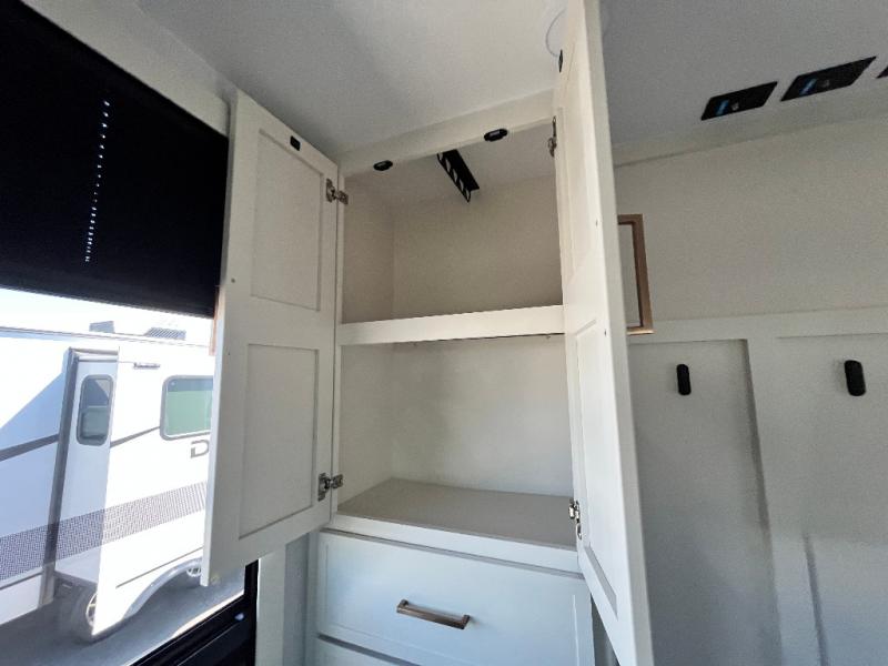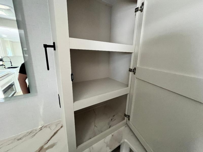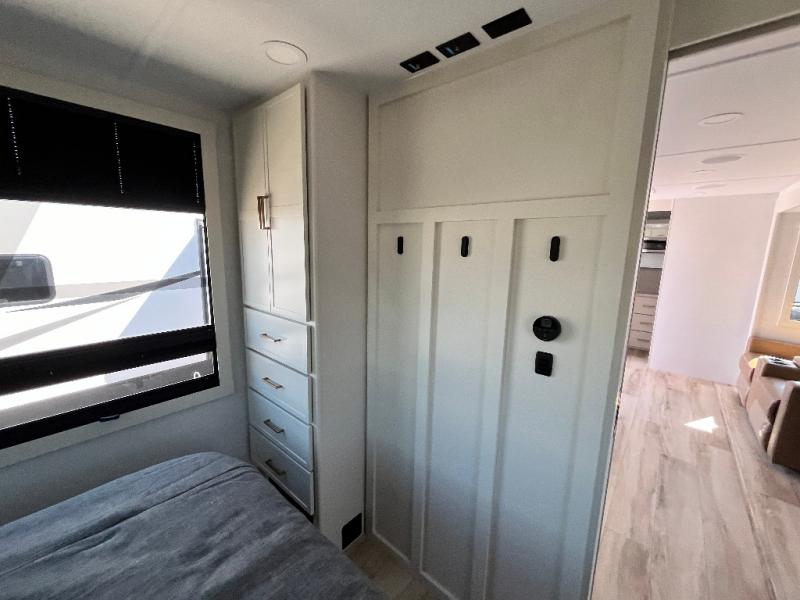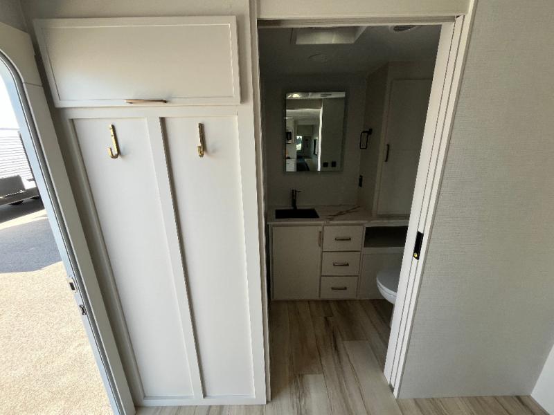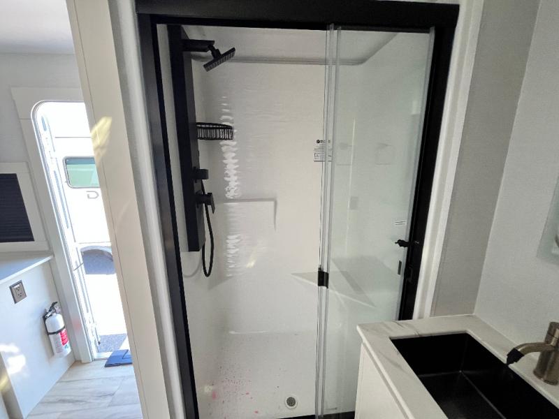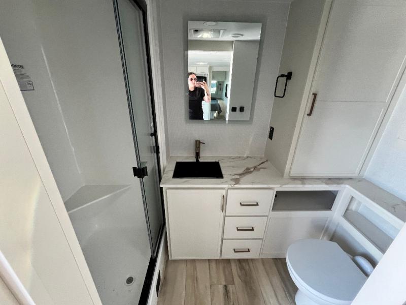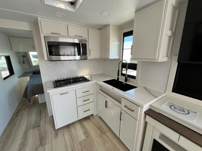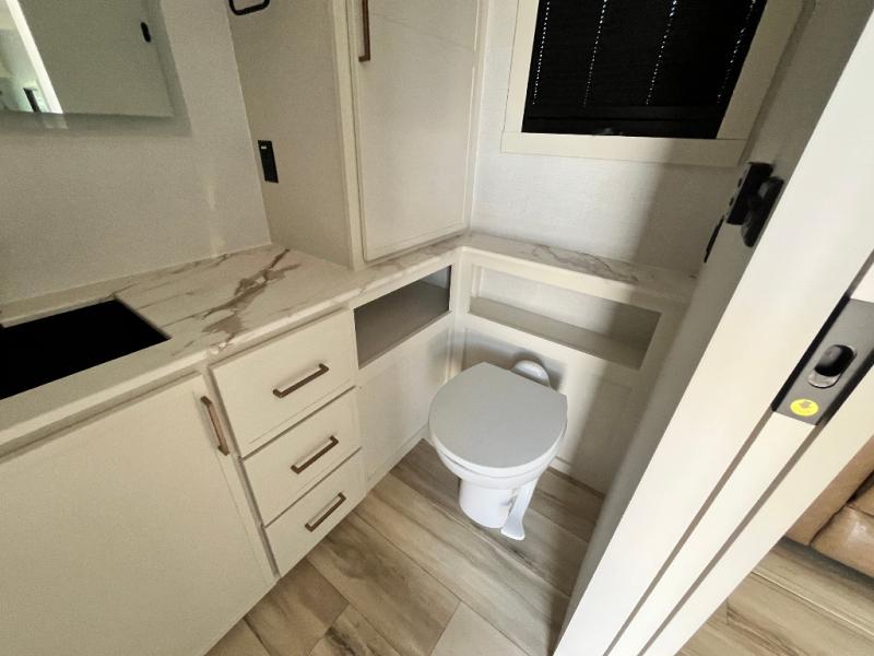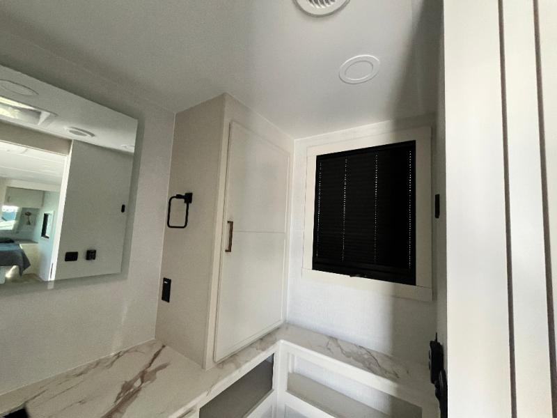 One look at this travel trailer and you'll be sold! The full rear bath features a spacious 42" x 30" shower with a built-in seat and Maxxair fan to name a few comforts. The front private bedroom features a 66" x 80" king bed with a MaxSpace Split-Level Wardrobe underneath to store shoes, clothes, and more! A slide out in the combined living area and kitchen makes your space more open, and you'll enjoy relaxing on the theater seating here in the evenings. The full kitchen includes a three burner stovetop, residential 30" convection microwave, 12 cu. ft. 12V refrigerator, plus a trash bin and Stow N' Go paper towel holder for added convenience. You can choose to eat outdoors under the 19' electric awning with LED lights or stay inside to dine at the pull-out dining table with a drawer for added storage! And if you're needing more sleeping space, just choose the optional tri-fold sofa in place of the theater seating!