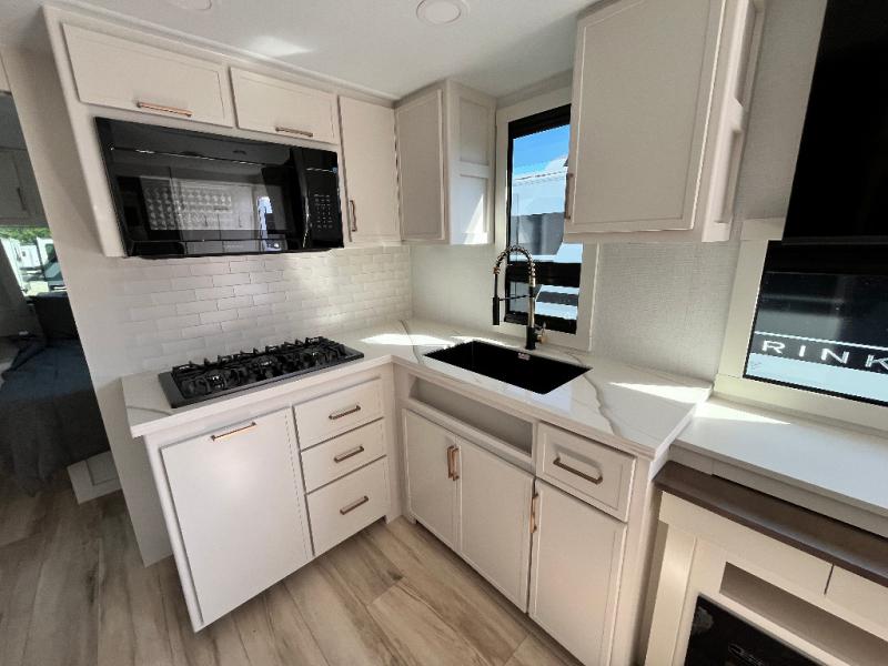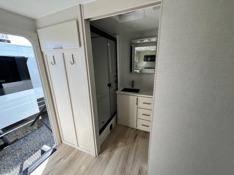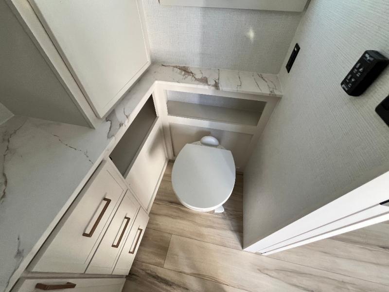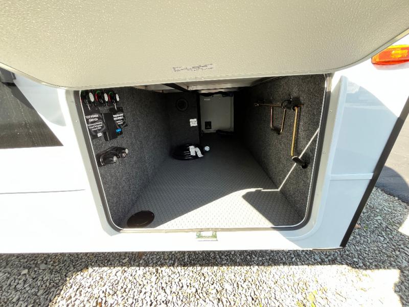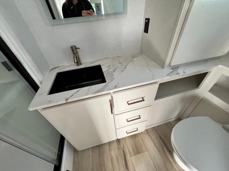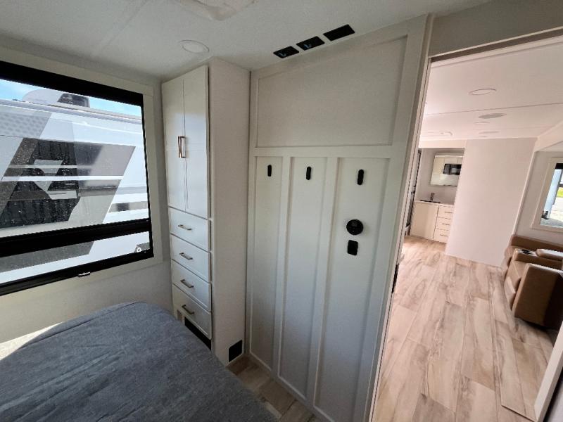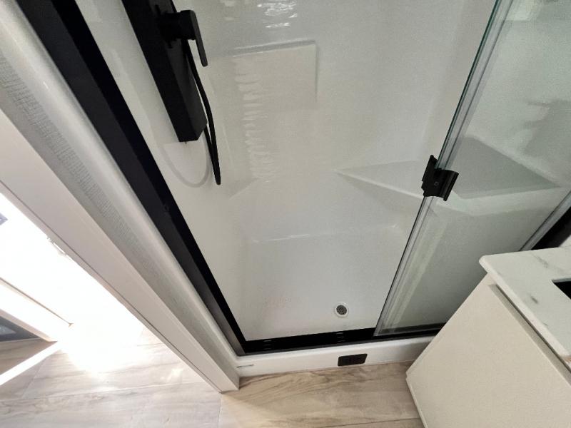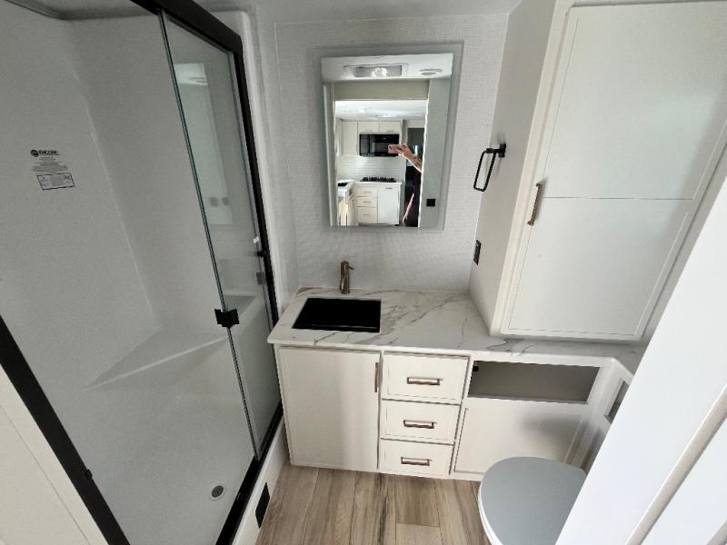 One look at this travel trailer and you'll be sold! The full rear bath features a spacious 42" x 30" shower with a built-in seat and Maxxair fan to name a few comforts. The front private bedroom features a 66" x 80" king bed with a MaxSpace Split-Level Wardrobe underneath to store shoes, clothes, and more! A slide out in the combined living area and kitchen makes your space more open, and you'll enjoy relaxing on the theater seating here in the evenings. The full kitchen includes a three burner stovetop, residential 30" convection microwave, 12 cu. ft. 12V refrigerator, plus a trash bin and Stow N' Go paper towel holder for added convenience. You can choose to eat outdoors under the 19' electric awning with LED lights or stay inside to dine at the pull-out dining table with a drawer for added storage! And if you're needing more sleeping space, just choose the optional tri-fold sofa in place of the theater seating!