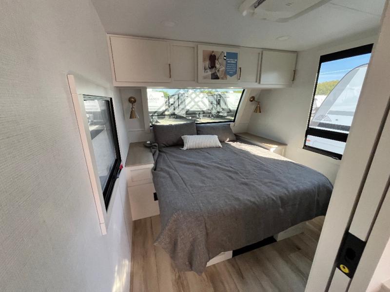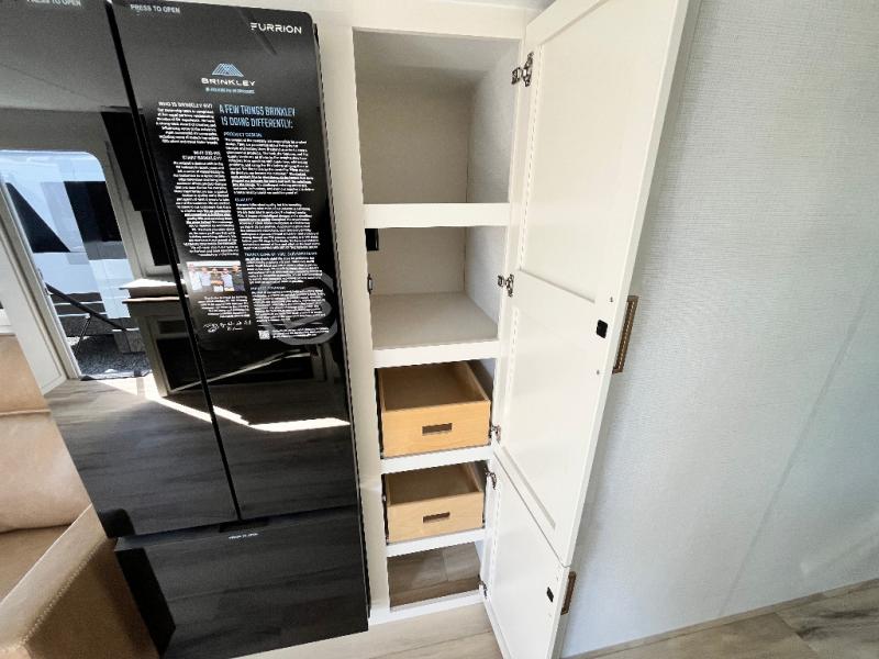 The lightweight Model I travel trailer by Brinkley is the perfect choice for those looking for an easy tow and at-home comforts! There is a drop-frame chassis, high-performance Road Armor suspension equalizer system, and Demco EZ Latch trailer coupler that automatically latches when dropped onto a hitch ball without the need of a safety pin. Additional exterior features include square Euro frameless windows, automotive-grade paint, full-width LED strip lighting in the pass-thru, and a pet & property security campside tie-down to keep your gear and furry friends safe. Inside, you'll be wowed by Brinkley's CraftSense wood trim construction, residential solid surface kitchen countertops, dimmable bedroom lights, and marine-grade neon LED shower lighting to name a few stand-out features!
