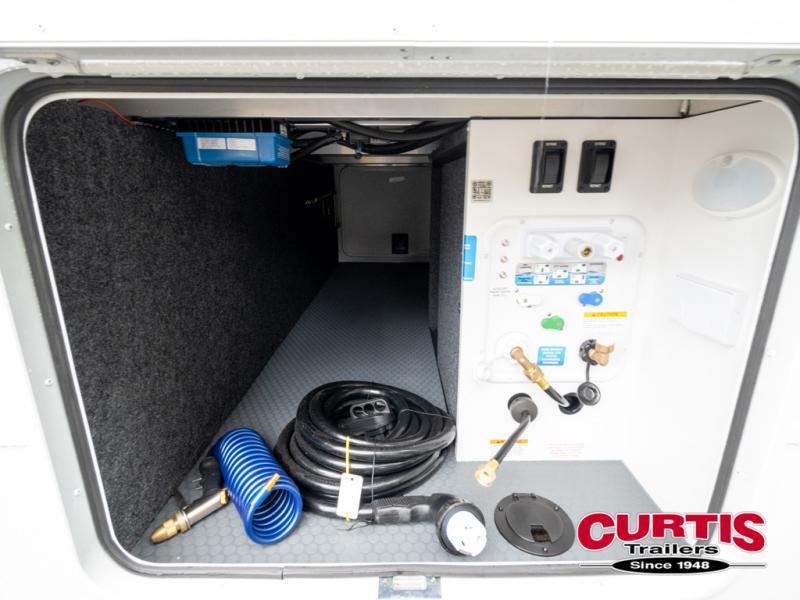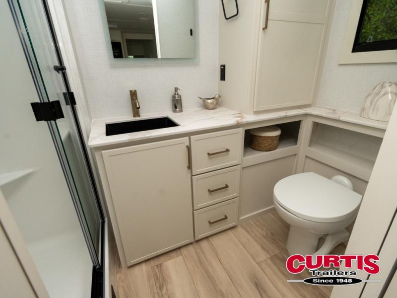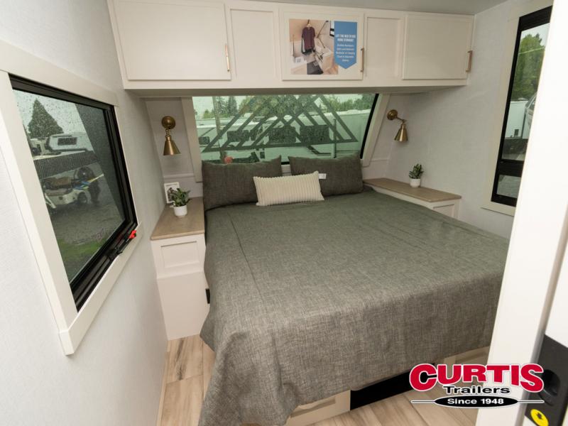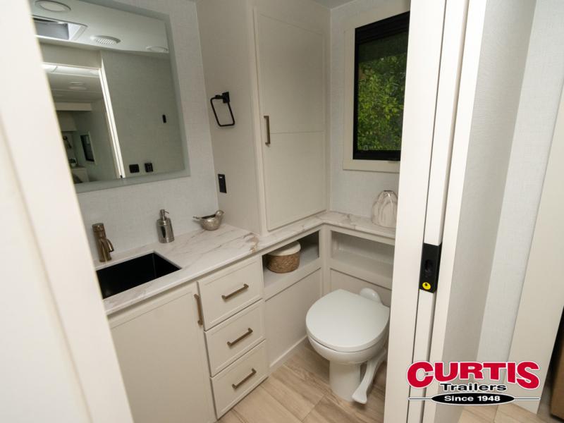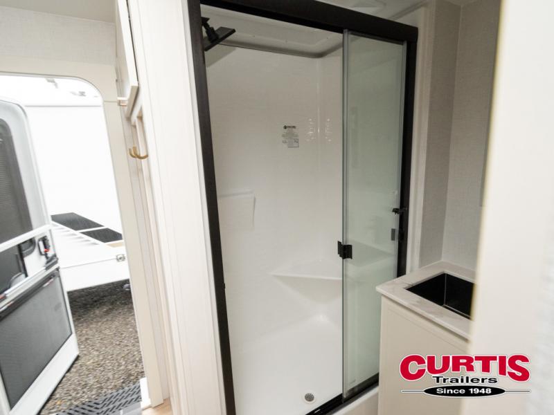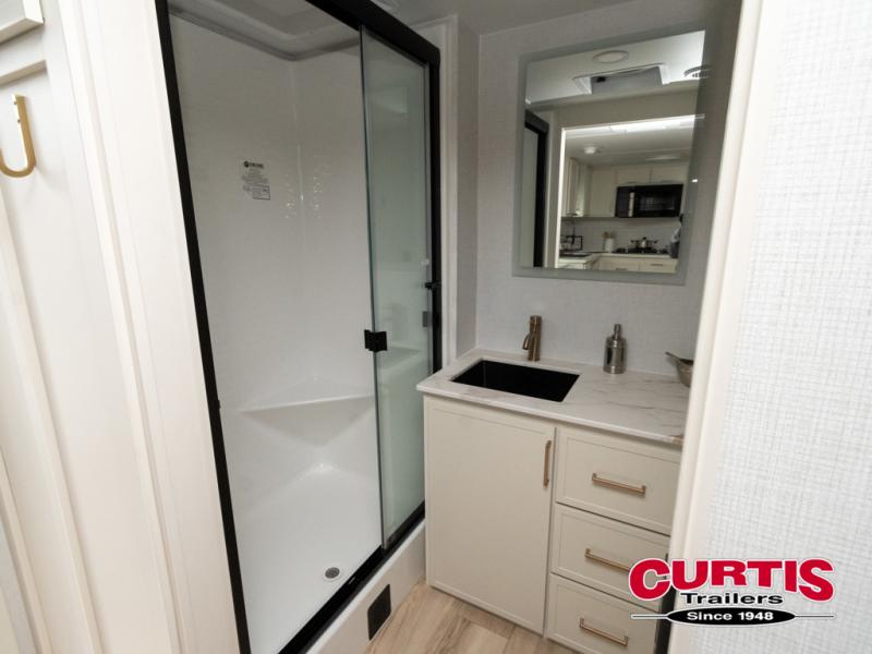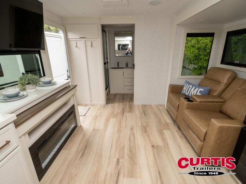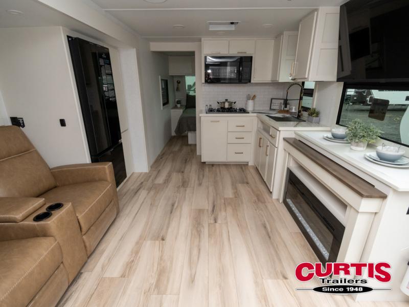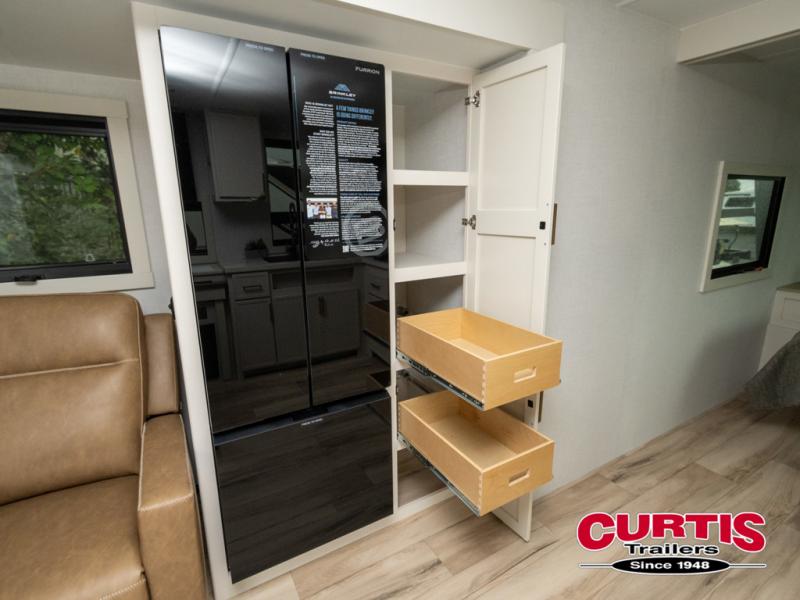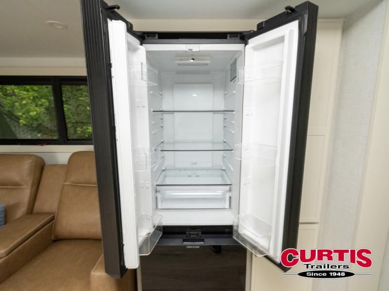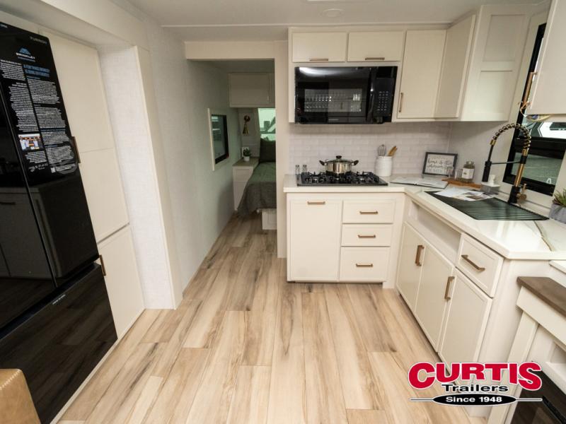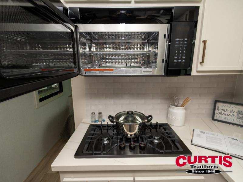 One look at this travel trailer and you'll be sold! The full rear bath features a spacious 42" x 30" shower with a built-in seat and Maxxair fan to name a few comforts. The front private bedroom features a 66" x 80" king bed with a MaxSpace Split-Level Wardrobe underneath to store shoes, clothes, and more! A slide out in the combined living area and kitchen makes your space more open, and you'll enjoy relaxing on the theater seating here in the evenings. The full kitchen includes a three burner stovetop, residential 30" convection microwave, 12 cu. ft. 12V refrigerator, plus a trash bin and Stow N' Go paper towel holder for added convenience. You can choose to eat outdoors under the 19' electric awning with LED lights or stay inside to dine at the pull-out dining table with a drawer for added storage! And if you're needing more sleeping space, just choose the optional tri-fold sofa in place of the theater seating!