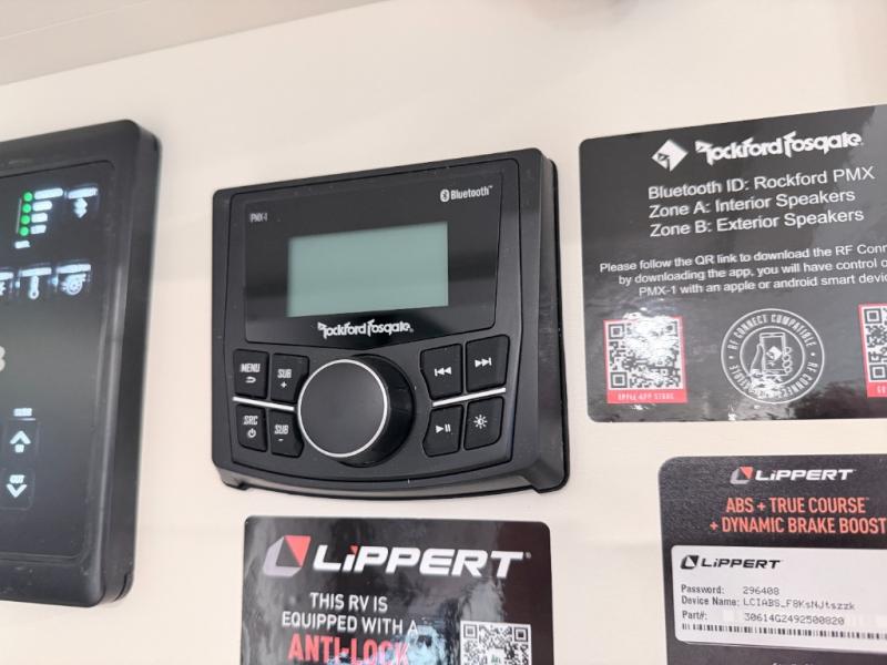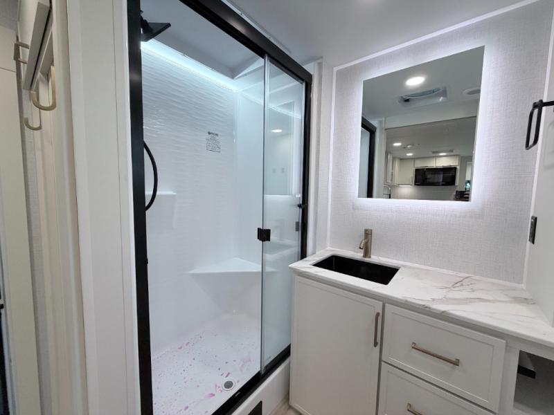 - Full rear bathroom with 42" x 30" shower, built-in seat, and Maxxair fan