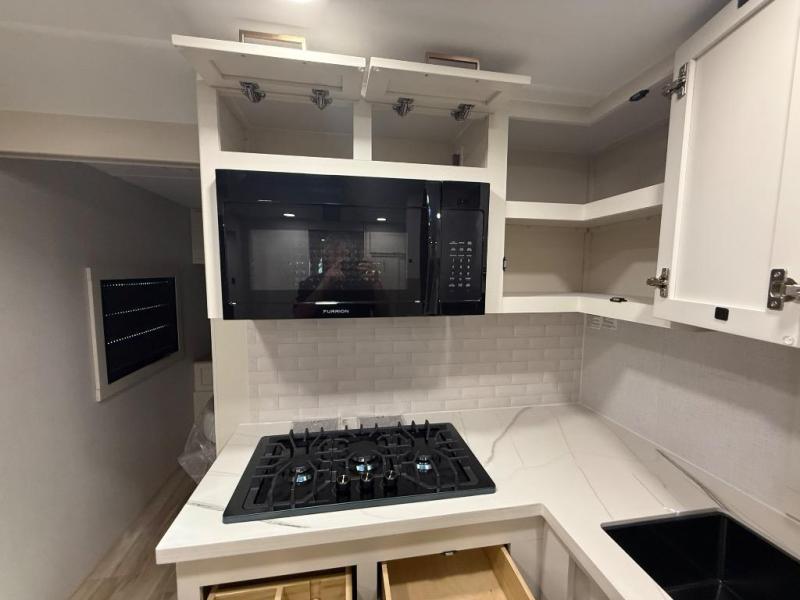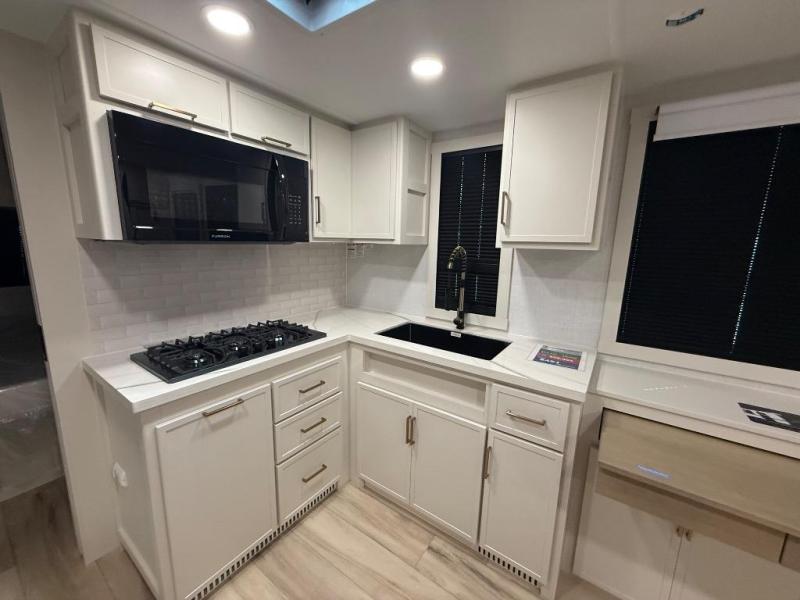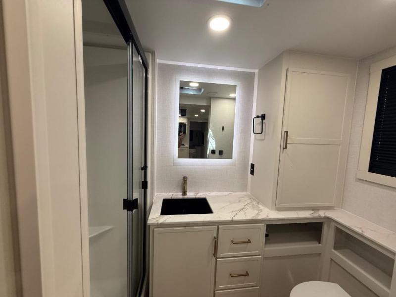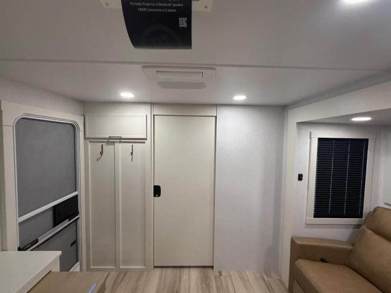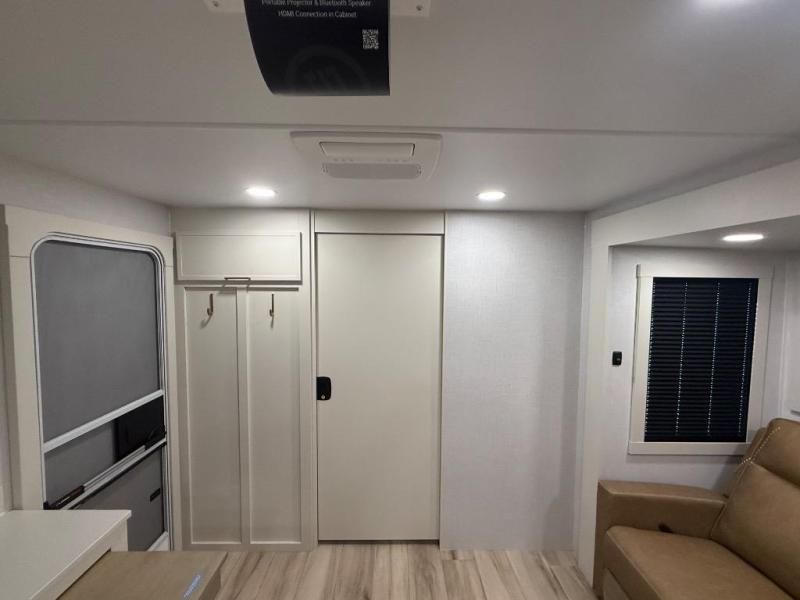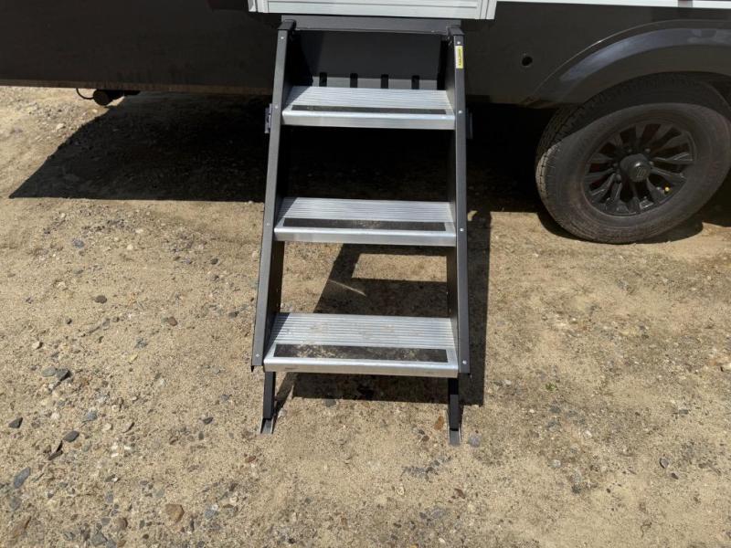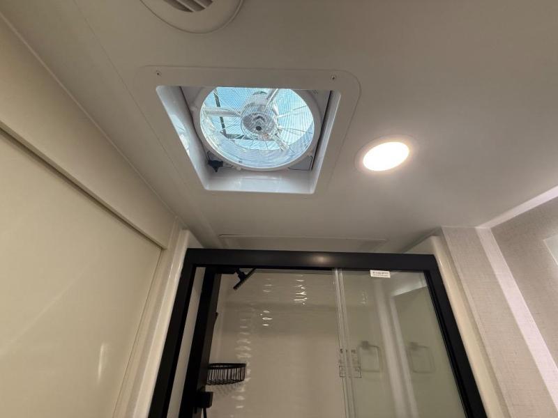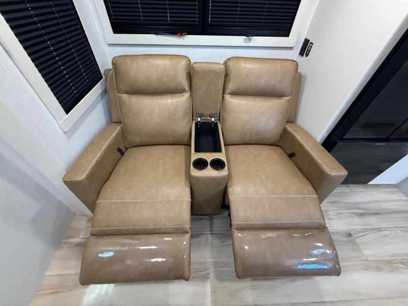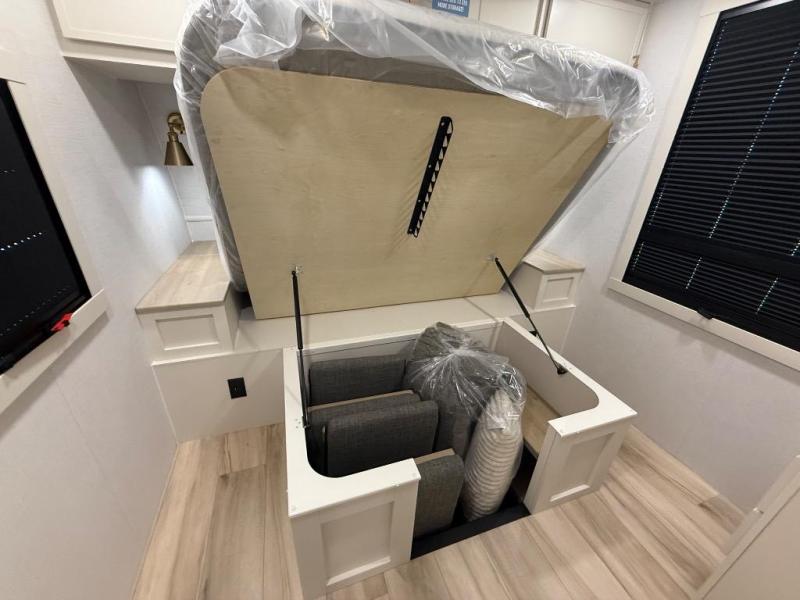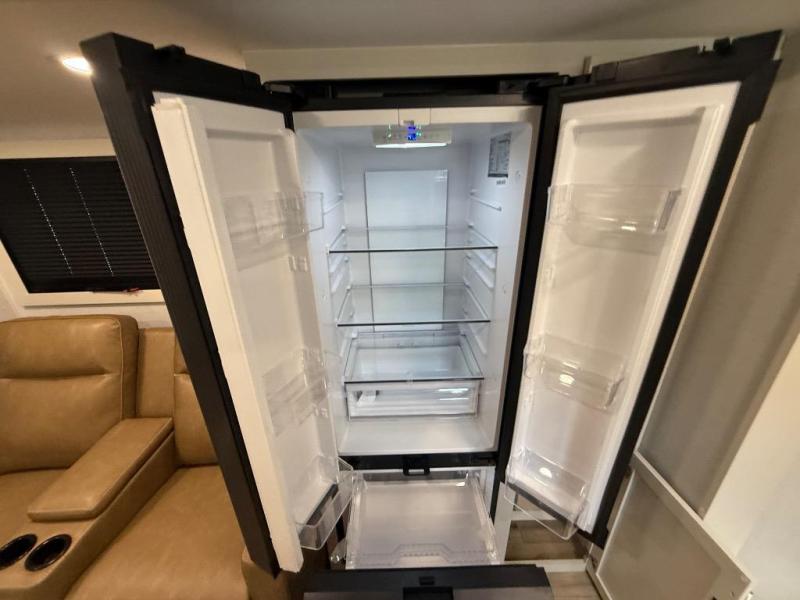 One look at this travel trailer and you'll be sold! The full rear bath features a spacious 42" x 30" shower with a built-in seat and Maxxair fan to name a few comforts. The front private bedroom features a 66" x 80" king bed with a MaxSpace Split-Level Wardrobe underneath to store shoes, clothes, and more! A slide out in the combined living area and kitchen makes your space more open, and you'll enjoy relaxing on the theater seating here in the evenings. The full kitchen includes a three burner stovetop, residential 30" convection microwave, 12 cu. ft. 12V refrigerator, plus a trash bin and Stow N' Go paper towel holder for added convenience. You can choose to eat outdoors under the 19' electric awning with LED lights or stay inside to dine at the pull-out dining table with a drawer for added storage! And if you're needing more sleeping space, just choose the optional tri-fold sofa in place of the theater seating!