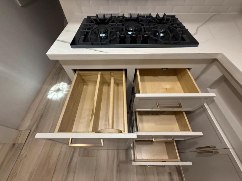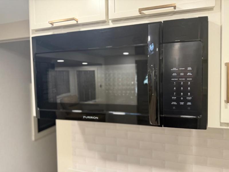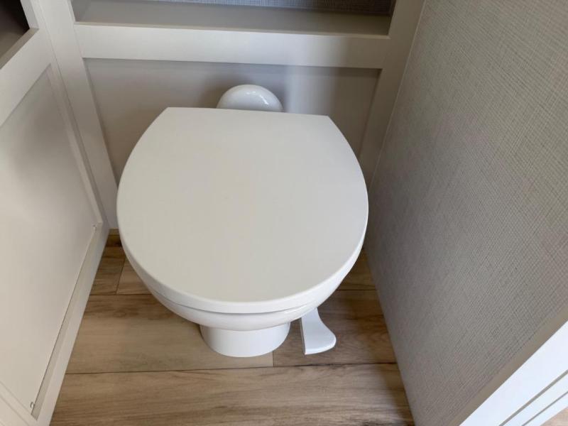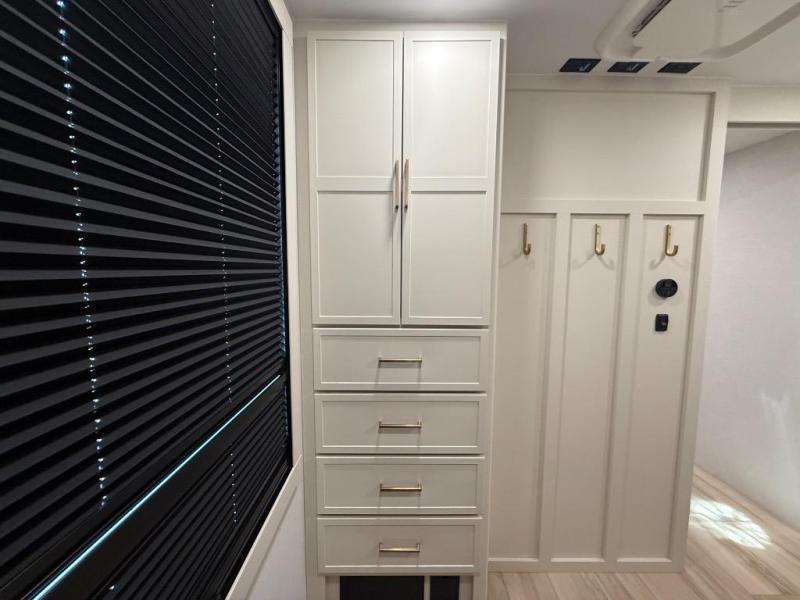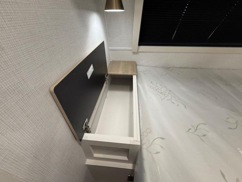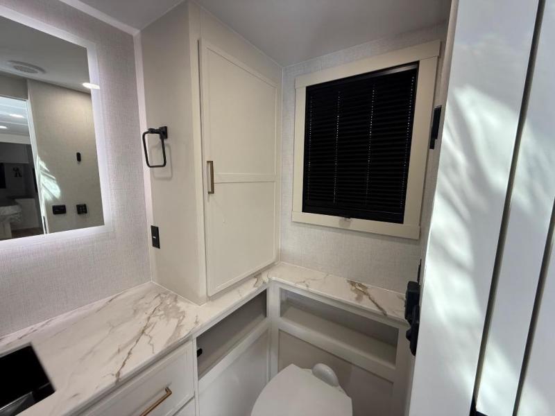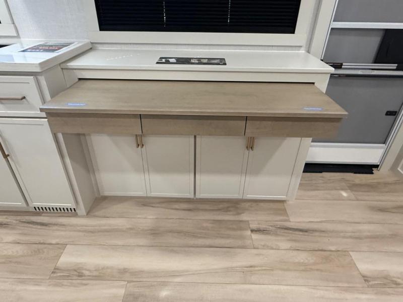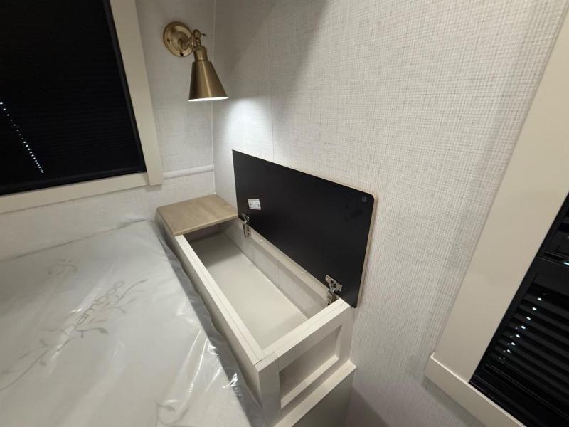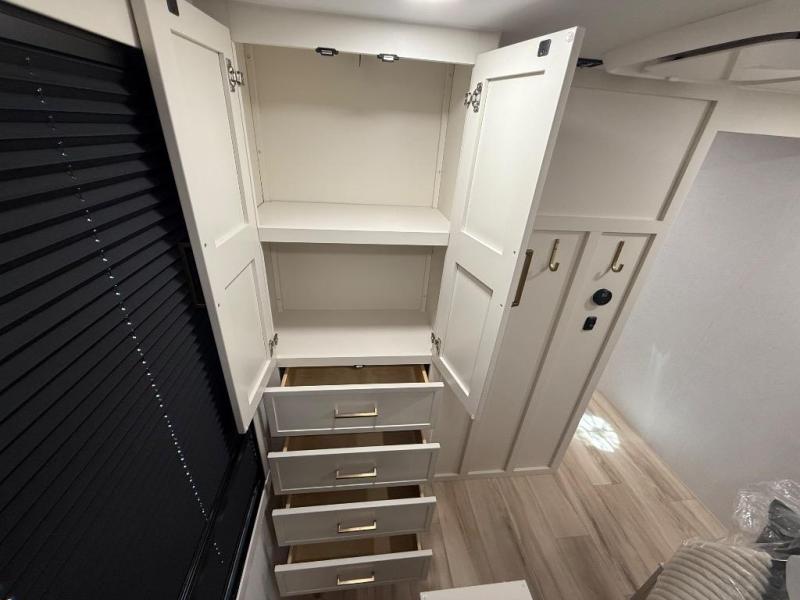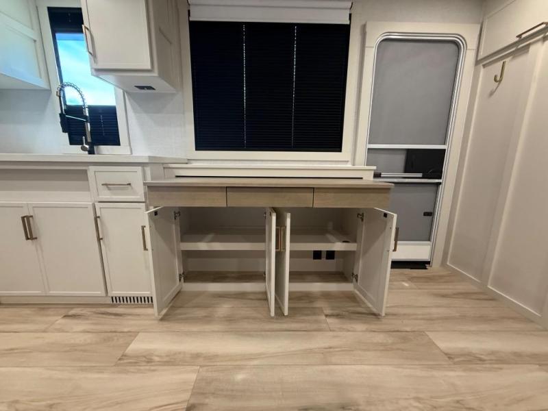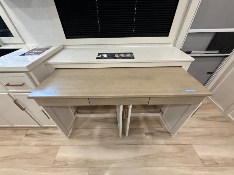 One look at this travel trailer and you'll be sold! The full rear bath features a spacious 42" x 30" shower with a built-in seat and Maxxair fan to name a few comforts. The front private bedroom features a 66" x 80" king bed with a MaxSpace Split-Level Wardrobe underneath to store shoes, clothes, and more! A slide out in the combined living area and kitchen makes your space more open, and you'll enjoy relaxing on the theater seating here in the evenings. The full kitchen includes a three burner stovetop, residential 30" convection microwave, 12 cu. ft. 12V refrigerator, plus a trash bin and Stow N' Go paper towel holder for added convenience. You can choose to eat outdoors under the 19' electric awning with LED lights or stay inside to dine at the pull-out dining table with a drawer for added storage! And if you're needing more sleeping space, just choose the optional tri-fold sofa in place of the theater seating!