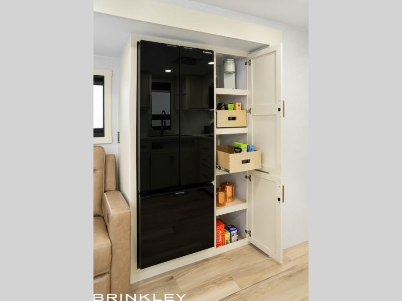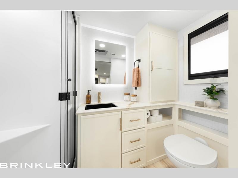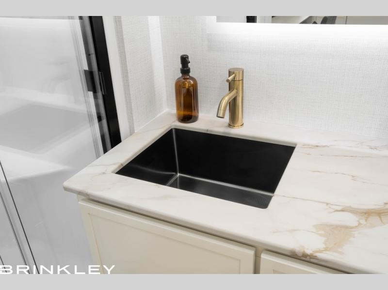The lightweight Model I travel trailer by Brinkley is the perfect choice for those looking for an easy tow and at-home comforts! There is a drop-frame chassis, high-performance Road Armor suspension equalizer system, and Demco EZ Latch trailer coupler that automatically latches when dropped onto a hitch ball without the need of a safety pin. Additional exterior features include square Euro frameless windows, automotive-grade paint, full-width LED strip lighting in the pass-thru, and a pet & property security campside tie-down to keep your gear and furry friends safe. Inside, you'll be wowed by Brinkley's CraftSense wood trim construction, residential solid surface kitchen countertops, dimmable bedroom lights, and marine-grade neon LED shower lighting to name a few stand-out features!