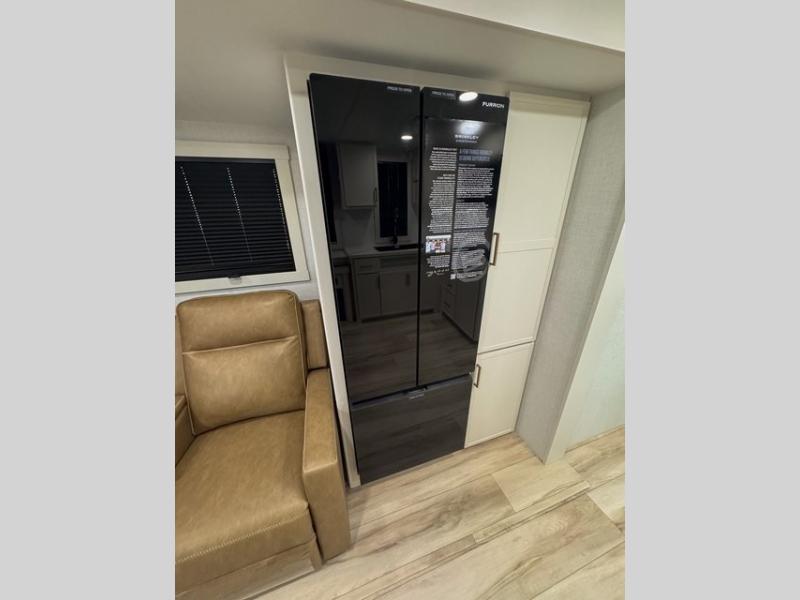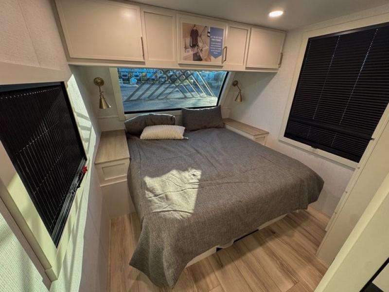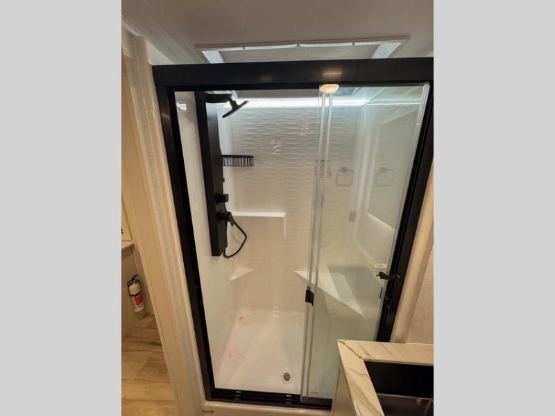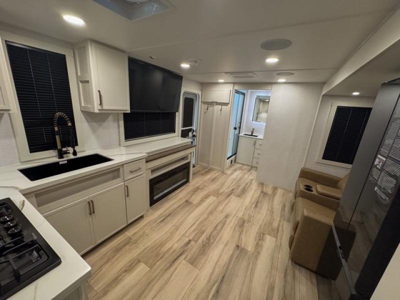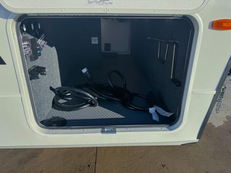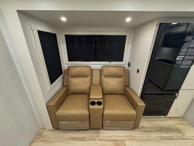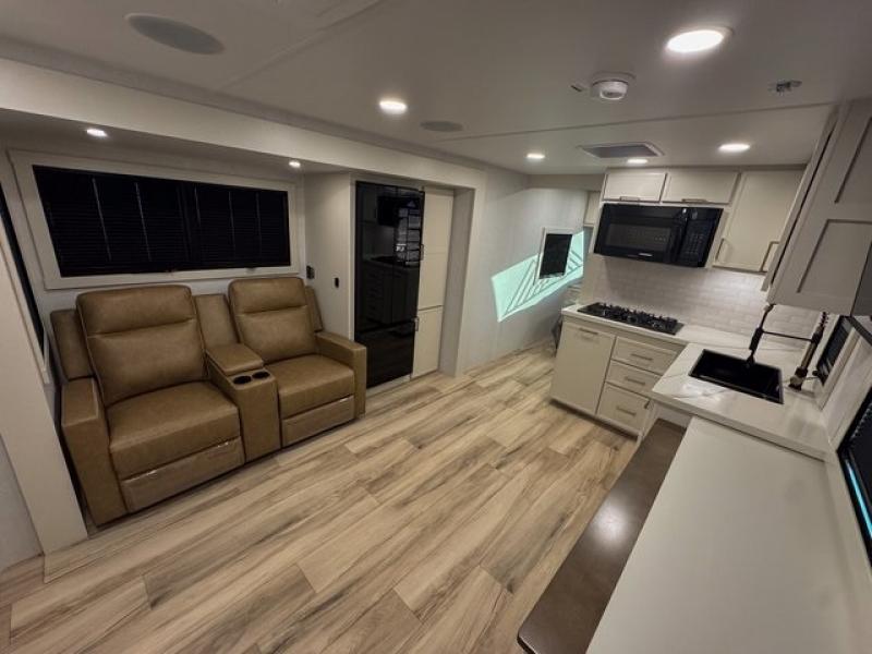 One look at this travel trailer and you'll be sold! The full rear bath features a spacious 42" x 30" shower with a built-in seat and Maxxair fan to name a few comforts. The front private bedroom features a 66" x 80" king bed with a MaxSpace Split-Level Wardrobe underneath to store shoes, clothes, and more! A slide out in the combined living area and kitchen makes your space more open, and you'll enjoy relaxing on the theater seating here in the evenings. The full kitchen includes a three burner stovetop, residential 30" convection microwave, 12 cu. ft. 12V refrigerator, plus a trash bin and Stow N' Go paper towel holder for added convenience. You can choose to eat outdoors under the 19' electric awning with LED lights or stay inside to dine at the pull-out dining table with a drawer for added storage! And if you're needing more sleeping space, just choose the optional tri-fold sofa in place of the theater seating!