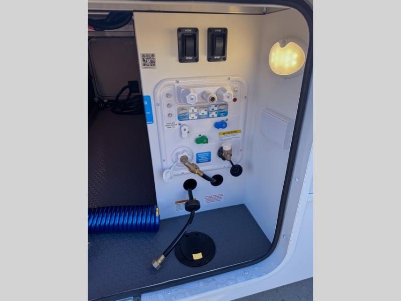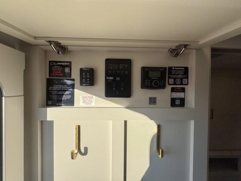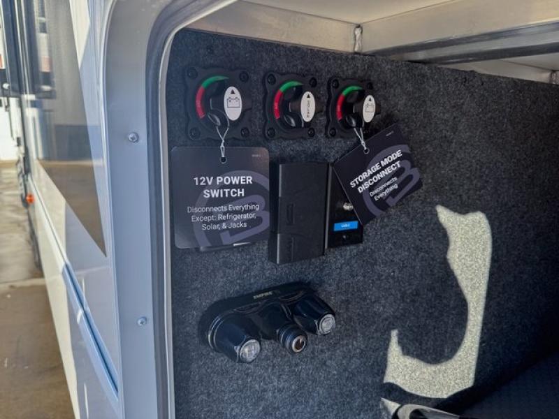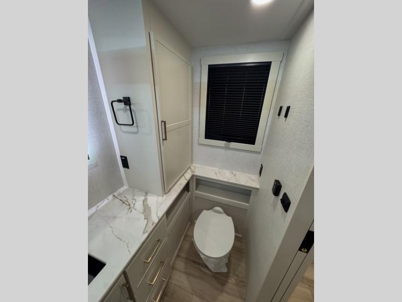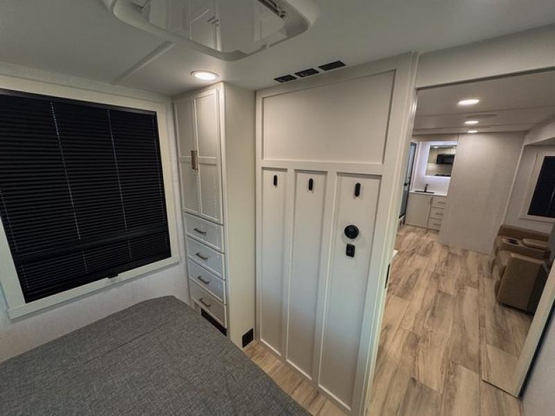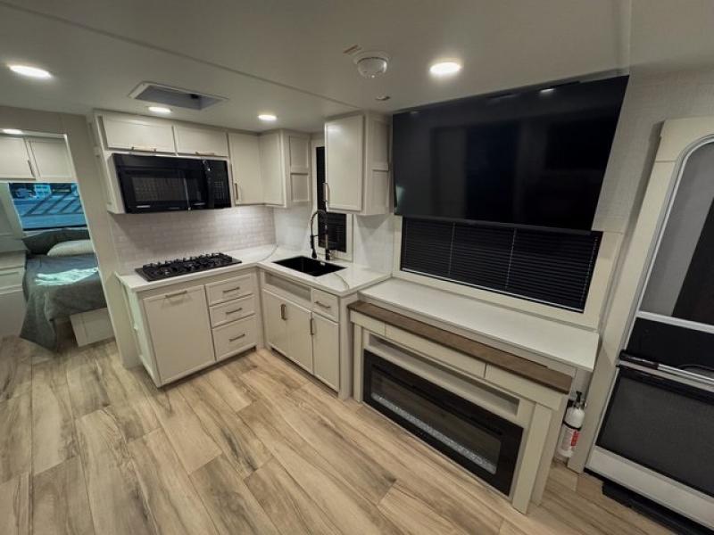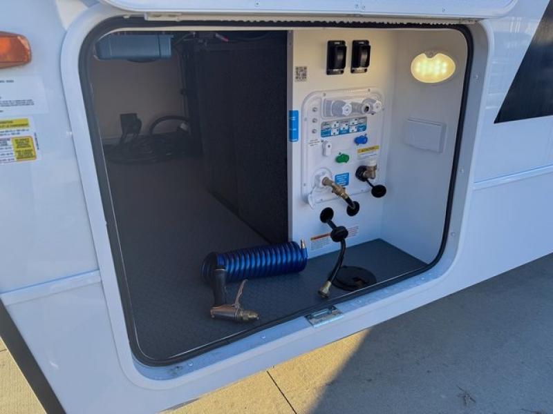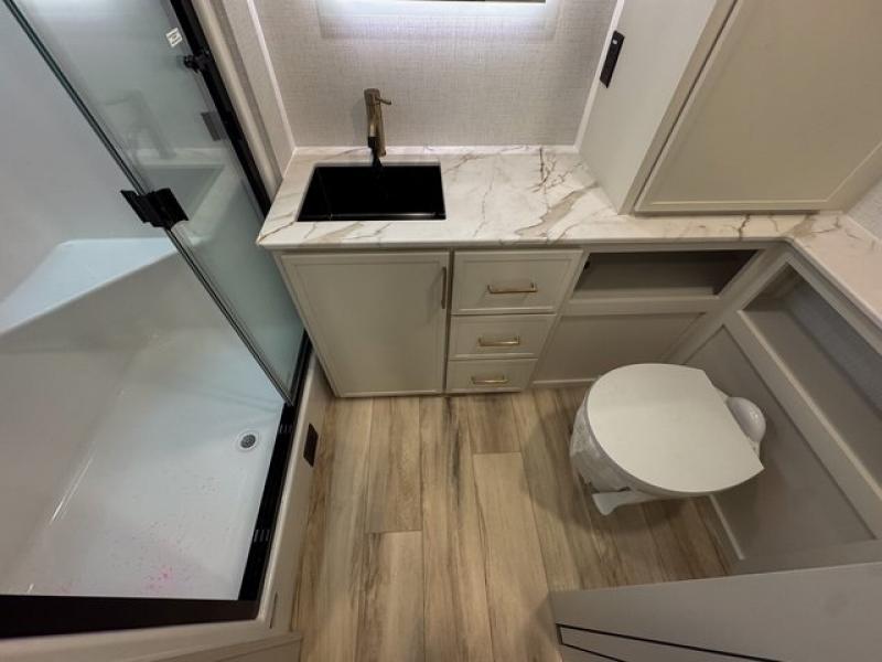 One look at this travel trailer and you'll be sold! The full rear bath features a spacious 42" x 30" shower with a built-in seat and Maxxair fan to name a few comforts. The front private bedroom features a 66" x 80" king bed with a MaxSpace Split-Level Wardrobe underneath to store shoes, clothes, and more! A slide out in the combined living area and kitchen makes your space more open, and you'll enjoy relaxing on the theater seating here in the evenings. The full kitchen includes a three burner stovetop, residential 30" convection microwave, 12 cu. ft. 12V refrigerator, plus a trash bin and Stow N' Go paper towel holder for added convenience. You can choose to eat outdoors under the 19' electric awning with LED lights or stay inside to dine at the pull-out dining table with a drawer for added storage! And if you're needing more sleeping space, just choose the optional tri-fold sofa in place of the theater seating!