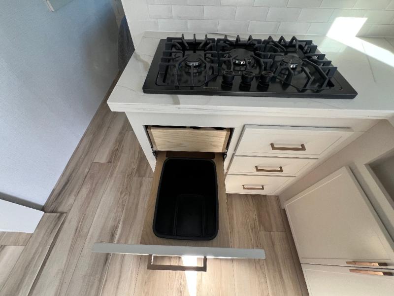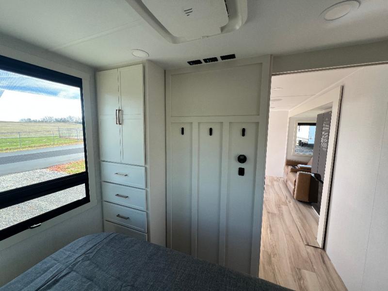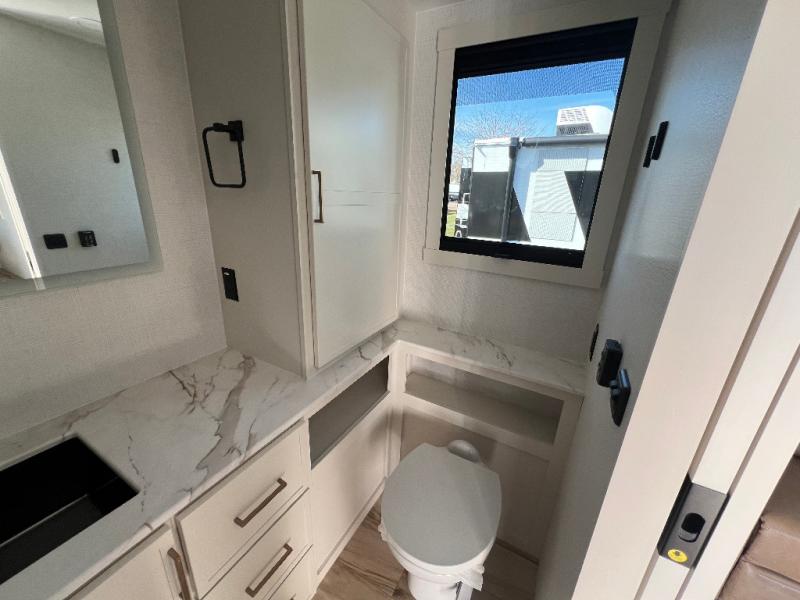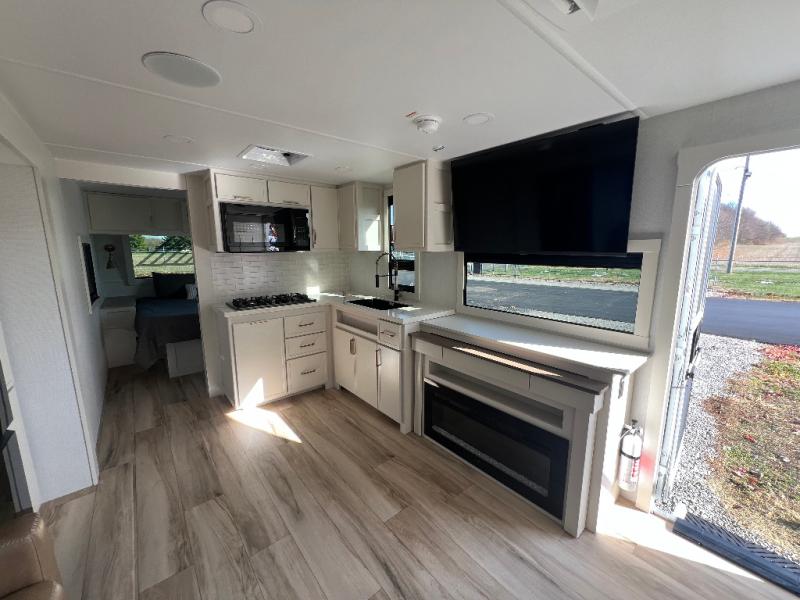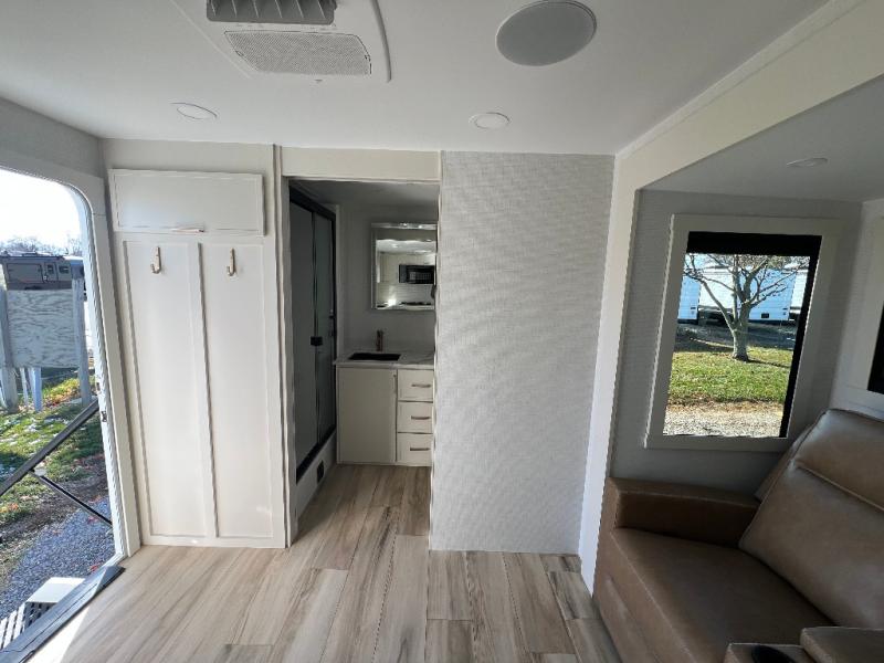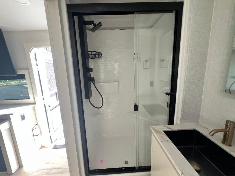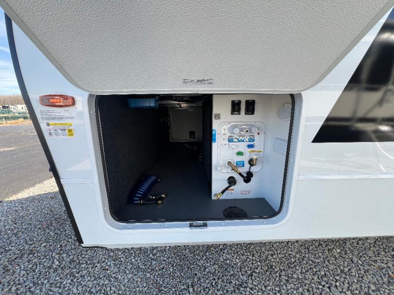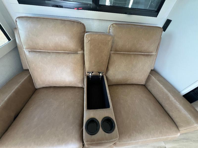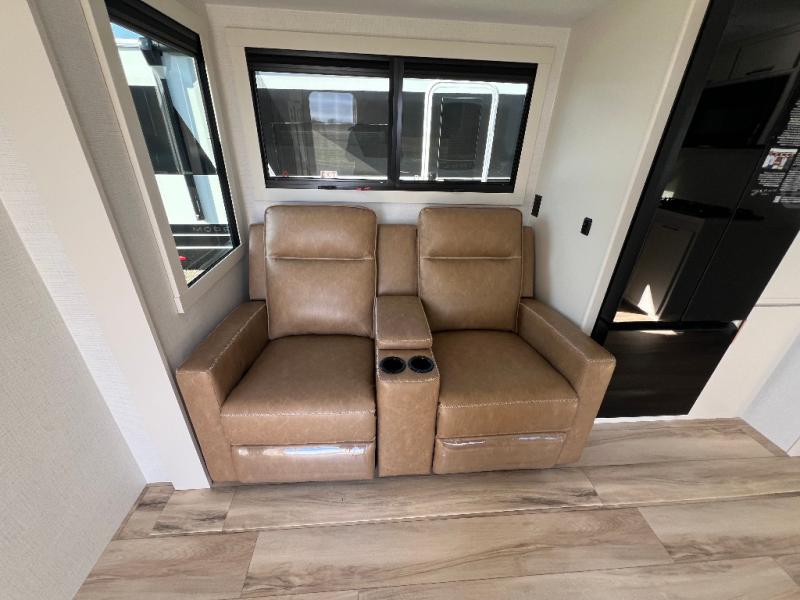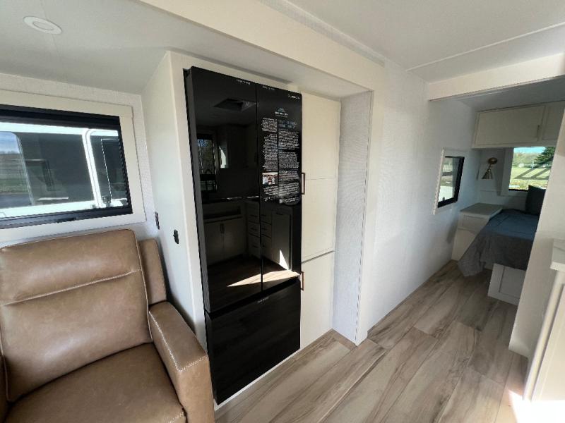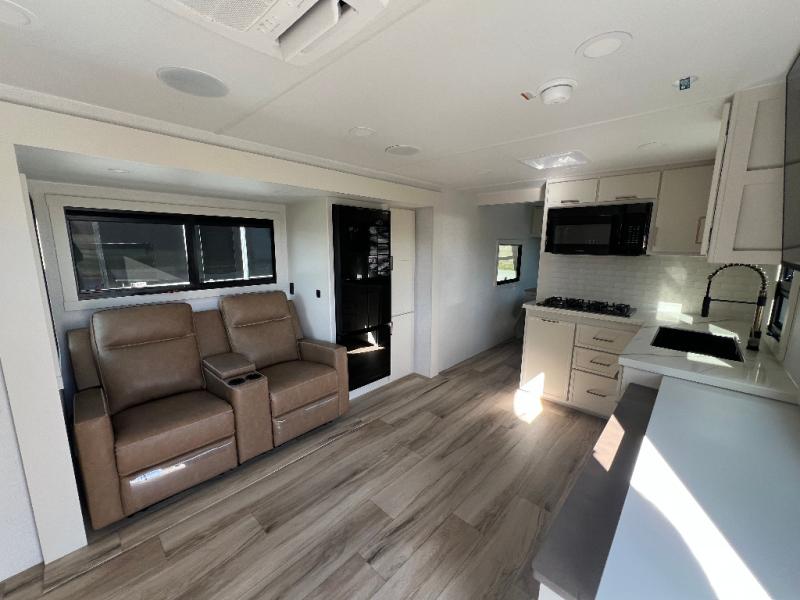 One look at this travel trailer and you'll be sold! The full rear bath features a spacious 42" x 30" shower with a built-in seat and Maxxair fan to name a few comforts. The front private bedroom features a 66" x 80" king bed with a MaxSpace Split-Level Wardrobe underneath to store shoes, clothes, and more! A slide out in the combined living area and kitchen makes your space more open, and you'll enjoy relaxing on the theater seating here in the evenings. The full kitchen includes a three burner stovetop, residential 30" convection microwave, 12 cu. ft. 12V refrigerator, plus a trash bin and Stow N' Go paper towel holder for added convenience. You can choose to eat outdoors under the 19' electric awning with LED lights or stay inside to dine at the pull-out dining table with a drawer for added storage! And if you're needing more sleeping space, just choose the optional tri-fold sofa in place of the theater seating!