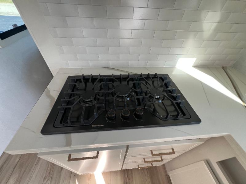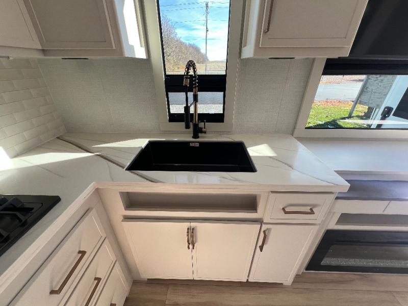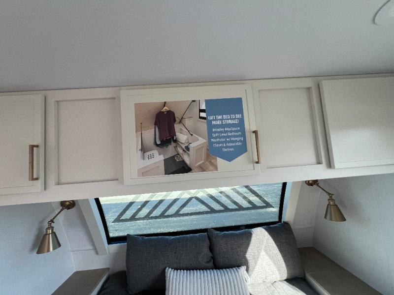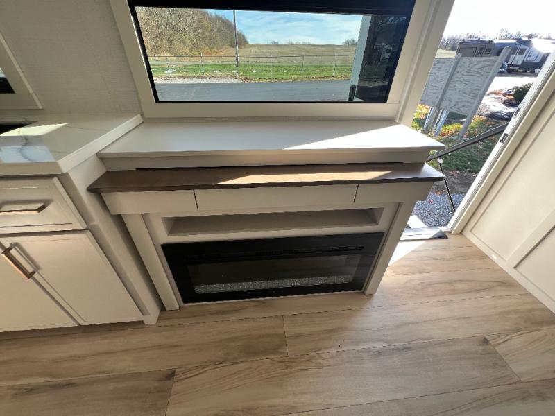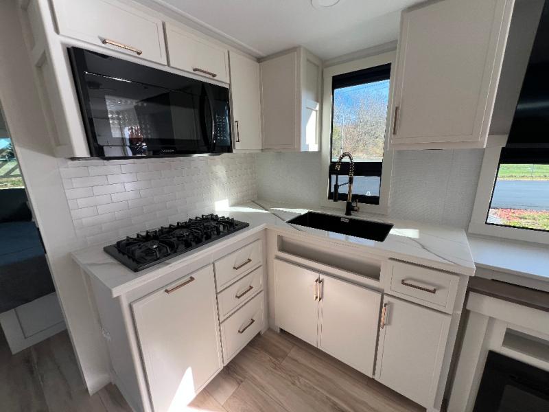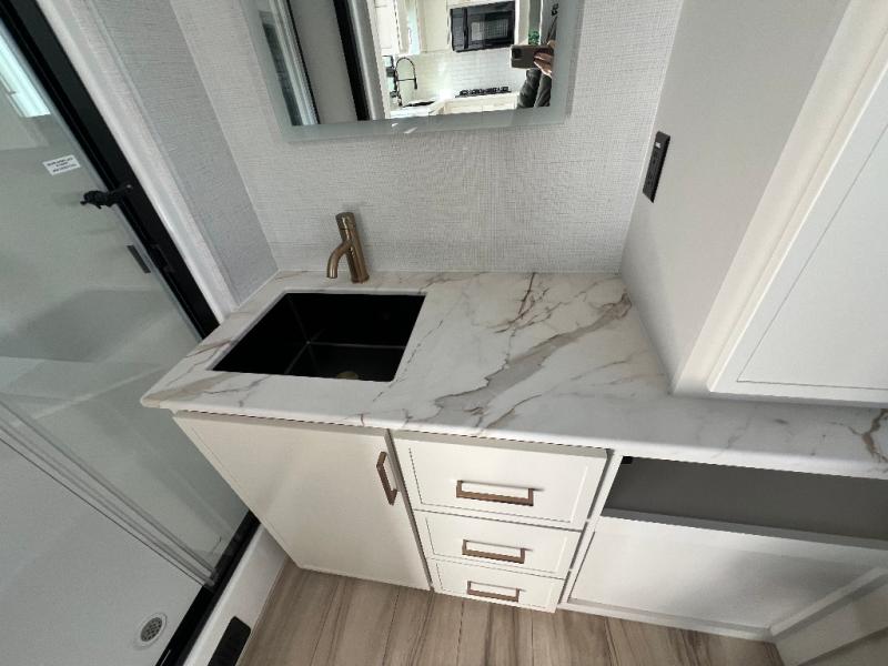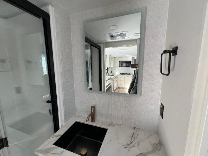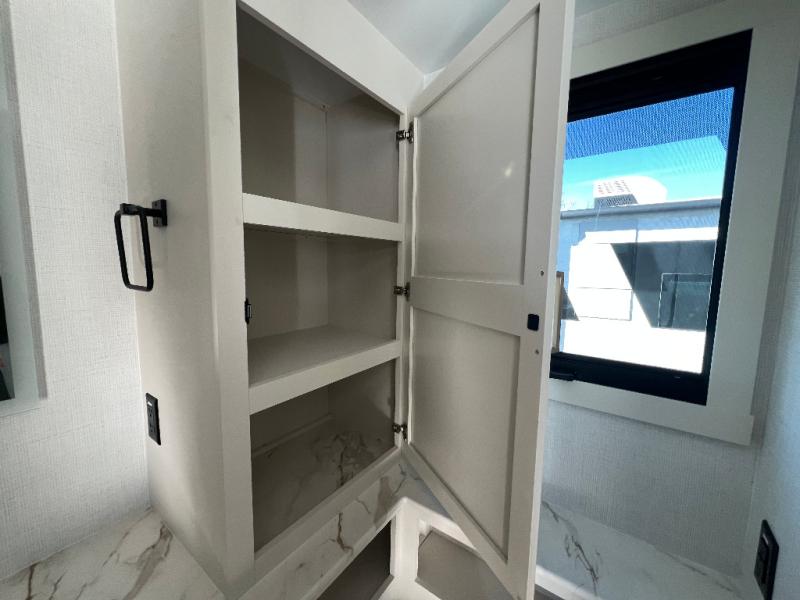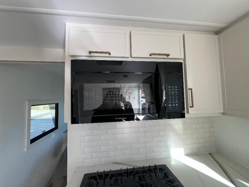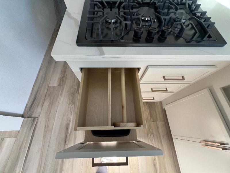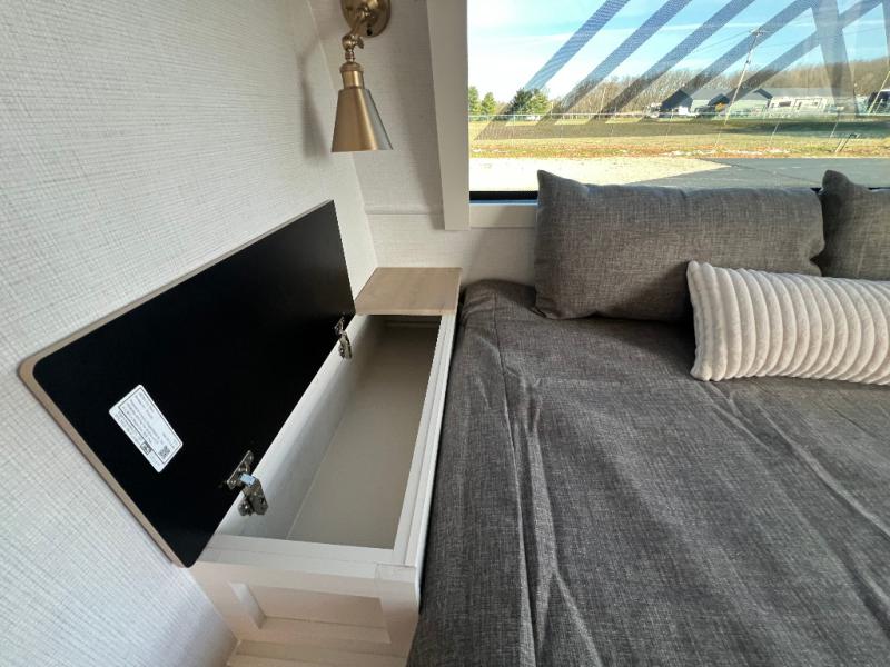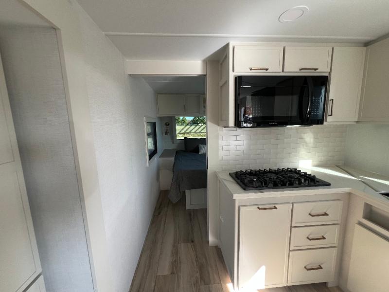 One look at this travel trailer and you'll be sold! The full rear bath features a spacious 42" x 30" shower with a built-in seat and Maxxair fan to name a few comforts. The front private bedroom features a 66" x 80" king bed with a MaxSpace Split-Level Wardrobe underneath to store shoes, clothes, and more! A slide out in the combined living area and kitchen makes your space more open, and you'll enjoy relaxing on the theater seating here in the evenings. The full kitchen includes a three burner stovetop, residential 30" convection microwave, 12 cu. ft. 12V refrigerator, plus a trash bin and Stow N' Go paper towel holder for added convenience. You can choose to eat outdoors under the 19' electric awning with LED lights or stay inside to dine at the pull-out dining table with a drawer for added storage! And if you're needing more sleeping space, just choose the optional tri-fold sofa in place of the theater seating!