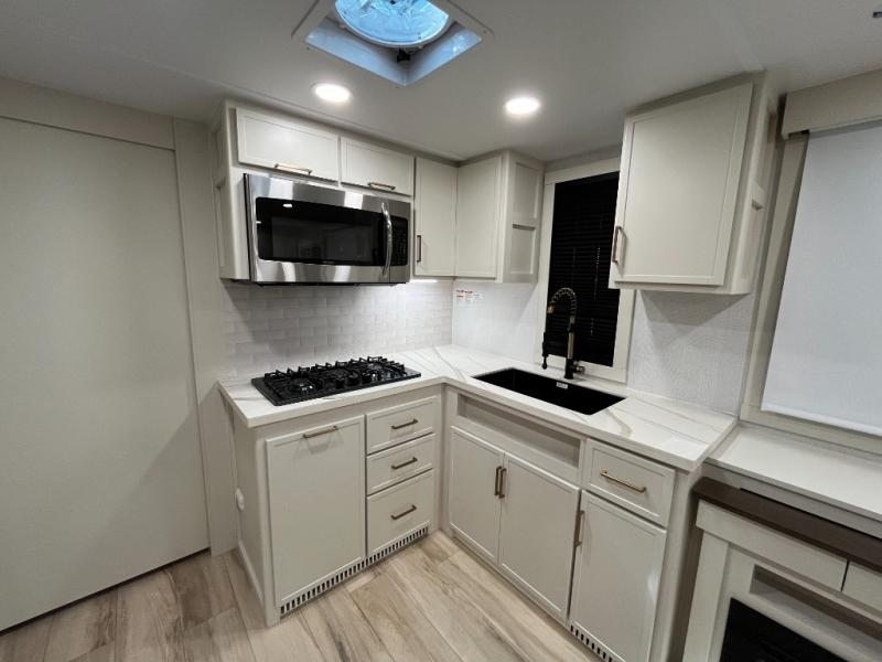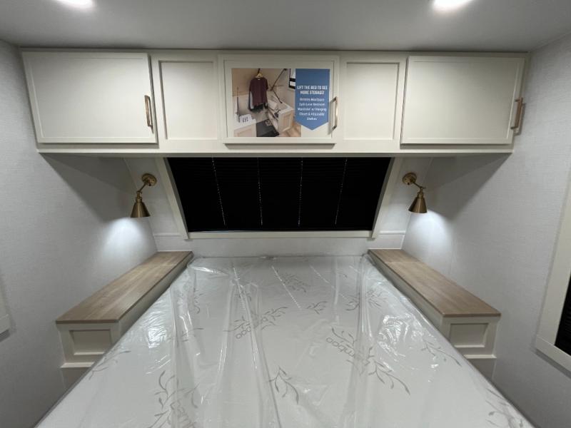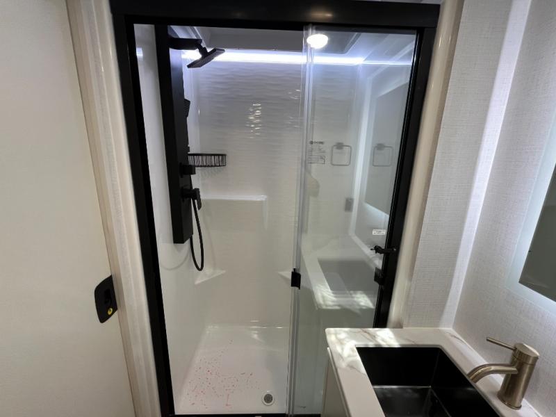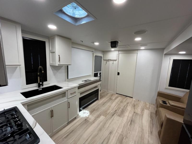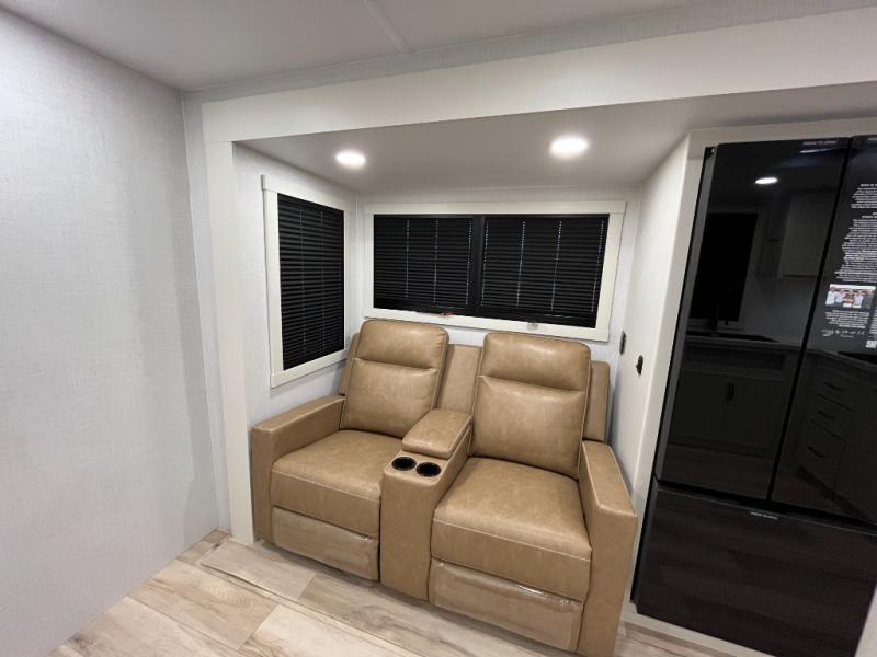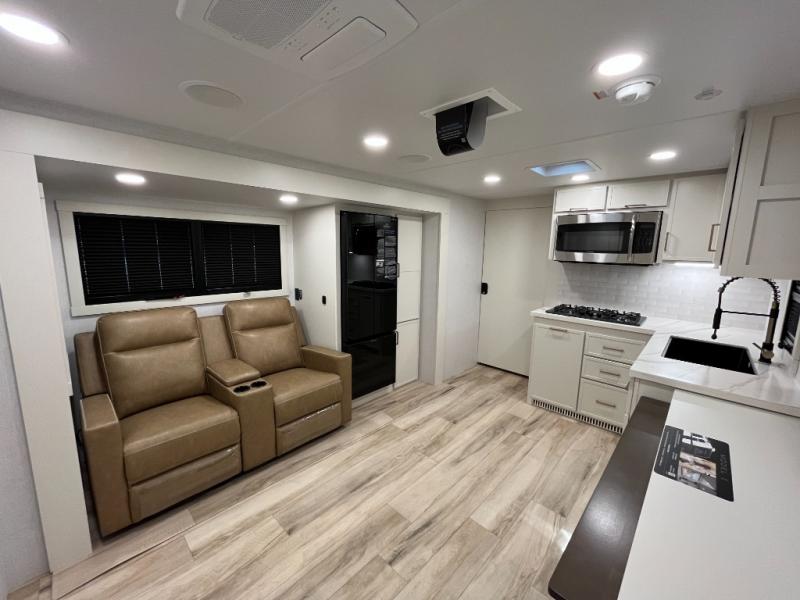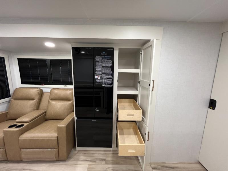 One look at this travel trailer and you'll be sold! The full rear bath features a spacious 42" x 30" shower with a built-in seat and Maxxair fan to name a few comforts. The front private bedroom features a 66" x 80" king bed with a MaxSpace Split-Level Wardrobe underneath to store shoes, clothes, and more! A slide out in the combined living area and kitchen makes your space more open, and you'll enjoy relaxing on the theater seating here in the evenings. The full kitchen includes a three burner stovetop, residential 30" convection microwave, 12 cu. ft. 12V refrigerator, plus a trash bin and Stow N' Go paper towel holder for added convenience. You can choose to eat outdoors under the 19' electric awning with LED lights or stay inside to dine at the pull-out dining table with a drawer for added storage! And if you're needing more sleeping space, just choose the optional tri-fold sofa in place of the theater seating!