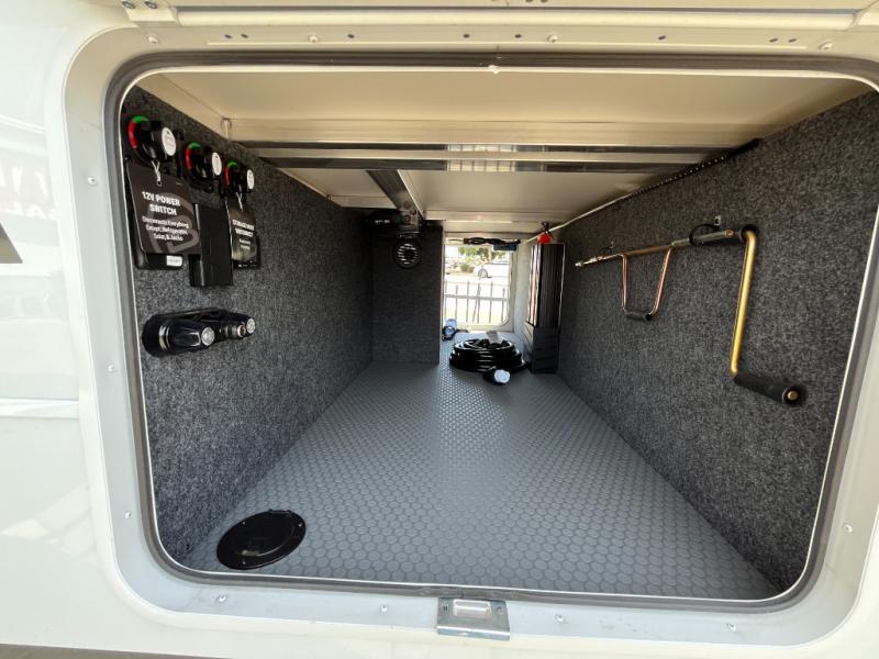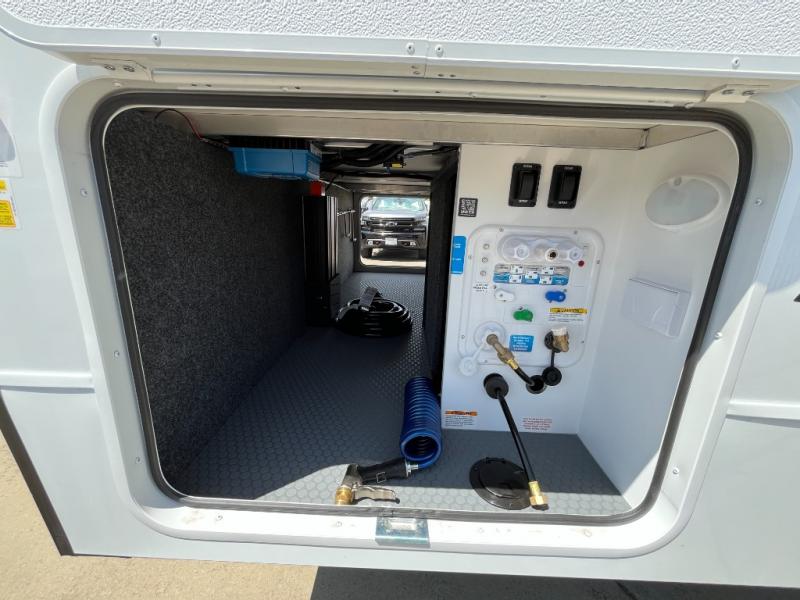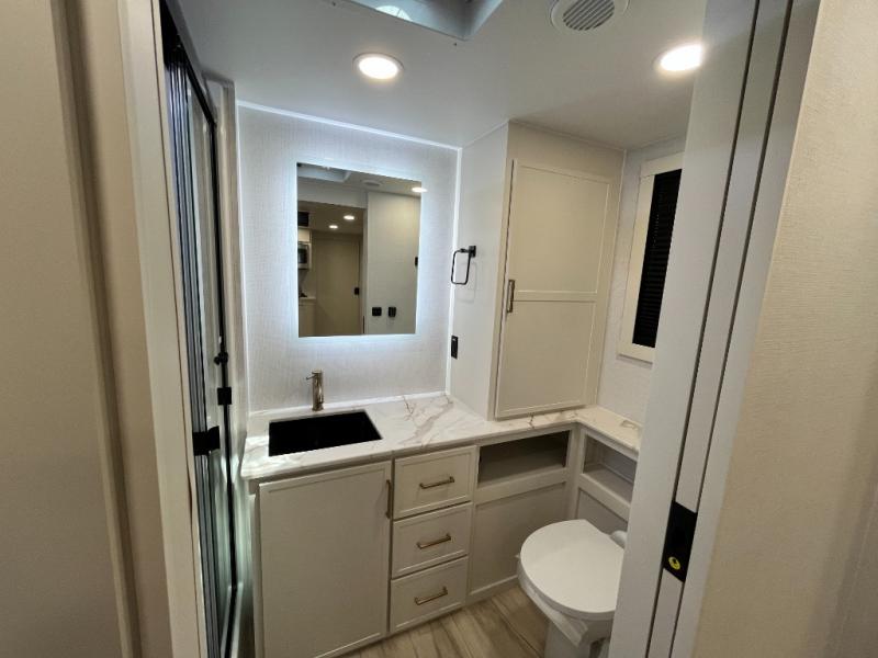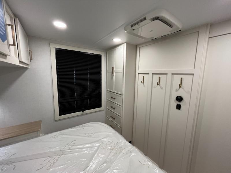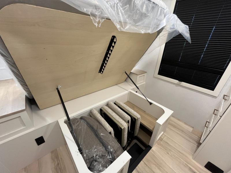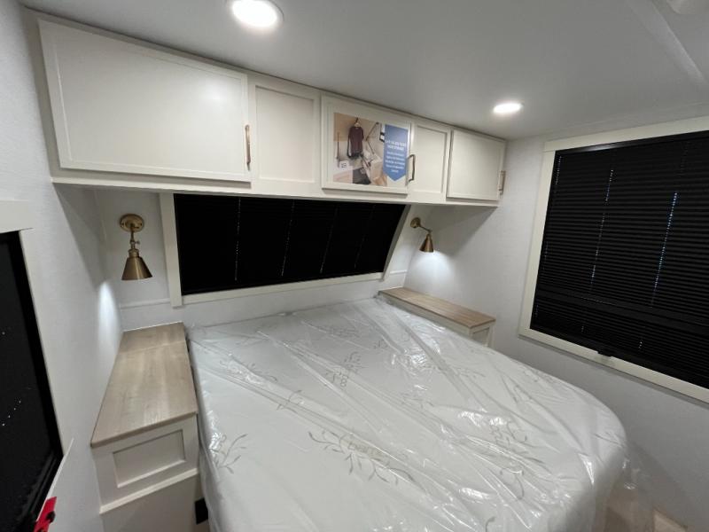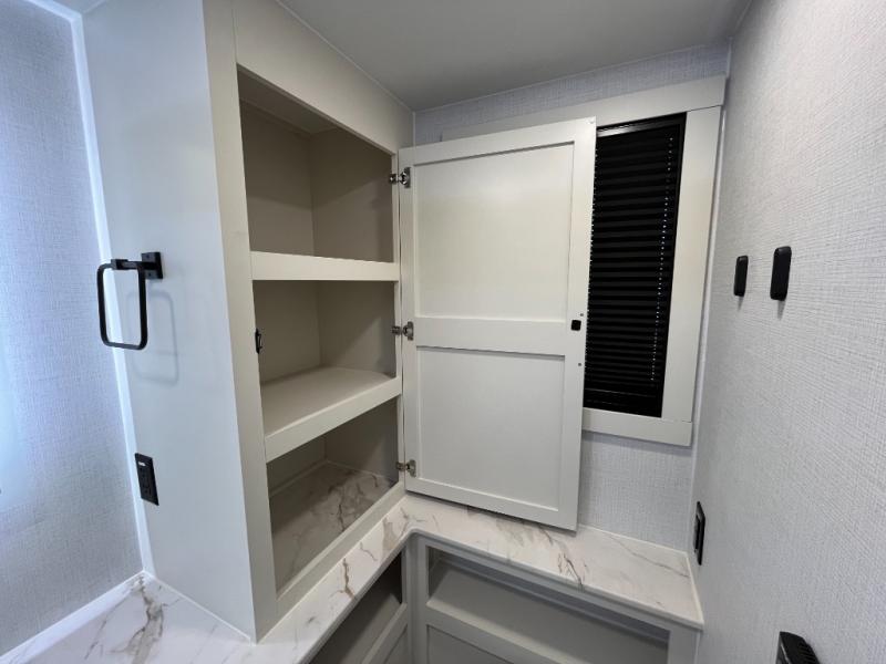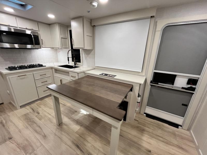 One look at this travel trailer and you'll be sold! The full rear bath features a spacious 42" x 30" shower with a built-in seat and Maxxair fan to name a few comforts. The front private bedroom features a 66" x 80" king bed with a MaxSpace Split-Level Wardrobe underneath to store shoes, clothes, and more! A slide out in the combined living area and kitchen makes your space more open, and you'll enjoy relaxing on the theater seating here in the evenings. The full kitchen includes a three burner stovetop, residential 30" convection microwave, 12 cu. ft. 12V refrigerator, plus a trash bin and Stow N' Go paper towel holder for added convenience. You can choose to eat outdoors under the 19' electric awning with LED lights or stay inside to dine at the pull-out dining table with a drawer for added storage! And if you're needing more sleeping space, just choose the optional tri-fold sofa in place of the theater seating!