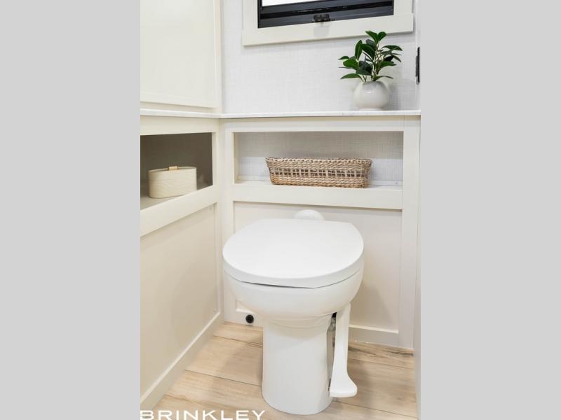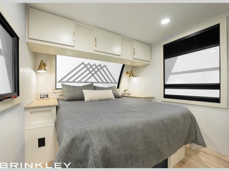 The lightweight Model I travel trailer by Brinkley is the perfect choice for those looking for an easy tow and at-home comforts! There is a drop-frame chassis, high-performance Road Armor suspension equalizer system, and Demco EZ Latch trailer coupler that automatically latches when dropped onto a hitch ball without the need of a safety pin. Additional exterior features include square Euro frameless windows, automotive-grade paint, full-width LED strip lighting in the pass-thru, and a pet & property security campside tie-down to keep your gear and furry friends safe. Inside, you'll be wowed by Brinkley's CraftSense wood trim construction, residential solid surface kitchen countertops, dimmable bedroom lights, and marine-grade neon LED shower lighting to name a few stand-out features!