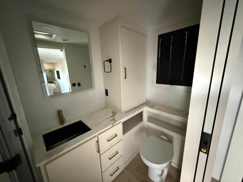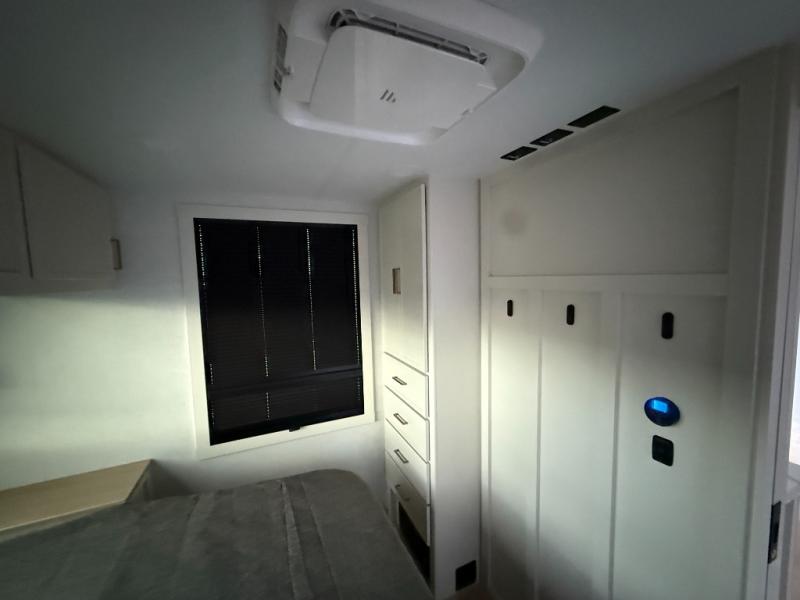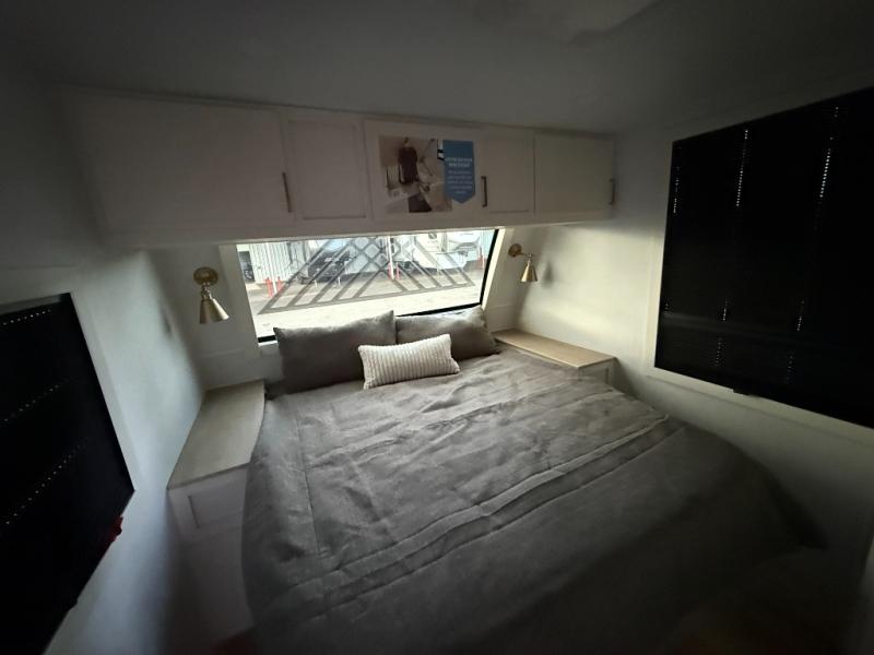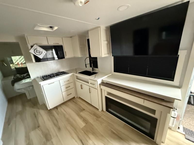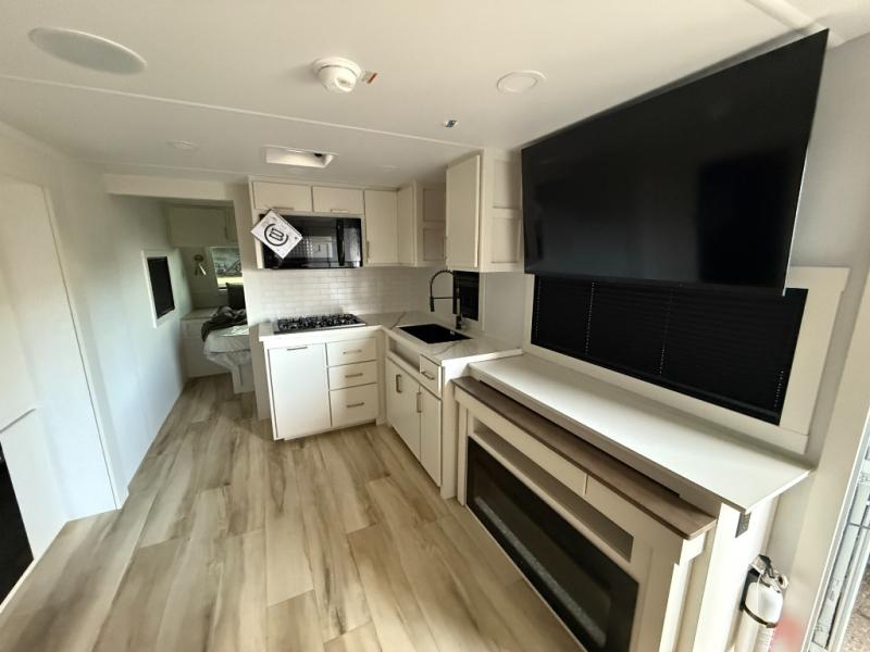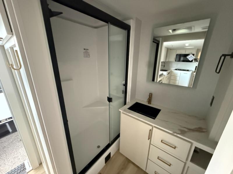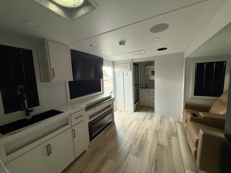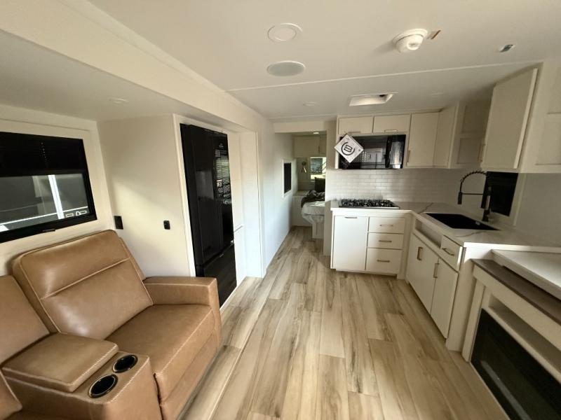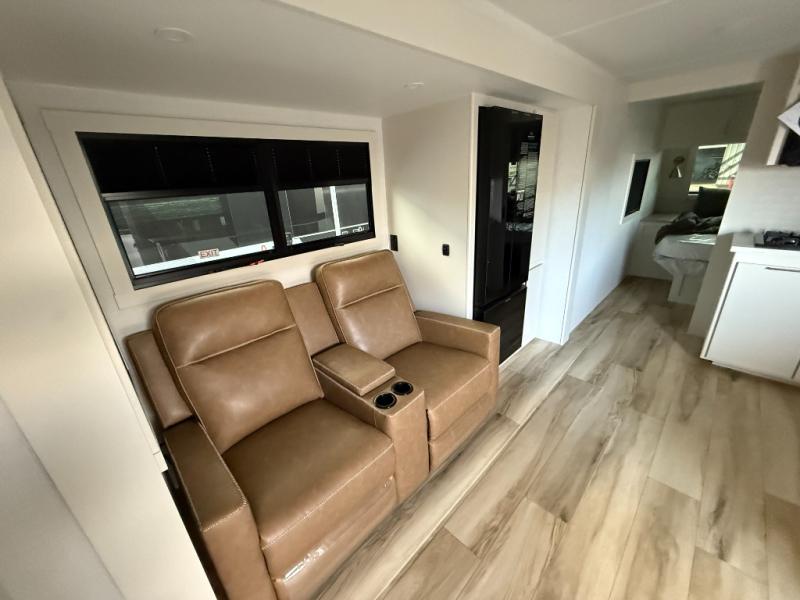 One look at this travel trailer and you'll be sold! The full rear bath features a spacious 42" x 30" shower with a built-in seat and Maxxair fan to name a few comforts. The front private bedroom features a 66" x 80" king bed with a MaxSpace Split-Level Wardrobe underneath to store shoes, clothes, and more! A slide out in the combined living area and kitchen makes your space more open, and you'll enjoy relaxing on the theater seating here in the evenings. The full kitchen includes a three burner stovetop, residential 30" convection microwave, 12 cu. ft. 12V refrigerator, plus a trash bin and Stow N' Go paper towel holder for added convenience. You can choose to eat outdoors under the 18' electric awning with LED lights or stay inside to dine at the pull-out dining table with a drawer for added storage! And if you're needing more sleeping space, just choose the optional tri-fold sofa in place of the theater seating!