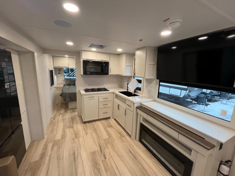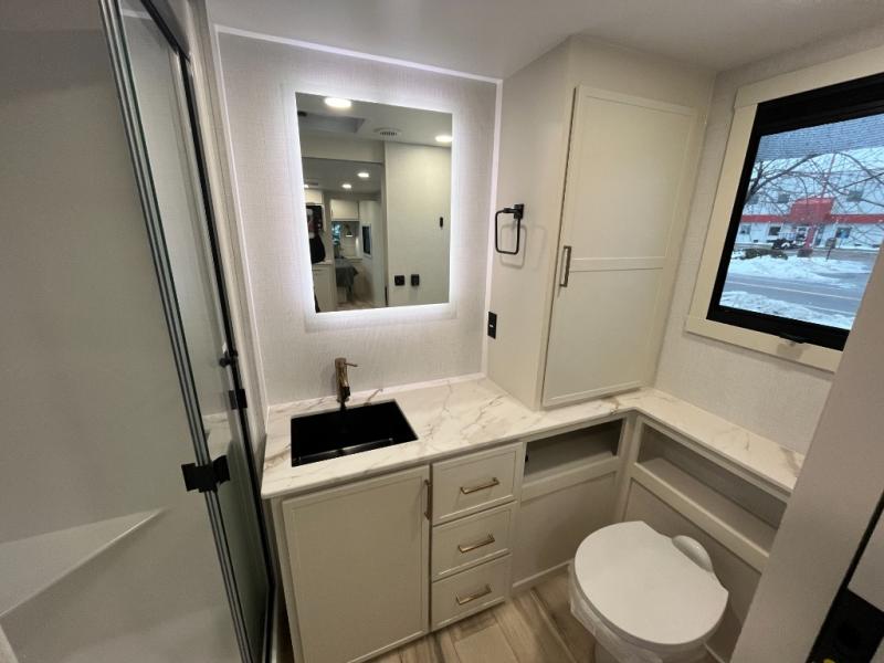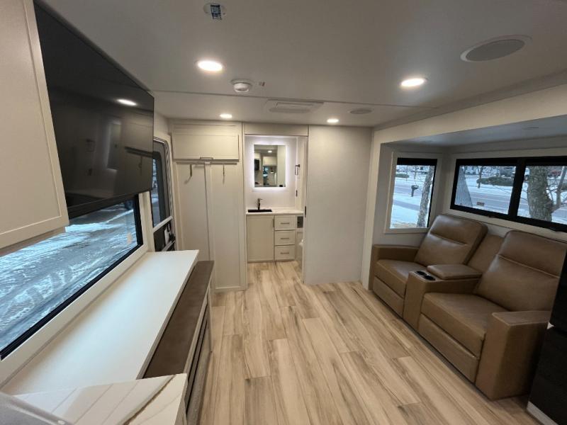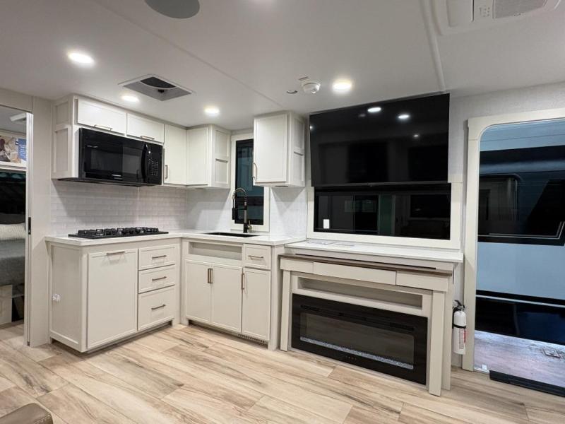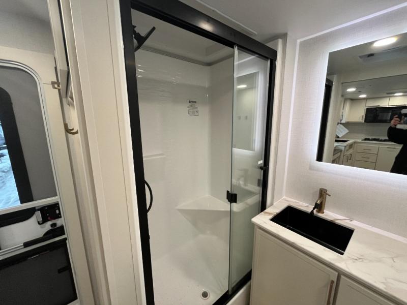 One look at this travel trailer and you'll be sold! The full rear bath features a spacious 42" x 30" shower with a built-in seat and Maxxair fan to name a few comforts. The front private bedroom features a 66" x 80" king bed with a MaxSpace Split-Level Wardrobe underneath to store shoes, clothes, and more! A slide out in the combined living area and kitchen makes your space more open, and you'll enjoy relaxing on the theater seating here in the evenings. The full kitchen includes a three burner stovetop, residential 30" convection microwave, 12 cu. ft. 12V refrigerator, plus a trash bin and Stow N' Go paper towel holder for added convenience. You can choose to eat outdoors under the 18' electric awning with LED lights or stay inside to dine at the pull-out dining table with a drawer for added storage! And if you're needing more sleeping space, just choose the optional tri-fold sofa in place of the theater seating!