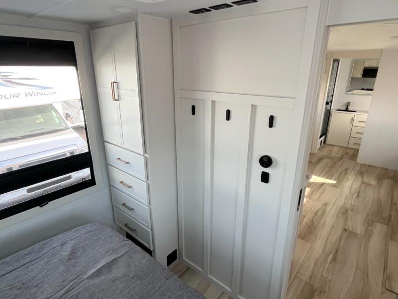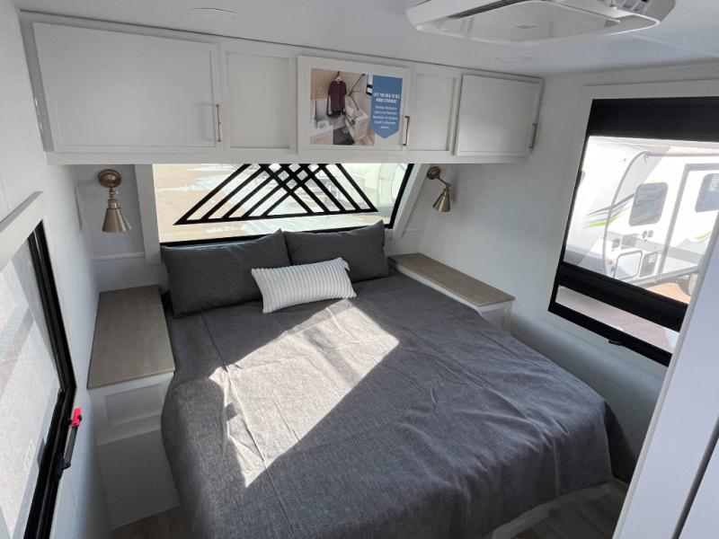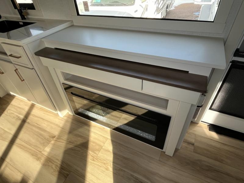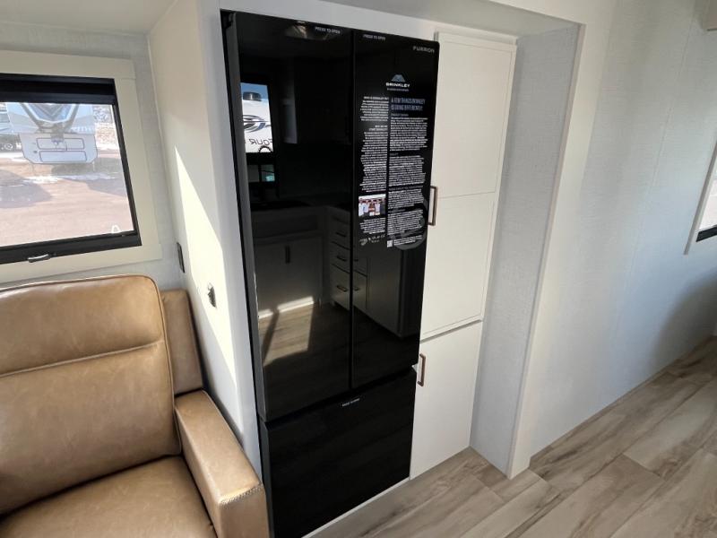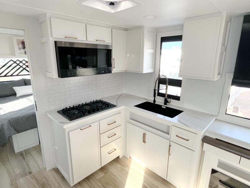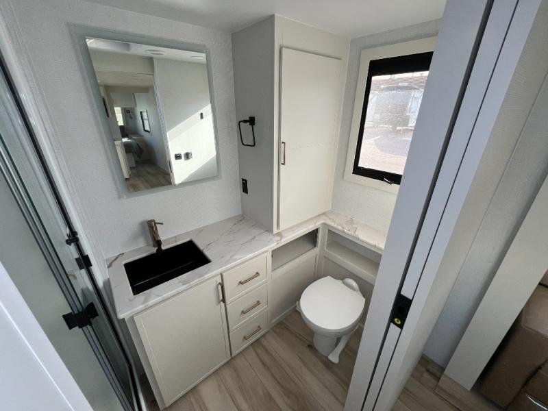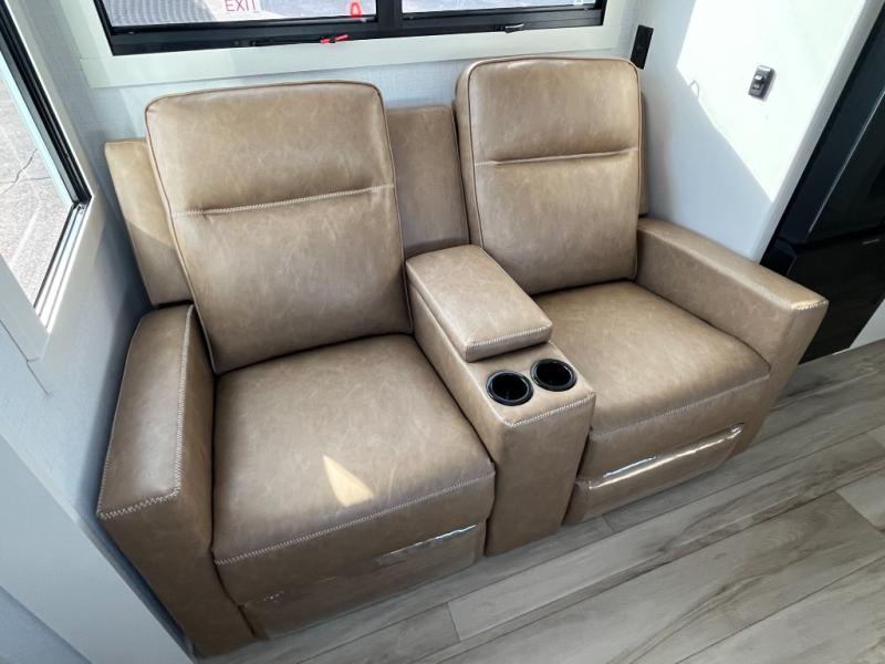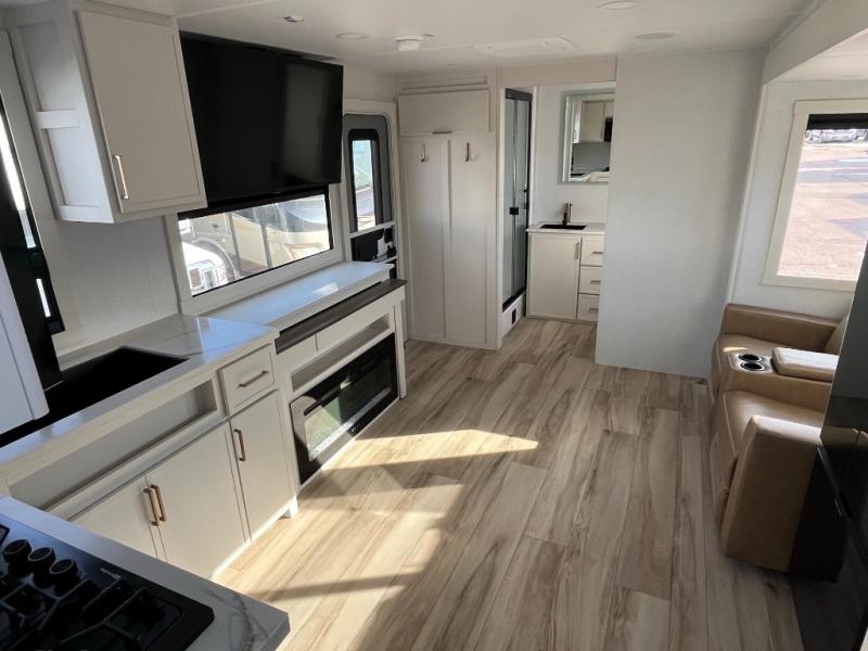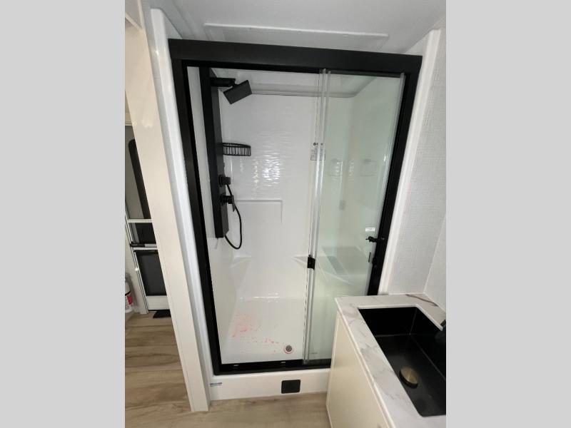 One look at this travel trailer and you'll be sold! The full rear bath features a spacious 42" x 30" shower with a built-in seat and Maxxair fan to name a few comforts. The front private bedroom features a 66" x 80" king bed with a MaxSpace Split-Level Wardrobe underneath to store shoes, clothes, and more! A slide out in the combined living area and kitchen makes your space more open, and you'll enjoy relaxing on the theater seating here in the evenings. The full kitchen includes a three burner stovetop, residential 30" convection microwave, 12 cu. ft. 12V refrigerator, plus a trash bin and Stow N' Go paper towel holder for added convenience. You can choose to eat outdoors under the 18' electric awning with LED lights or stay inside to dine at the pull-out dining table with a drawer for added storage! And if you're needing more sleeping space, just choose the optional tri-fold sofa in place of the theater seating!