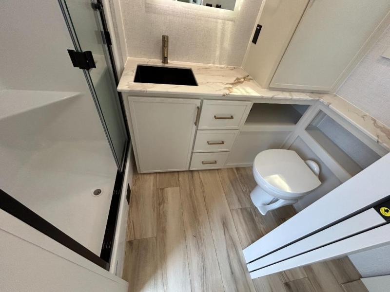 One look at this travel trailer and you'll be sold! The full rear bath features a spacious 42" x 30" shower with a built-in seat and Maxxair fan to name a few comforts. The front private bedroom features a 66" x 80" king bed with a MaxSpace Split-Level Wardrobe underneath to store shoes, clothes, and more! A slide out in the combined living area and kitchen makes your space more open, and you'll enjoy relaxing on the theater seating here in the evenings. The full kitchen includes a three burner stovetop, residential 30" convection microwave, 12 cu. ft. 12V refrigerator, plus a trash bin and Stow N' Go paper towel holder for added convenience. You can choose to eat outdoors under the 18' electric awning with LED lights or stay inside to dine at the pull-out dining table with a drawer for added storage! And if you're needing more sleeping space, just choose the optional tri-fold sofa in place of the theater seating!