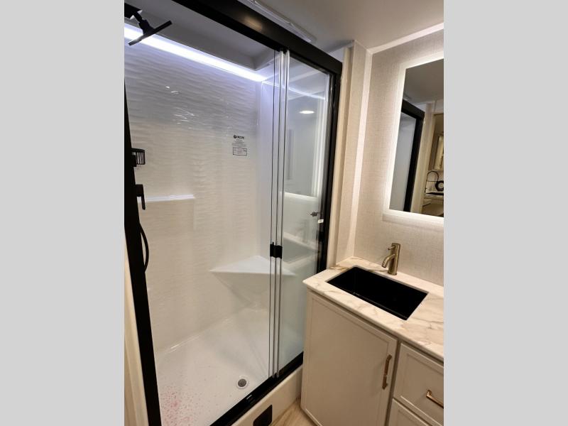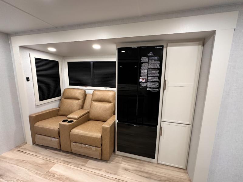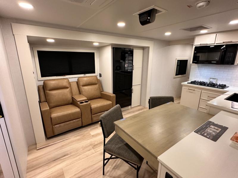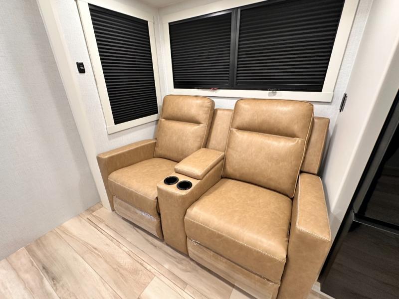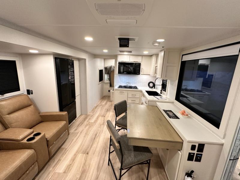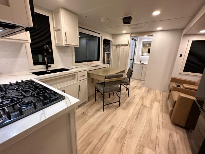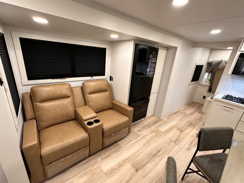 One look at this travel trailer and you'll be sold! The full rear bath features a spacious 42" x 30" shower with a built-in seat and Maxxair fan to name a few comforts. The front private bedroom features a 66" x 80" king bed with a MaxSpace Split-Level Wardrobe underneath to store shoes, clothes, and more! A slide out in the combined living area and kitchen makes your space more open, and you'll enjoy relaxing on the theater seating here in the evenings. The full kitchen includes a three burner stovetop, residential 30" convection microwave, 12 cu. ft. 12V refrigerator, plus a trash bin and Stow N' Go paper towel holder for added convenience. You can choose to eat outdoors under the 19' electric awning with LED lights or stay inside to dine at the pull-out dining table with a drawer for added storage! And if you're needing more sleeping space, just choose the optional tri-fold sofa in place of the theater seating!