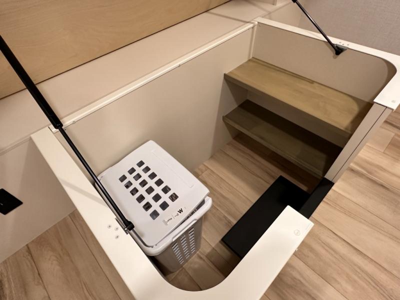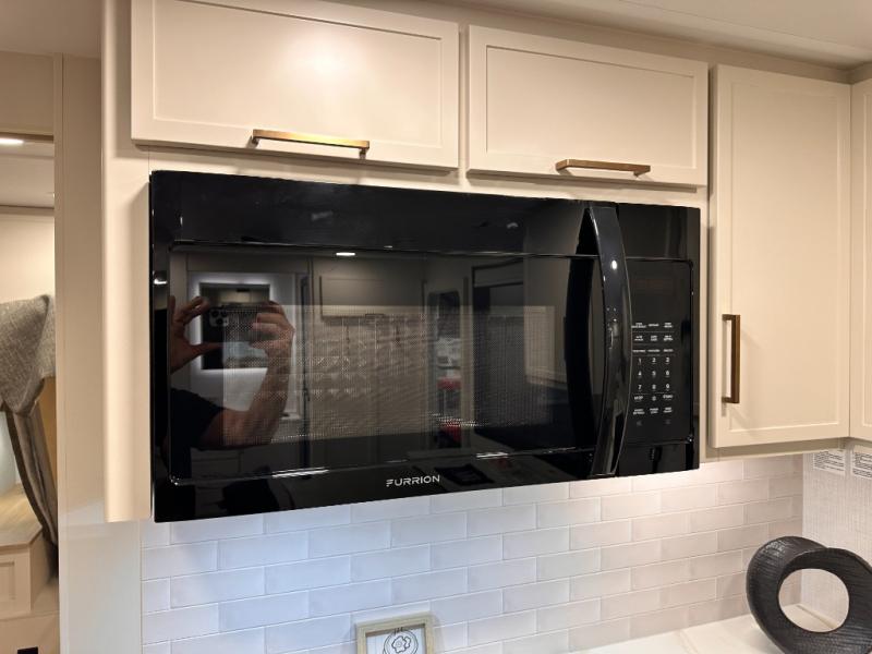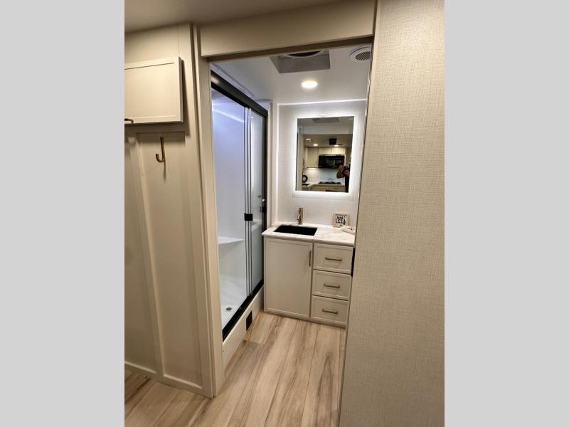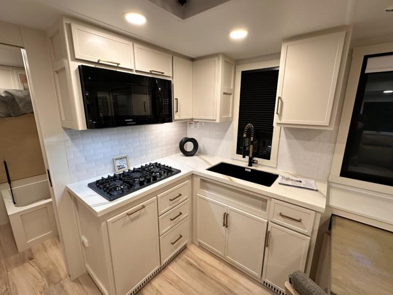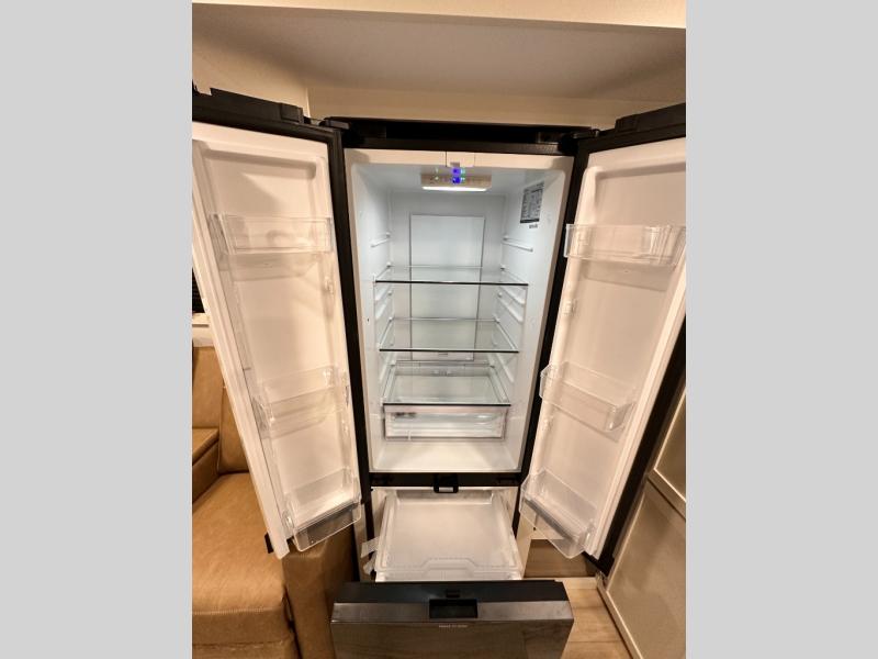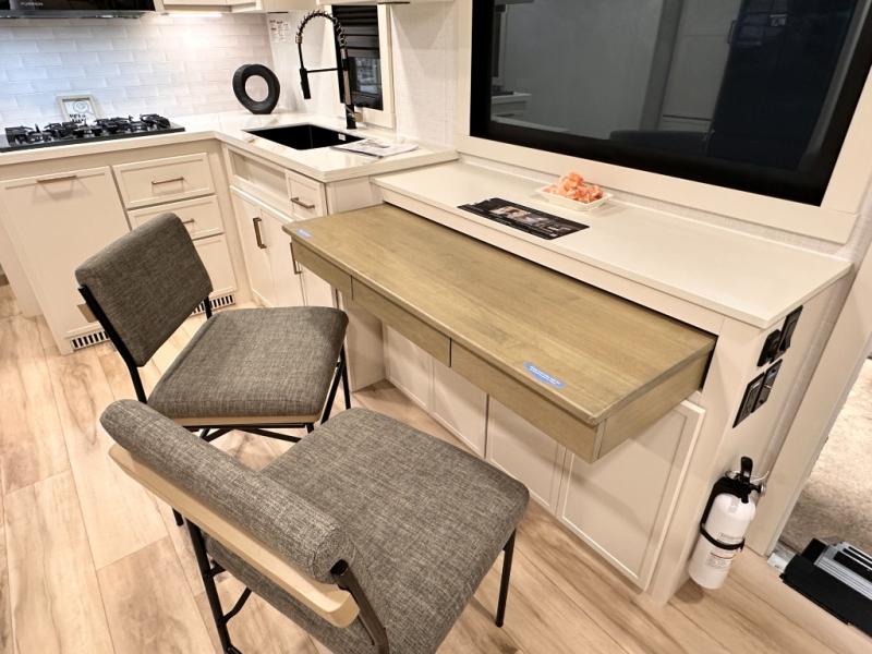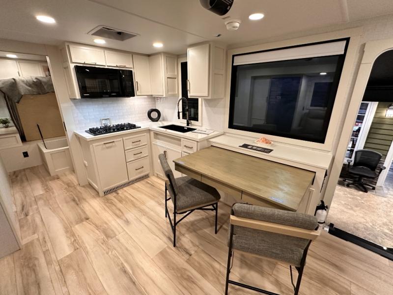 One look at this travel trailer and you'll be sold! The full rear bath features a spacious 42" x 30" shower with a built-in seat and Maxxair fan to name a few comforts. The front private bedroom features a 66" x 80" king bed with a MaxSpace Split-Level Wardrobe underneath to store shoes, clothes, and more! A slide out in the combined living area and kitchen makes your space more open, and you'll enjoy relaxing on the theater seating here in the evenings. The full kitchen includes a three burner stovetop, residential 30" convection microwave, 12 cu. ft. 12V refrigerator, plus a trash bin and Stow N' Go paper towel holder for added convenience. You can choose to eat outdoors under the 19' electric awning with LED lights or stay inside to dine at the pull-out dining table with a drawer for added storage! And if you're needing more sleeping space, just choose the optional tri-fold sofa in place of the theater seating!
