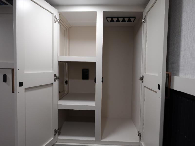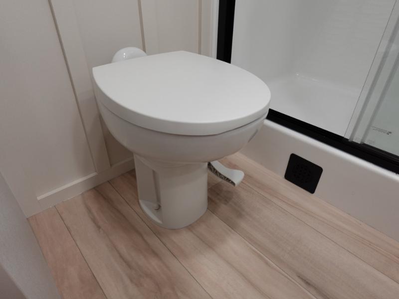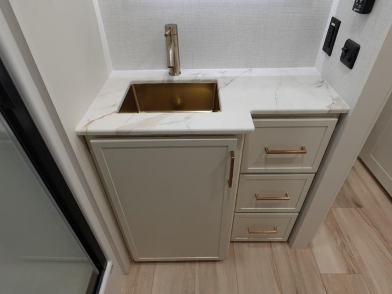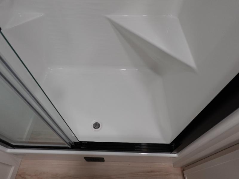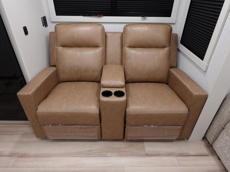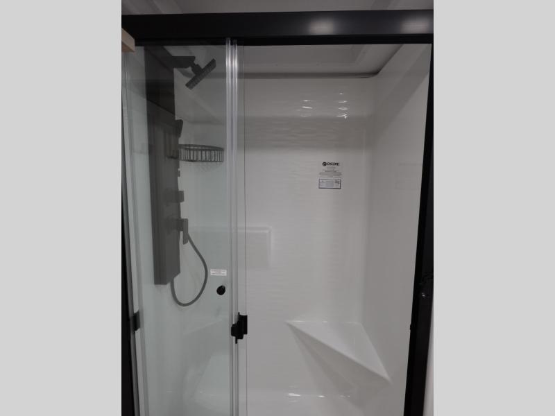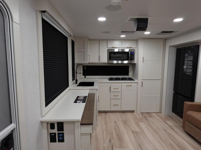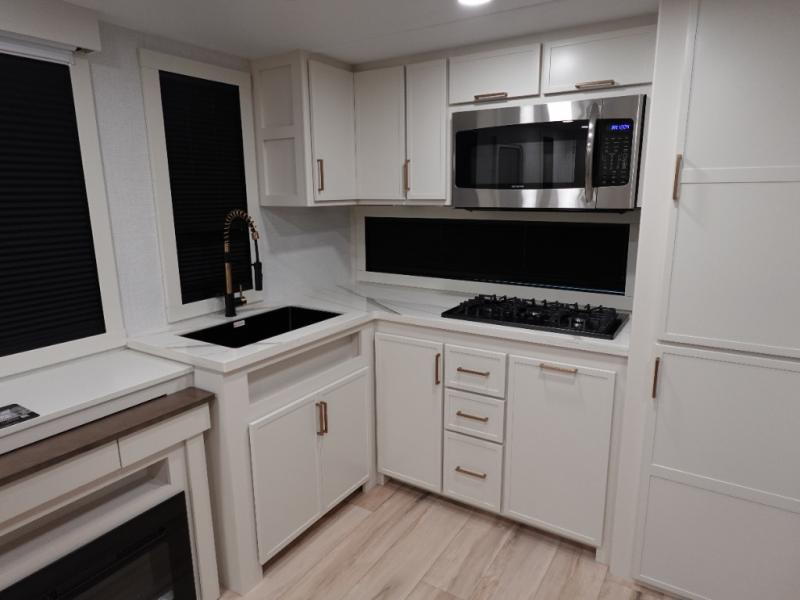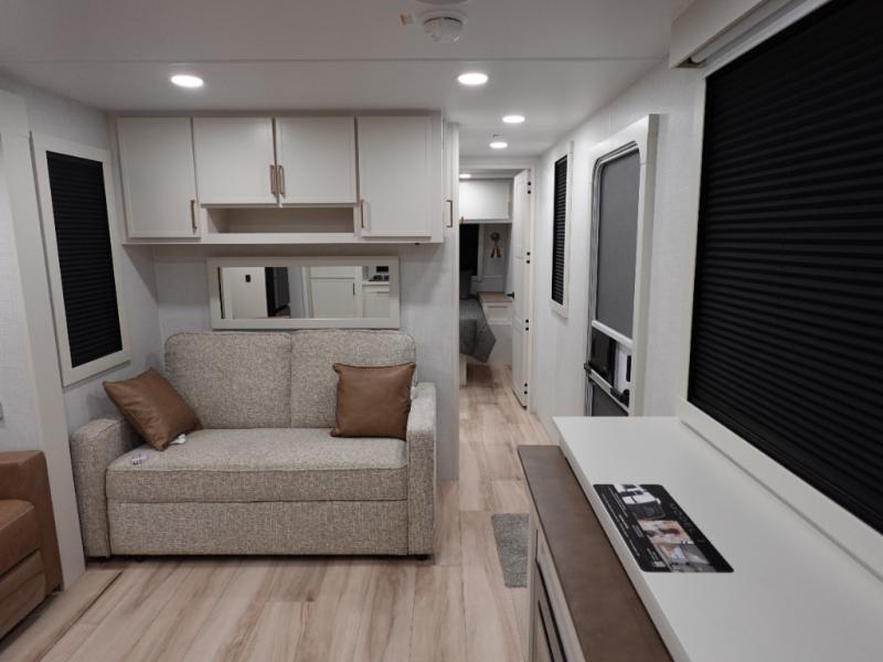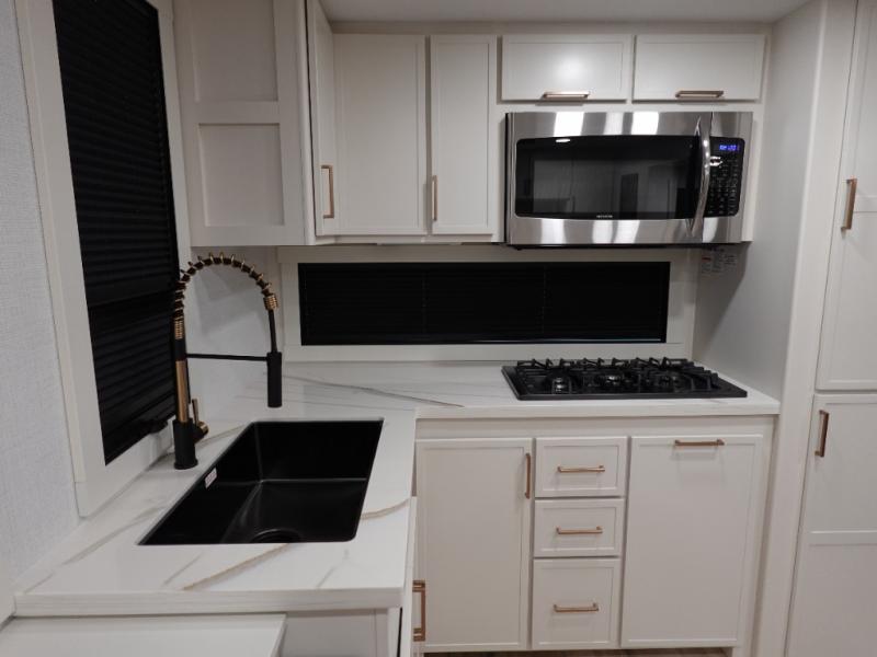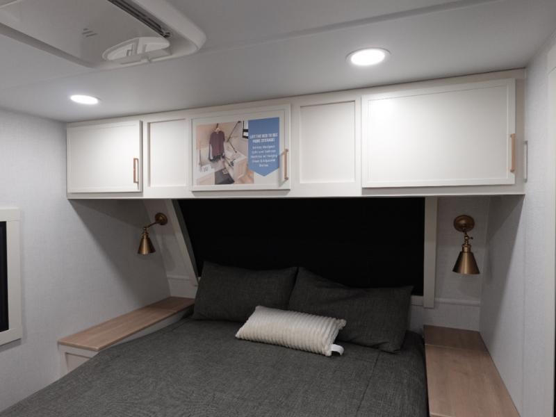 This travel trailer can comfortably sleep four with the king bed in the private bedroom and the tri-fold sofa in the main living area! The full bath features a spacious 42" x 30" shower with a built-in seat and Maxxair fan to name a few comforts. The front private bedroom features a 66" x 80" king bed with a MaxSpace Split-Level Wardrobe underneath to store shoes, clothes, and more! A slide out in the combined living area and rear kitchen makes your space more open, and you'll enjoy relaxing on the theater seating here in the evenings. The full kitchen includes a three burner stovetop, residential 30" convection microwave, 12 cu. ft. 12V refrigerator, plus a trash bin and Stow N' Go paper towel holder for added convenience. You can choose to eat outdoors under the 19' electric awning with LED lights or stay inside to dine at the pull-out dining table with a drawer for added storage!