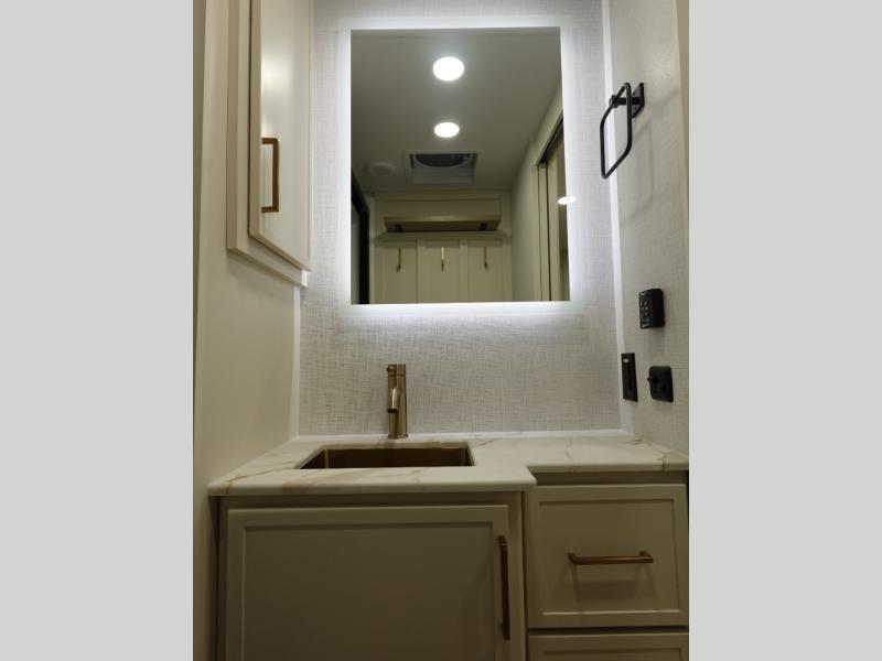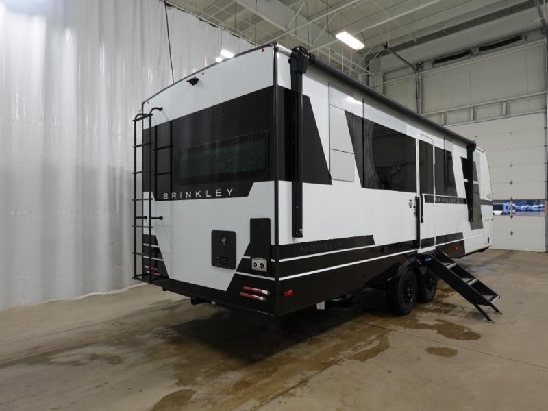 The lightweight Model I travel trailer by Brinkley is the perfect choice for those looking for an easy tow and at-home comforts! There is a drop-frame chassis, high-performance Road Armor suspension equalizer system, and Demco EZ Latch trailer coupler that automatically latches when dropped onto a hitch ball without the need of a safety pin. Additional exterior features include square Euro frameless windows, automotive-grade paint, full-width LED strip lighting in the pass-thru, and a pet & property security campside tie-down to keep your gear and furry friends safe. Inside, you'll be wowed by Brinkley's CraftSense wood trim construction, residential solid surface kitchen countertops, dimmable bedroom lights, and marine-grade neon LED shower lighting to name a few stand-out features!