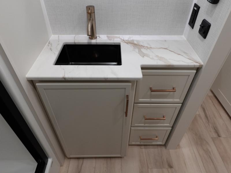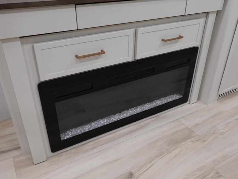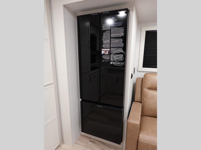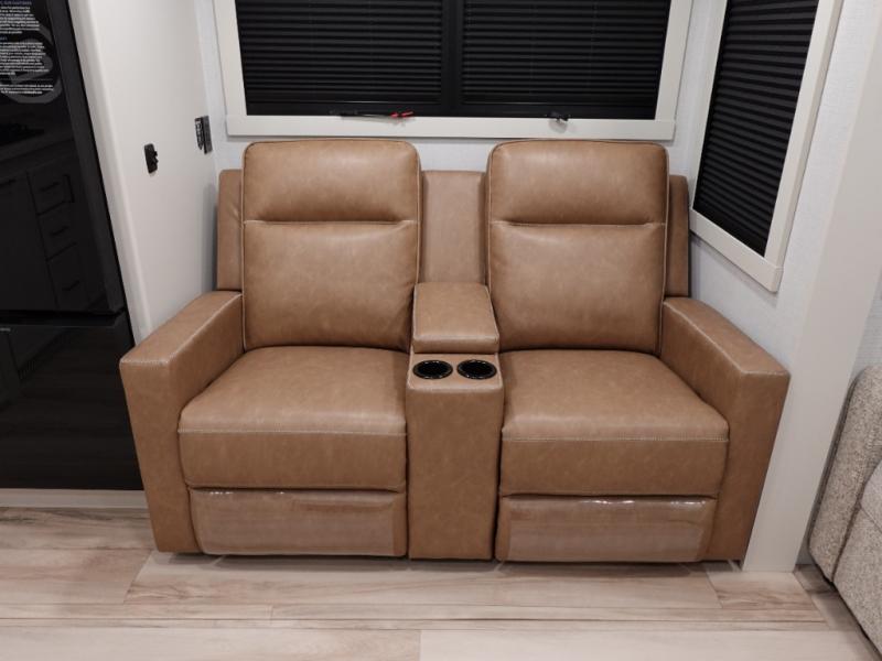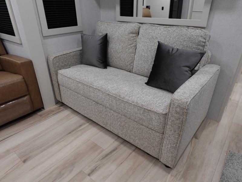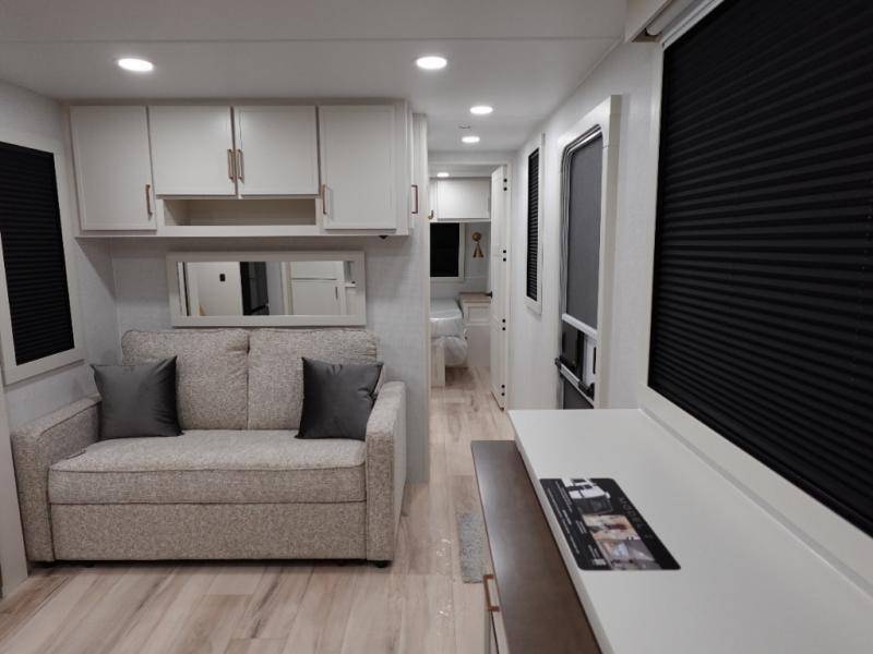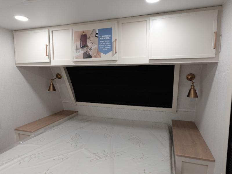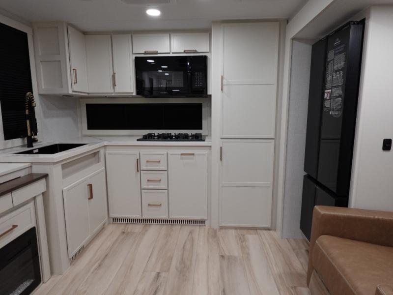 This travel trailer can comfortably sleep four with the king bed in the private bedroom and the tri-fold sofa in the main living area! The full bath features a spacious 42" x 30" shower with a built-in seat and Maxxair fan to name a few comforts. The front private bedroom features a 66" x 80" king bed with a MaxSpace Split-Level Wardrobe underneath to store shoes, clothes, and more! A slide out in the combined living area and rear kitchen makes your space more open, and you'll enjoy relaxing on the theater seating here in the evenings. The full kitchen includes a three burner stovetop, residential 30" convection microwave, 12 cu. ft. 12V refrigerator, plus a trash bin and Stow N' Go paper towel holder for added convenience. You can choose to eat outdoors under the 19' electric awning with LED lights or stay inside to dine at the pull-out dining table with a drawer for added storage!