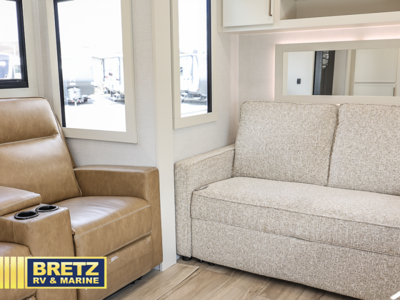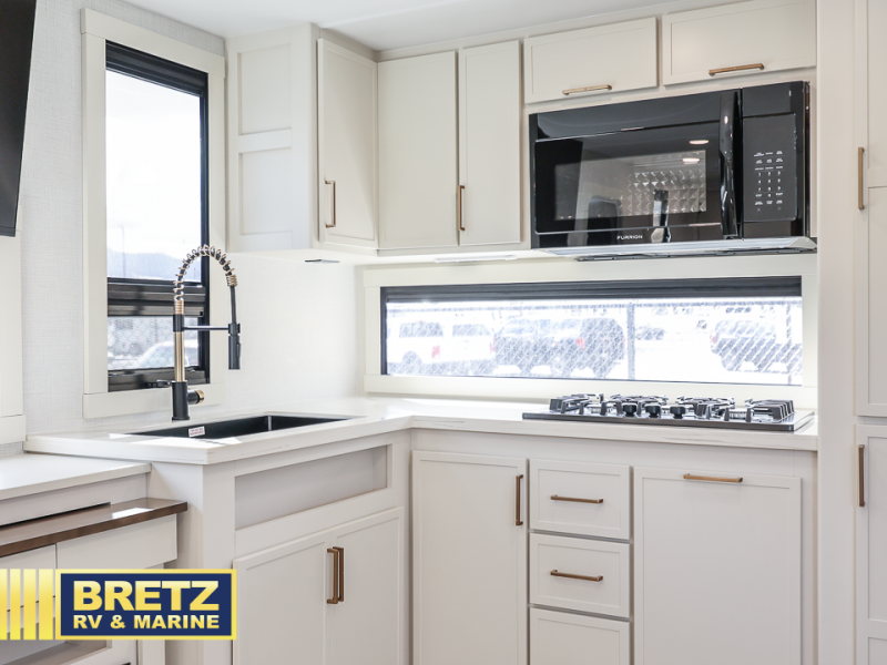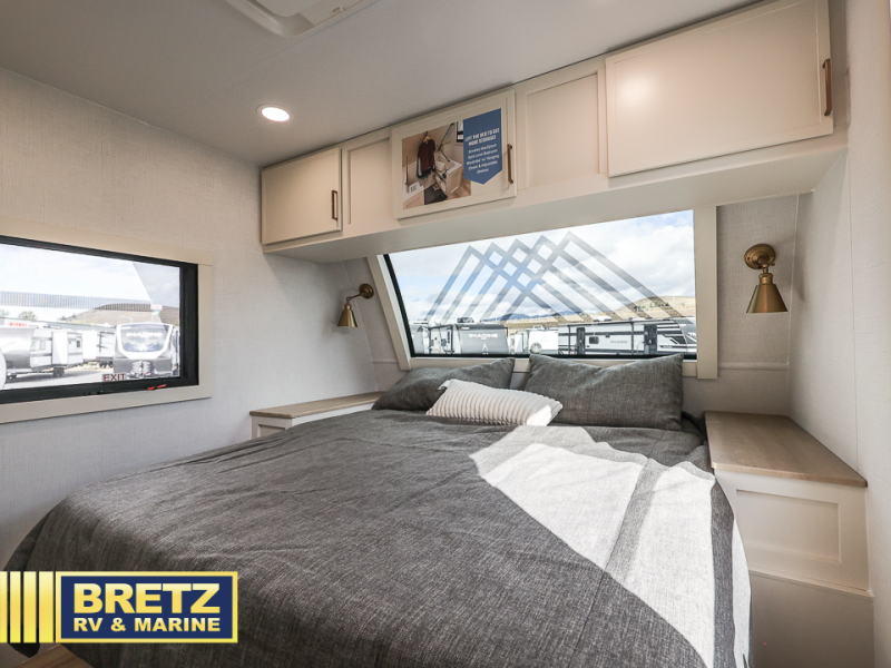 This travel trailer can comfortably sleep four with the king bed in the private bedroom and the tri-fold sofa in the main living area! The full bath features a spacious 42" x 30" shower with a built-in seat and Maxxair fan to name a few comforts. The front private bedroom features a 66" x 80" king bed with a MaxSpace Split-Level Wardrobe underneath to store shoes, clothes, and more! A slide out in the combined living area and rear kitchen makes your space more open, and you'll enjoy relaxing on the theater seating here in the evenings. The full kitchen includes a three burner stovetop, residential 30" convection microwave, 12 cu. ft. 12V refrigerator, plus a trash bin and Stow N' Go paper towel holder for added convenience. You can choose to eat outdoors under the 19' electric awning with LED lights or stay inside to dine at the pull-out dining table with a drawer for added storage!