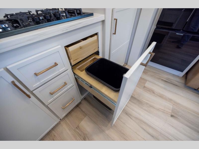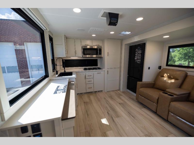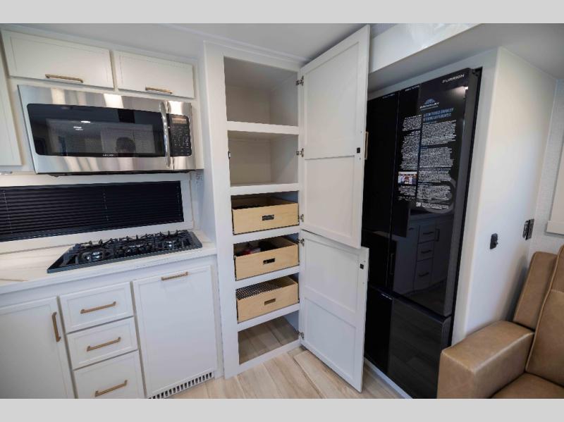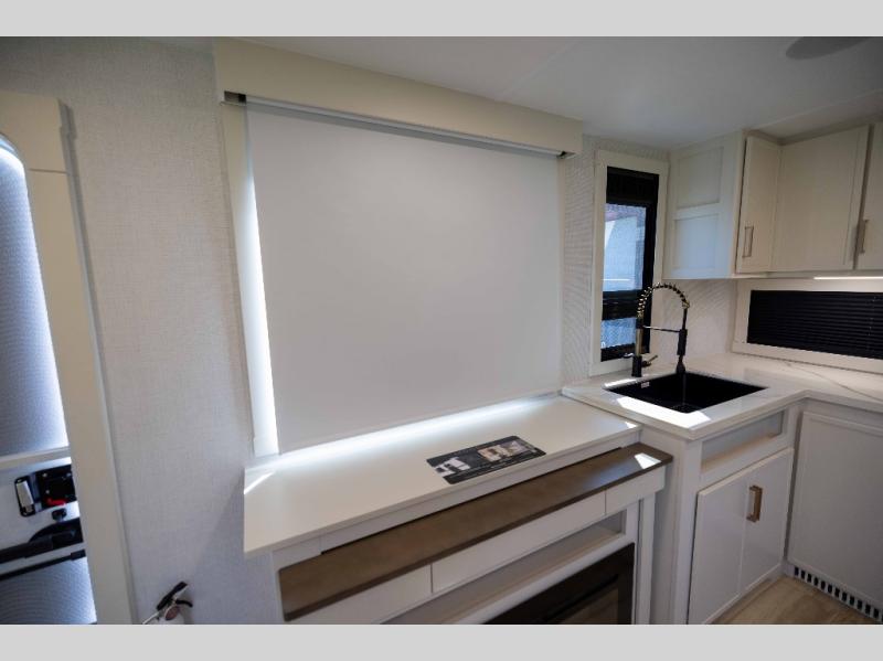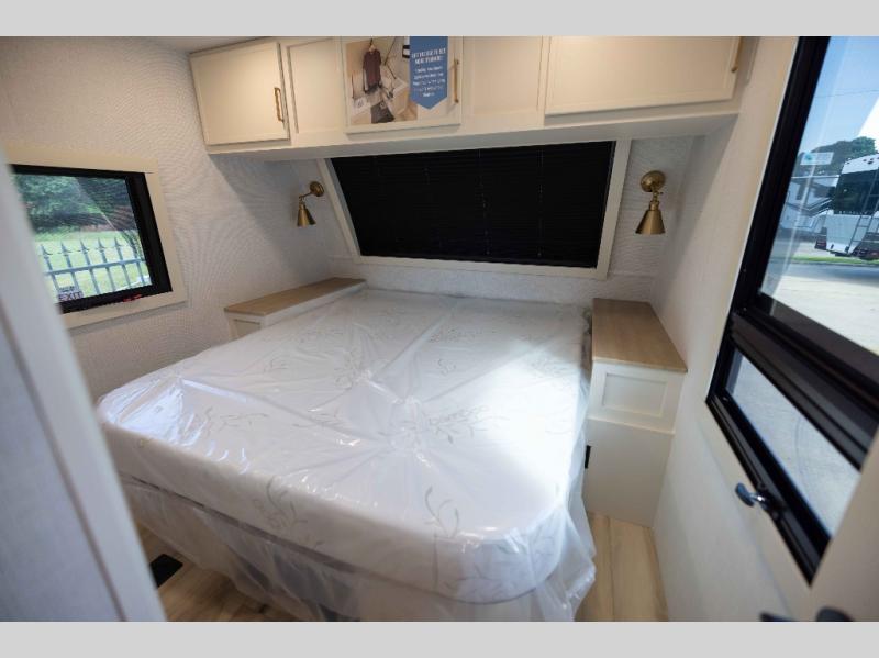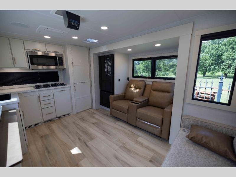 This travel trailer can comfortably sleep four with the king bed in the private bedroom and the tri-fold sofa in the main living area! The full bath features a spacious 42" x 30" shower with a built-in seat and Maxxair fan to name a few comforts. The front private bedroom features a 66" x 80" king bed with a MaxSpace Split-Level Wardrobe underneath to store shoes, clothes, and more! A slide out in the combined living area and rear kitchen makes your space more open, and you'll enjoy relaxing on the theater seating here in the evenings. The full kitchen includes a three burner stovetop, residential 30" convection microwave, 12 cu. ft. 12V refrigerator, plus a trash bin and Stow N' Go paper towel holder for added convenience. You can choose to eat outdoors under the 19' electric awning with LED lights or stay inside to dine at the pull-out dining table with a drawer for added storage!