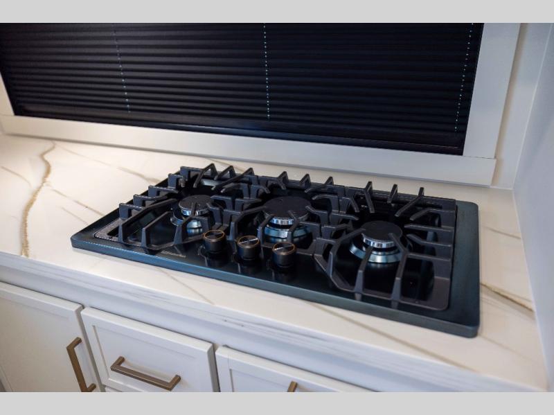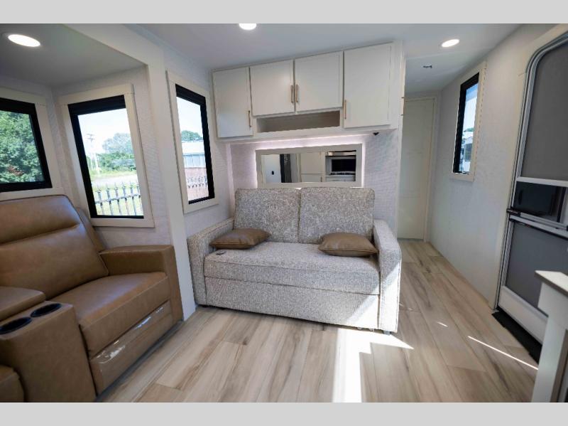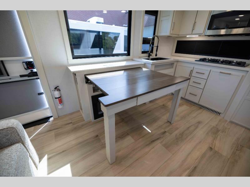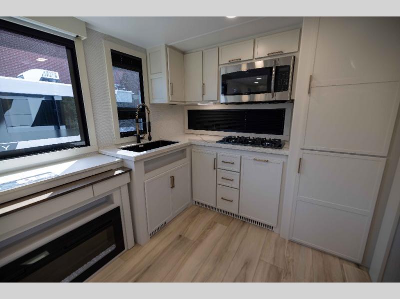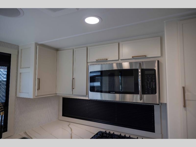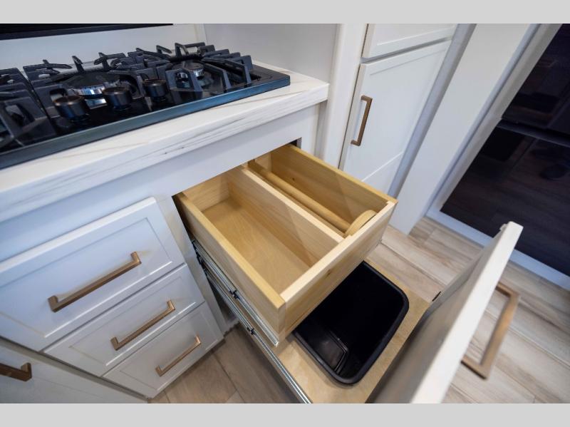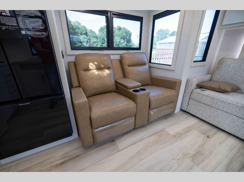 This travel trailer can comfortably sleep four with the king bed in the private bedroom and the tri-fold sofa in the main living area! The full bath features a spacious 42" x 30" shower with a built-in seat and Maxxair fan to name a few comforts. The front private bedroom features a 66" x 80" king bed with a MaxSpace Split-Level Wardrobe underneath to store shoes, clothes, and more! A slide out in the combined living area and rear kitchen makes your space more open, and you'll enjoy relaxing on the theater seating here in the evenings. The full kitchen includes a three burner stovetop, residential 30" convection microwave, 12 cu. ft. 12V refrigerator, plus a trash bin and Stow N' Go paper towel holder for added convenience. You can choose to eat outdoors under the 19' electric awning with LED lights or stay inside to dine at the pull-out dining table with a drawer for added storage!