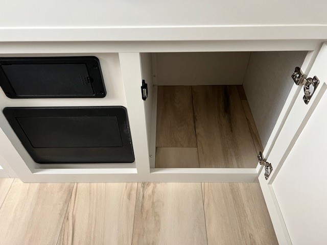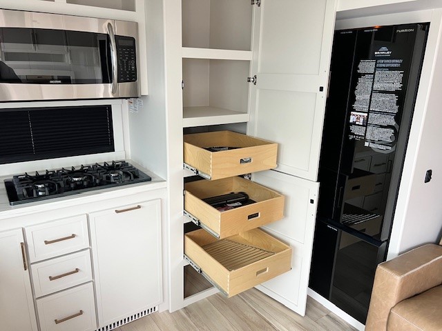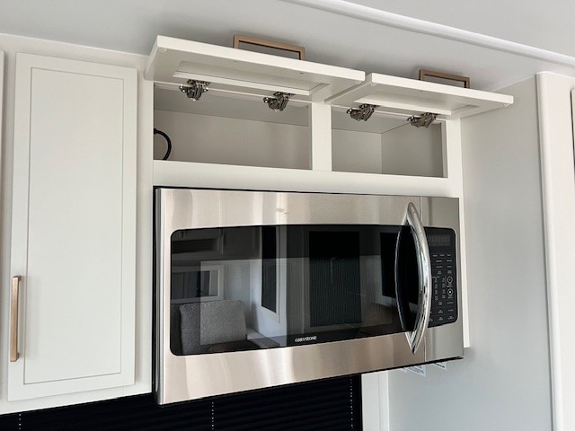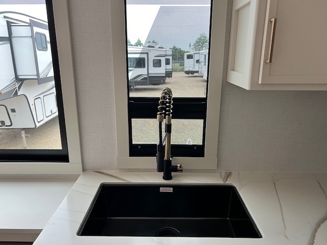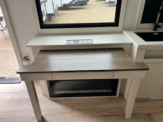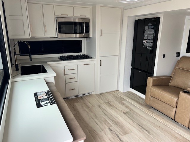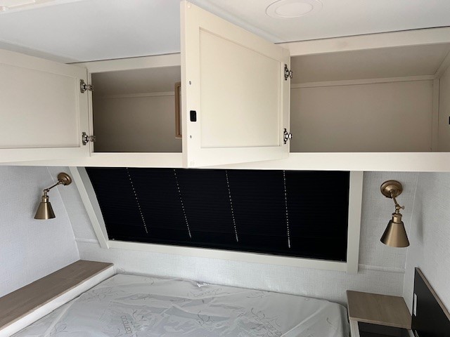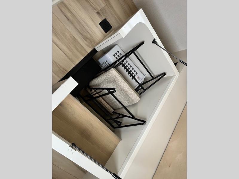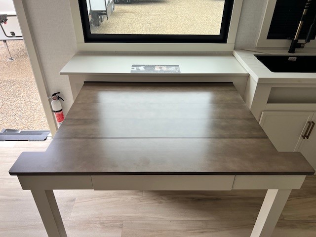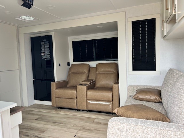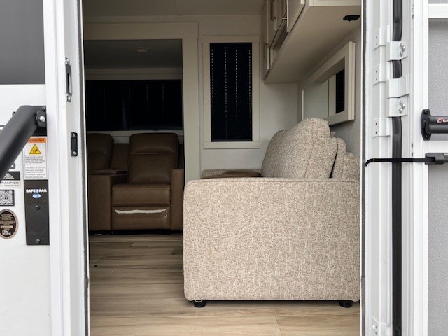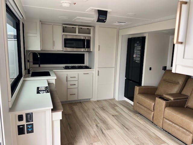 This travel trailer can comfortably sleep four with the king bed in the private bedroom and the tri-fold sofa in the main living area! The full bath features a spacious 42" x 30" shower with a built-in seat and Maxxair fan to name a few comforts. The front private bedroom features a 66" x 80" king bed with a MaxSpace Split-Level Wardrobe underneath to store shoes, clothes, and more! A slide out in the combined living area and rear kitchen makes your space more open, and you'll enjoy relaxing on the theater seating here in the evenings. The full kitchen includes a three burner stovetop, residential 30" convection microwave, 12 cu. ft. 12V refrigerator, plus a trash bin and Stow N' Go paper towel holder for added convenience. You can choose to eat outdoors under the 19' electric awning with LED lights or stay inside to dine at the pull-out dining table with a drawer for added storage!