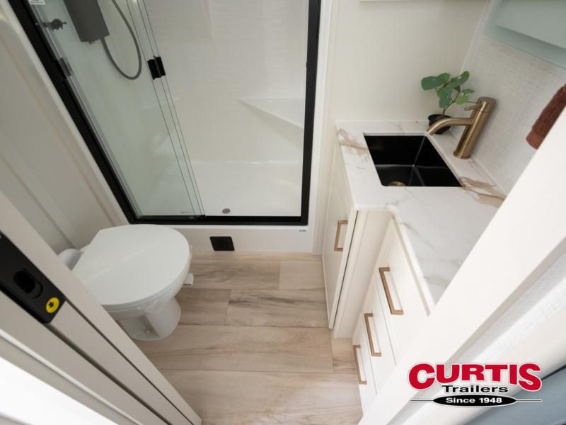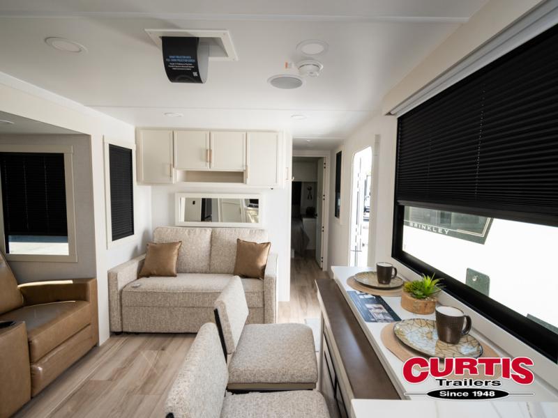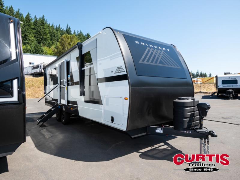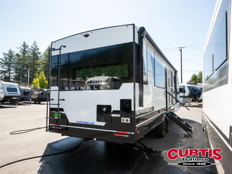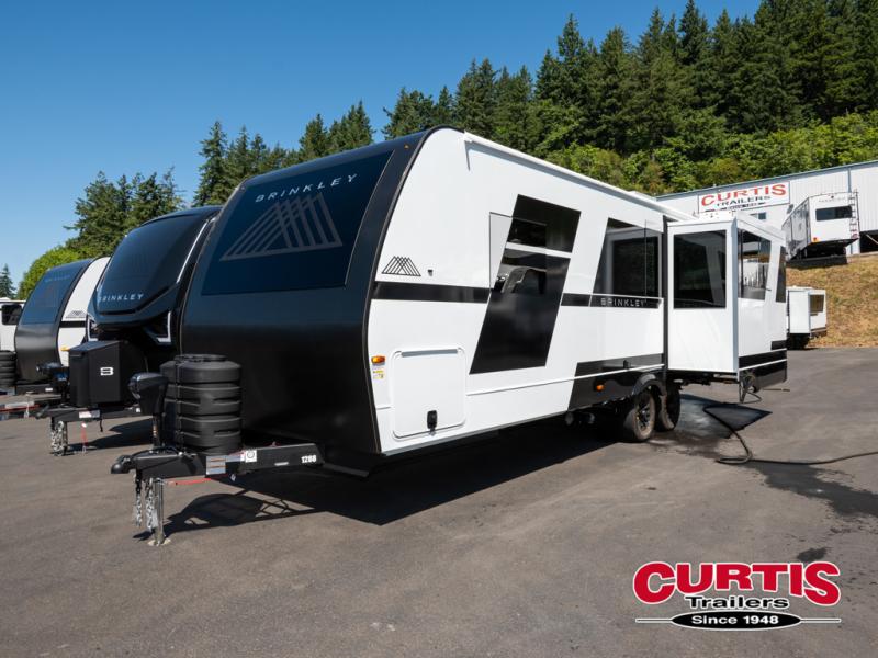 The lightweight Model I travel trailer by Brinkley is the perfect choice for those looking for an easy tow and at-home comforts! There is a drop-frame chassis, high-performance Road Armor suspension equalizer system, and Demco EZ Latch trailer coupler that automatically latches when dropped onto a hitch ball without the need of a safety pin. Additional exterior features include square Euro frameless windows, automotive-grade paint, full-width LED strip lighting in the pass-thru, and a pet & property security campside tie-down to keep your gear and furry friends safe. Inside, you'll be wowed by Brinkley's CraftSense wood trim construction, residential solid surface kitchen countertops, dimmable bedroom lights, and marine-grade neon LED shower lighting to name a few stand-out features!