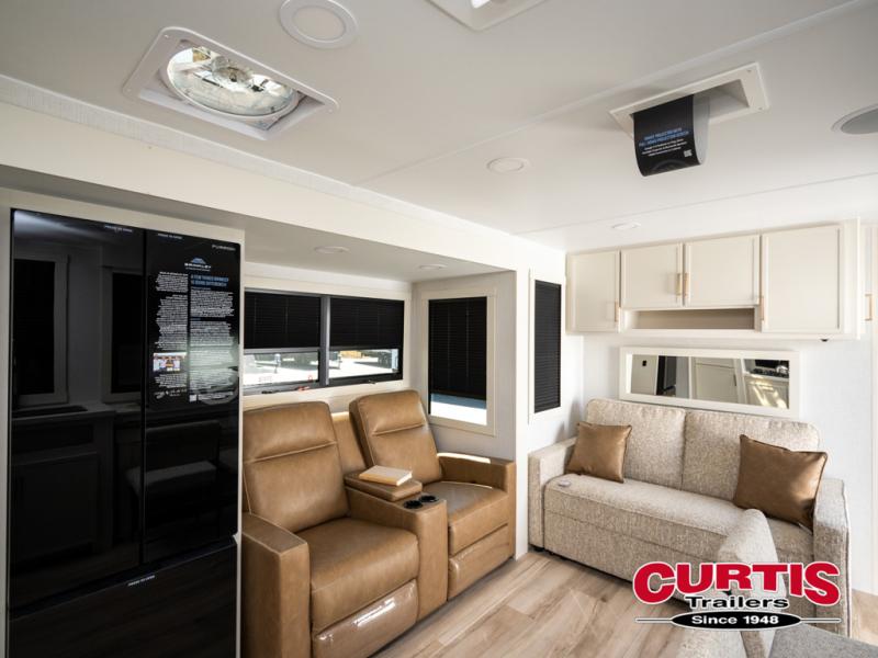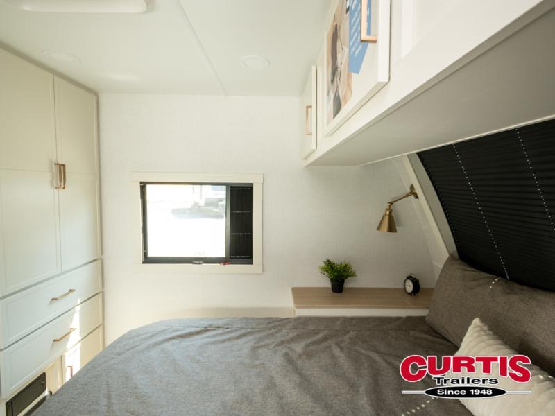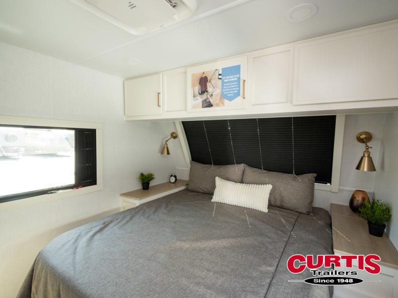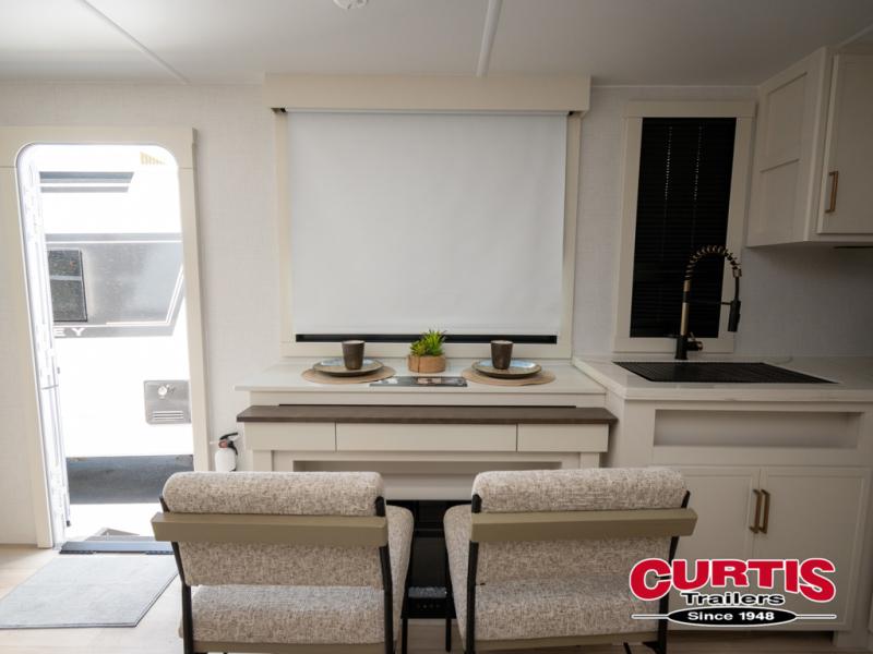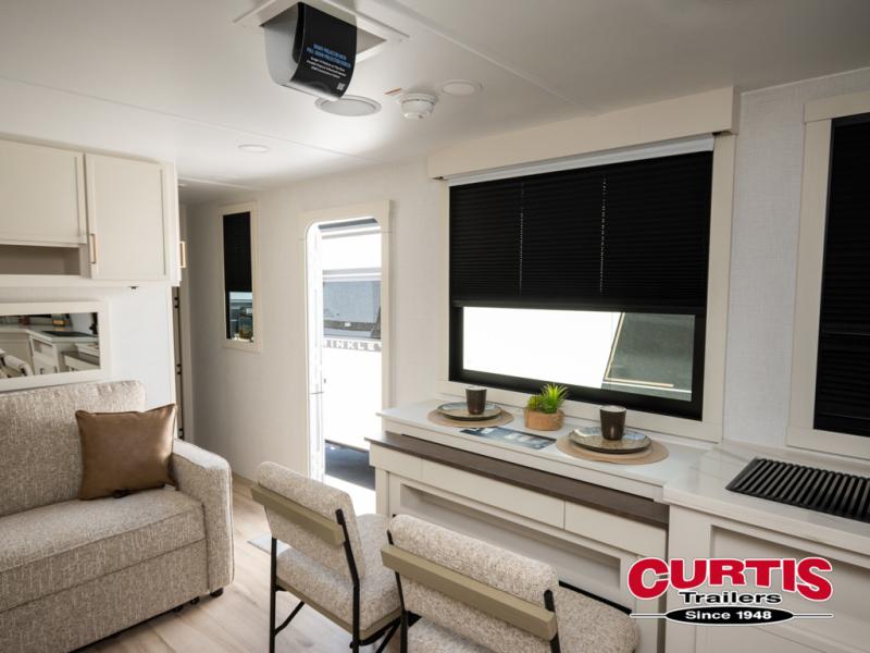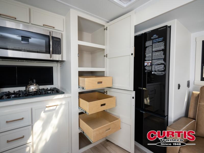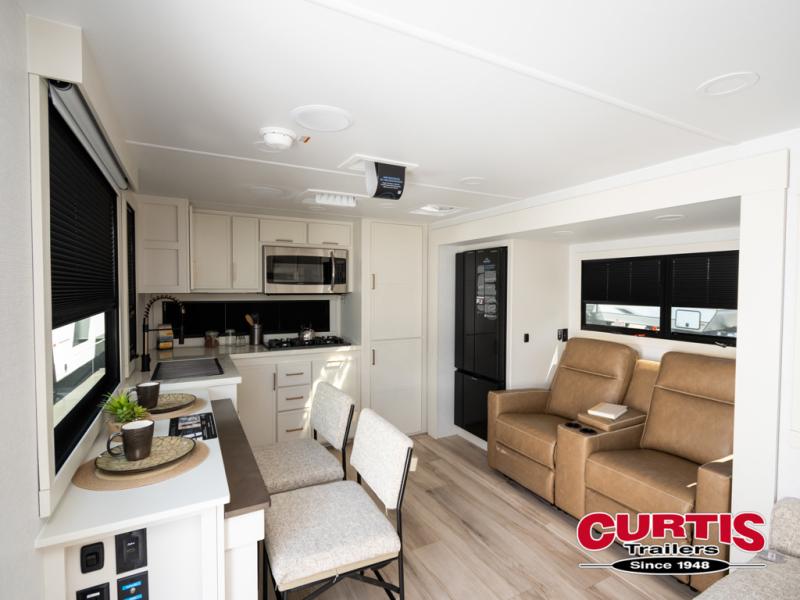 This travel trailer can comfortably sleep four with the king bed in the private bedroom and the tri-fold sofa in the main living area! The full bath features a spacious 42" x 30" shower with a built-in seat and Maxxair fan to name a few comforts. The front private bedroom features a 66" x 80" king bed with a MaxSpace Split-Level Wardrobe underneath to store shoes, clothes, and more! A slide out in the combined living area and rear kitchen makes your space more open, and you'll enjoy relaxing on the theater seating here in the evenings. The full kitchen includes a three burner stovetop, residential 30" convection microwave, 12 cu. ft. 12V refrigerator, plus a trash bin and Stow N' Go paper towel holder for added convenience. You can choose to eat outdoors under the 19' electric awning with LED lights or stay inside to dine at the pull-out dining table with a drawer for added storage!