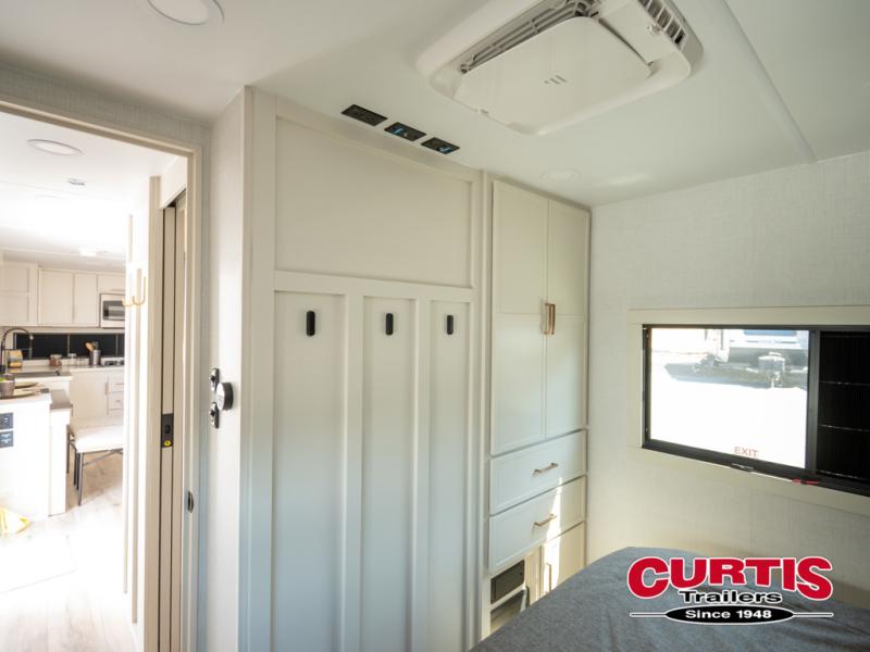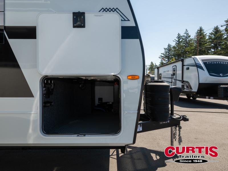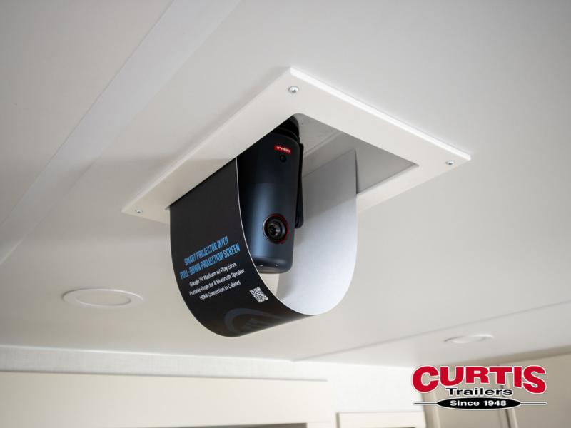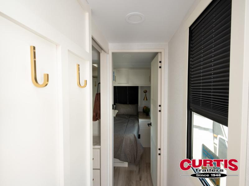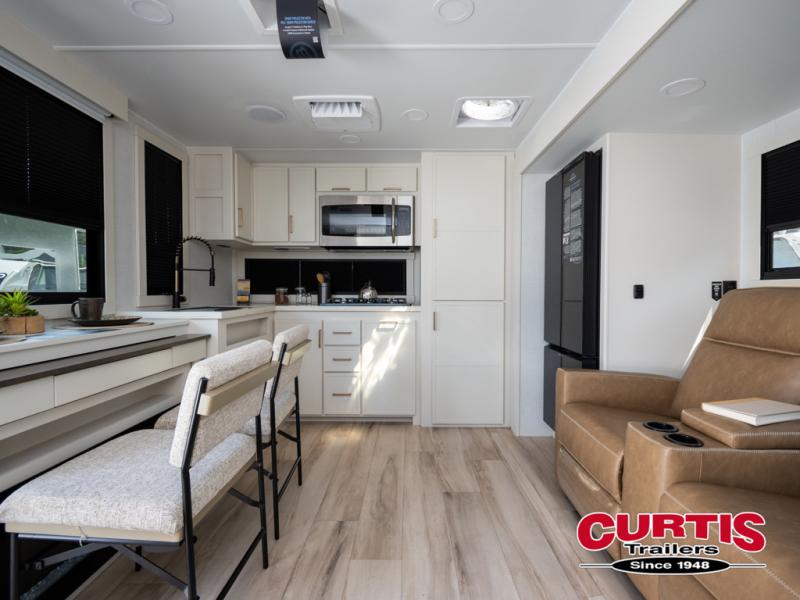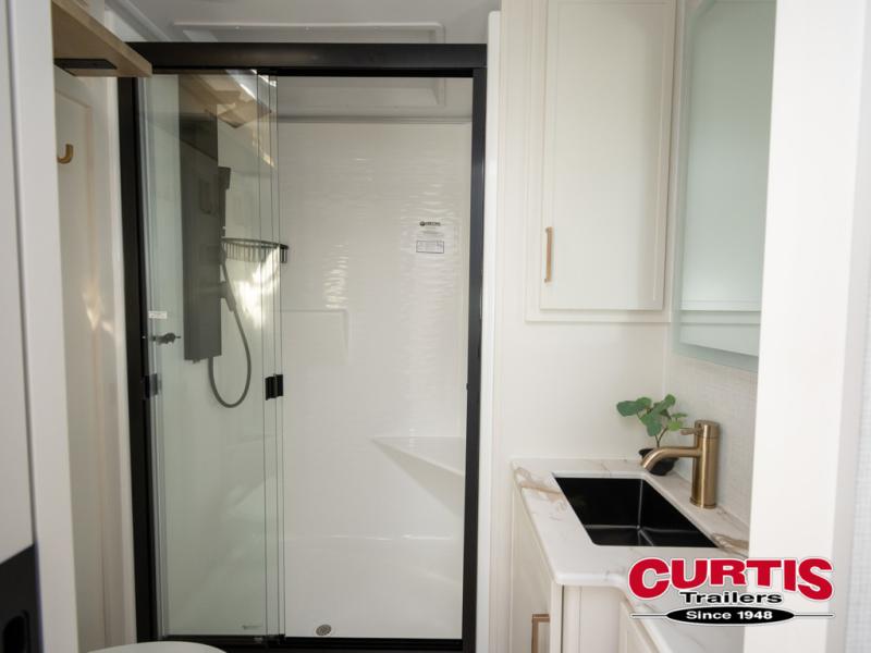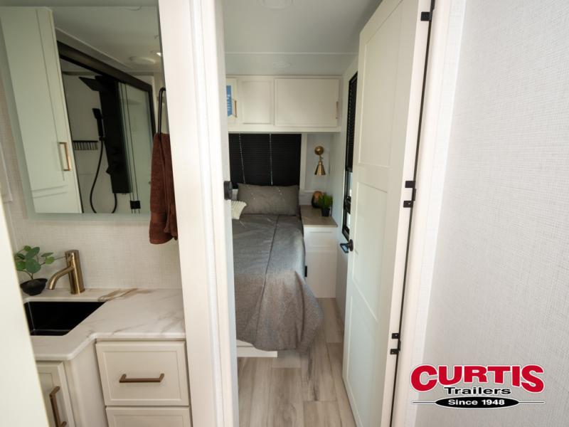 This travel trailer can comfortably sleep four with the king bed in the private bedroom and the tri-fold sofa in the main living area! The full bath features a spacious 42" x 30" shower with a built-in seat and Maxxair fan to name a few comforts. The front private bedroom features a 66" x 80" king bed with a MaxSpace Split-Level Wardrobe underneath to store shoes, clothes, and more! A slide out in the combined living area and rear kitchen makes your space more open, and you'll enjoy relaxing on the theater seating here in the evenings. The full kitchen includes a three burner stovetop, residential 30" convection microwave, 12 cu. ft. 12V refrigerator, plus a trash bin and Stow N' Go paper towel holder for added convenience. You can choose to eat outdoors under the 19' electric awning with LED lights or stay inside to dine at the pull-out dining table with a drawer for added storage!