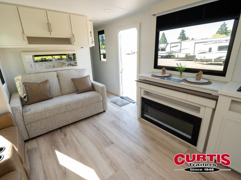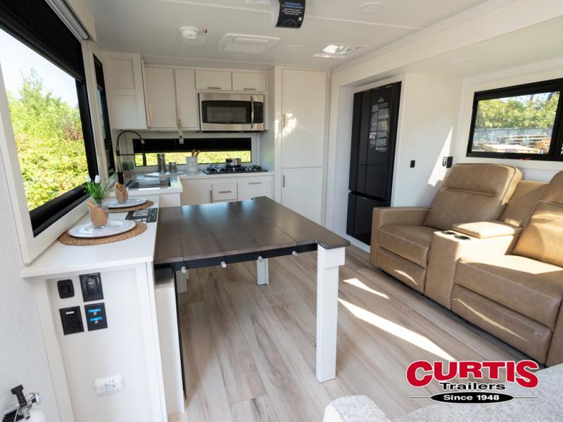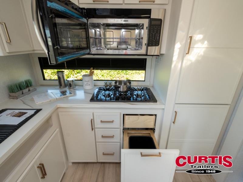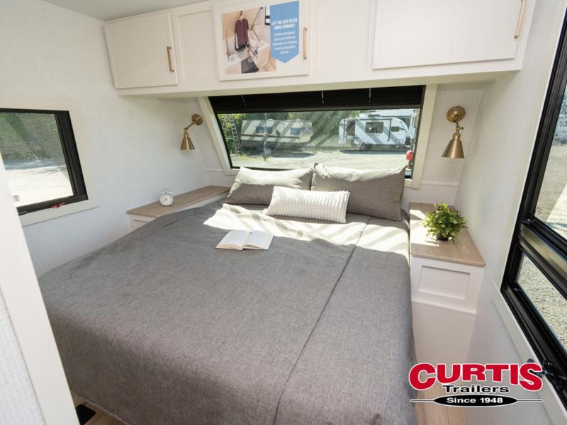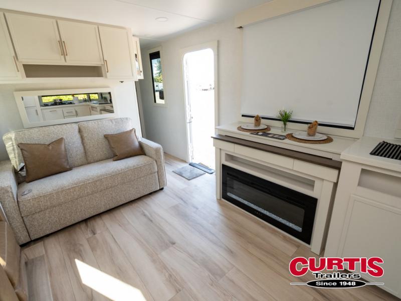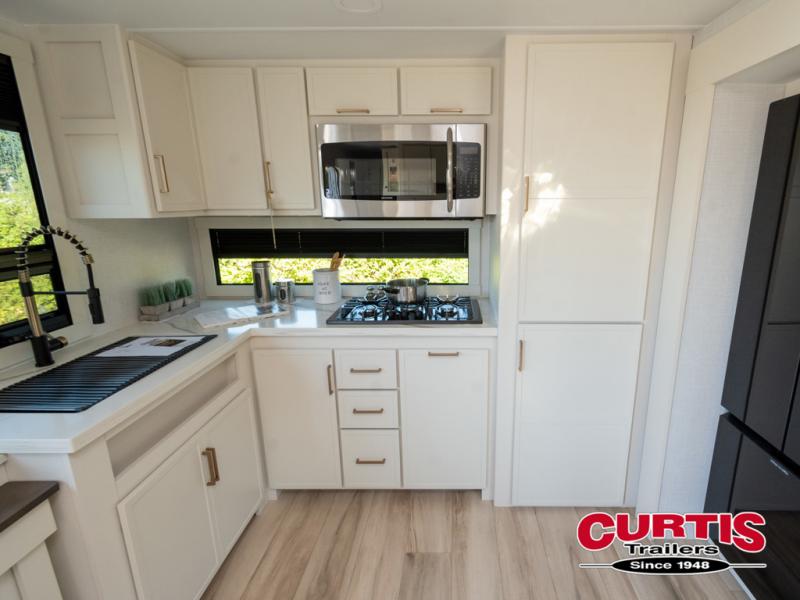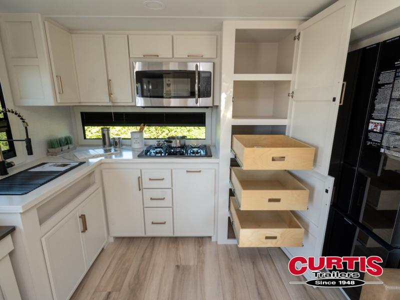This travel trailer can comfortably sleep four with the king bed in the private bedroom and the tri-fold sofa in the main living area! The full bath features a spacious 42" x 30" shower with a built-in seat and Maxxair fan to name a few comforts. The front private bedroom features a 66" x 80" king bed with a MaxSpace Split-Level Wardrobe underneath to store shoes, clothes, and more! A slide out in the combined living area and rear kitchen makes your space more open, and you'll enjoy relaxing on the theater seating here in the evenings. The full kitchen includes a three burner stovetop, residential 30" convection microwave, 12 cu. ft. 12V refrigerator, plus a trash bin and Stow N' Go paper towel holder for added convenience. You can choose to eat outdoors under the 19' electric awning with LED lights or stay inside to dine at the pull-out dining table with a drawer for added storage!