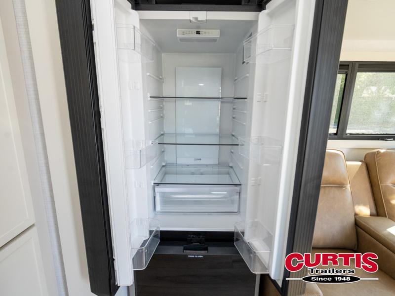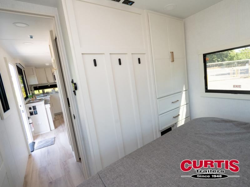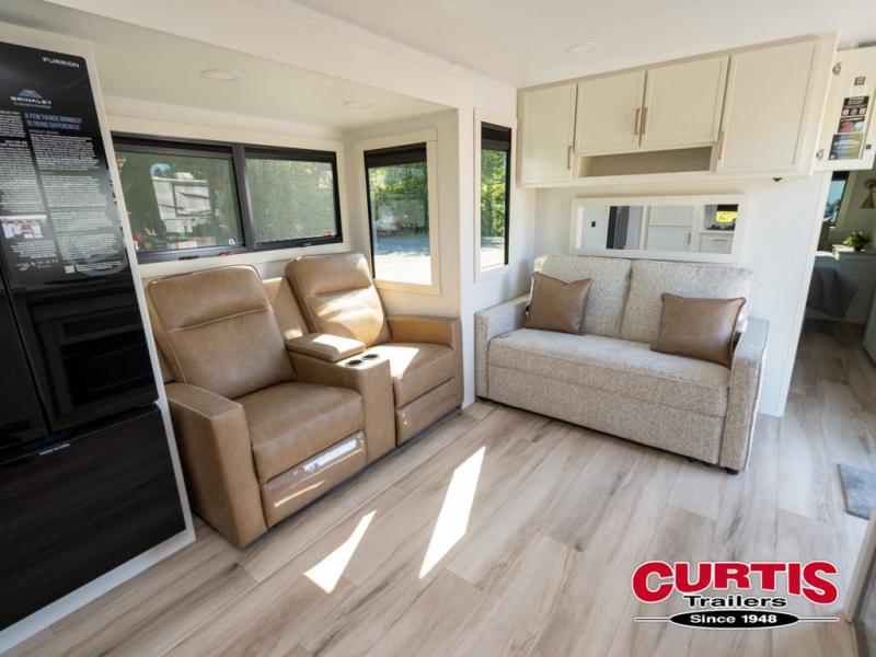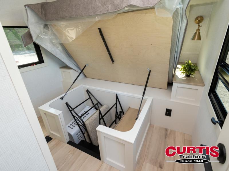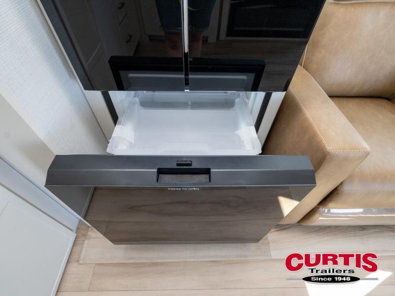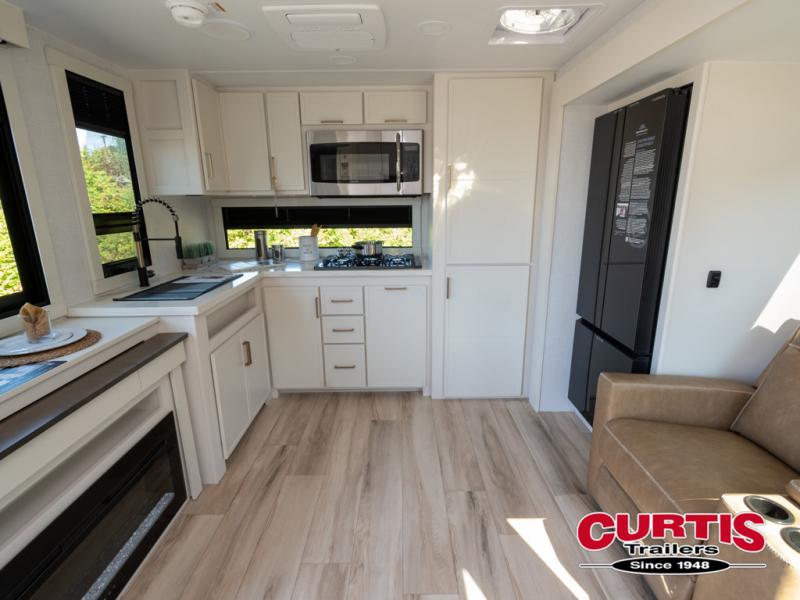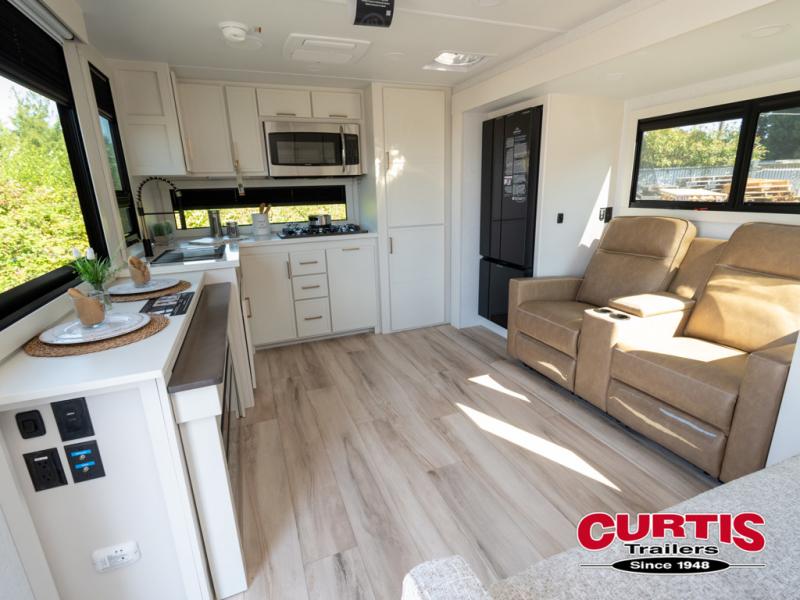 This travel trailer can comfortably sleep four with the king bed in the private bedroom and the tri-fold sofa in the main living area! The full bath features a spacious 42" x 30" shower with a built-in seat and Maxxair fan to name a few comforts. The front private bedroom features a 66" x 80" king bed with a MaxSpace Split-Level Wardrobe underneath to store shoes, clothes, and more! A slide out in the combined living area and rear kitchen makes your space more open, and you'll enjoy relaxing on the theater seating here in the evenings. The full kitchen includes a three burner stovetop, residential 30" convection microwave, 12 cu. ft. 12V refrigerator, plus a trash bin and Stow N' Go paper towel holder for added convenience. You can choose to eat outdoors under the 19' electric awning with LED lights or stay inside to dine at the pull-out dining table with a drawer for added storage!