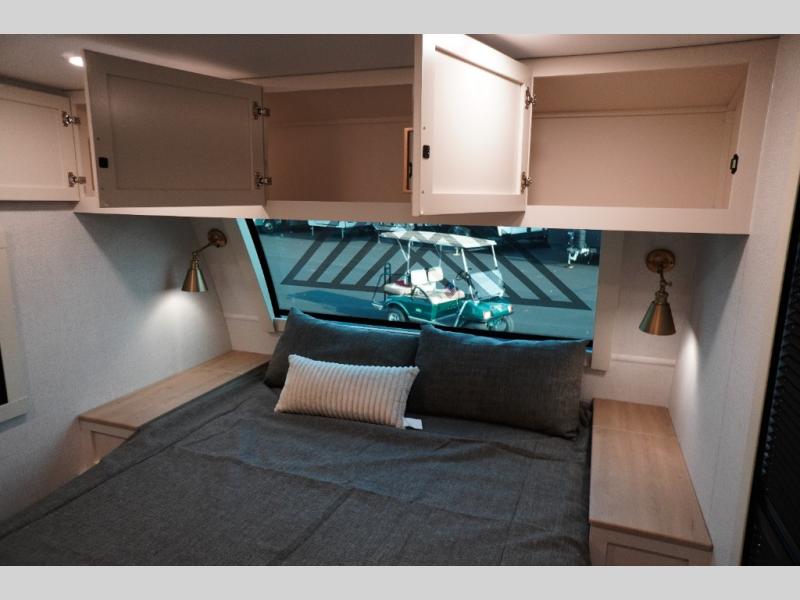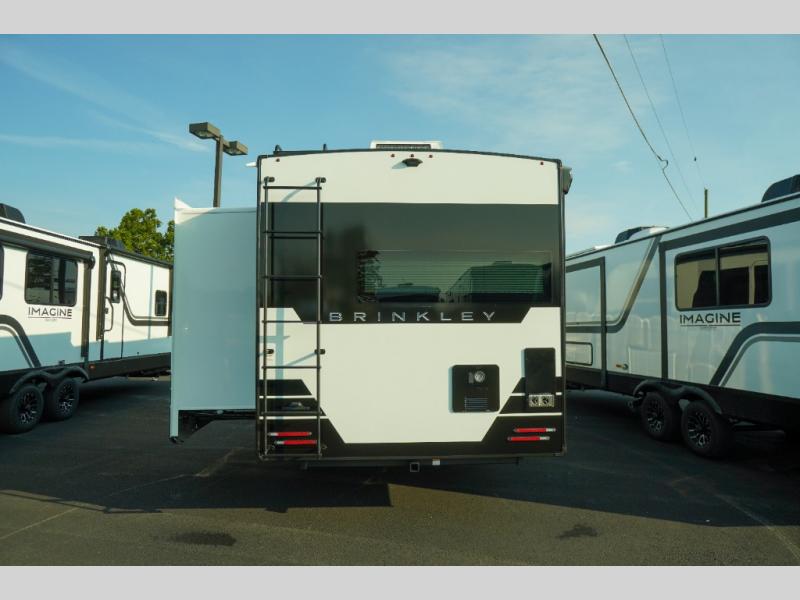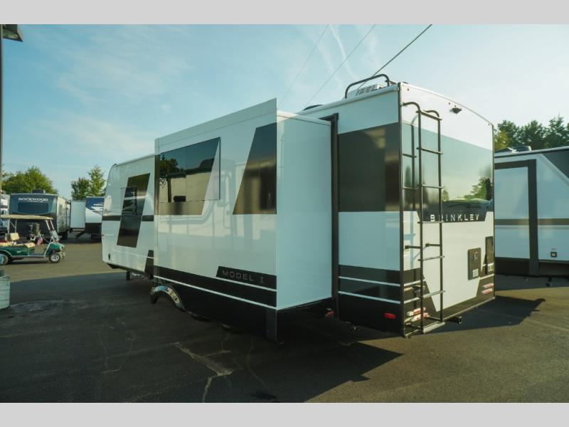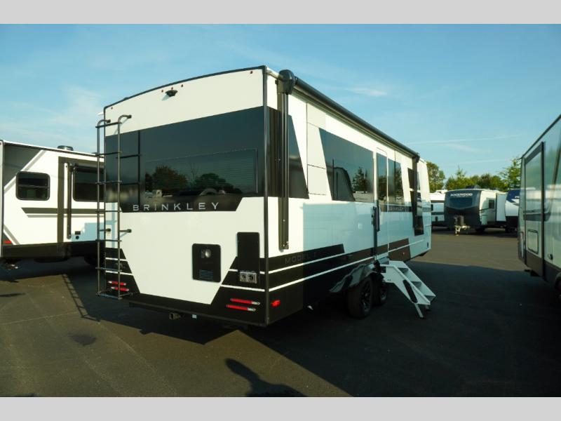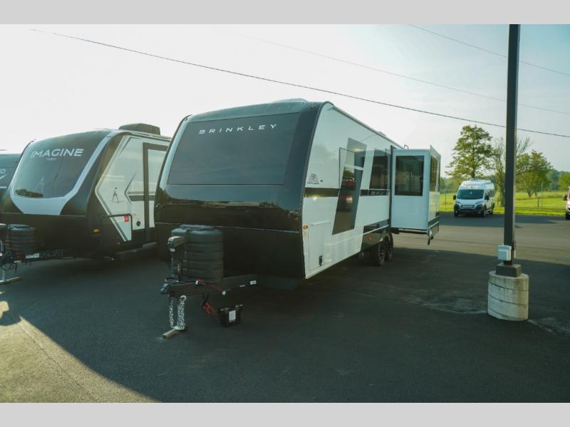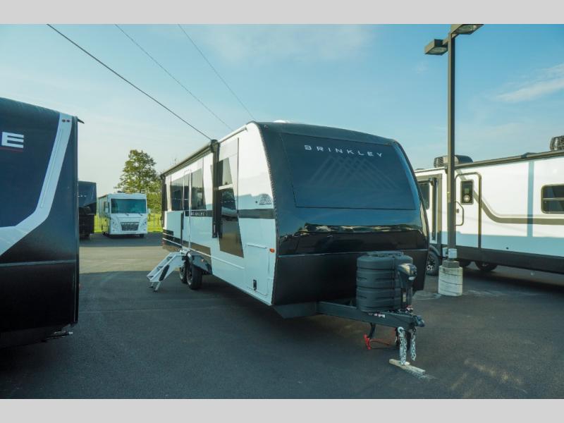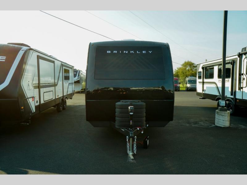 The lightweight Model I travel trailer by Brinkley is the perfect choice for those looking for an easy tow and at-home comforts! There is a drop-frame chassis, high-performance Road Armor suspension equalizer system, and Demco EZ Latch trailer coupler that automatically latches when dropped onto a hitch ball without the need of a safety pin. Additional exterior features include square Euro frameless windows, automotive-grade paint, full-width LED strip lighting in the pass-thru, and a pet & property security campside tie-down to keep your gear and furry friends safe. Inside, you'll be wowed by Brinkley's CraftSense wood trim construction, residential solid surface kitchen countertops, dimmable bedroom lights, and marine-grade neon LED shower lighting to name a few stand-out features!
