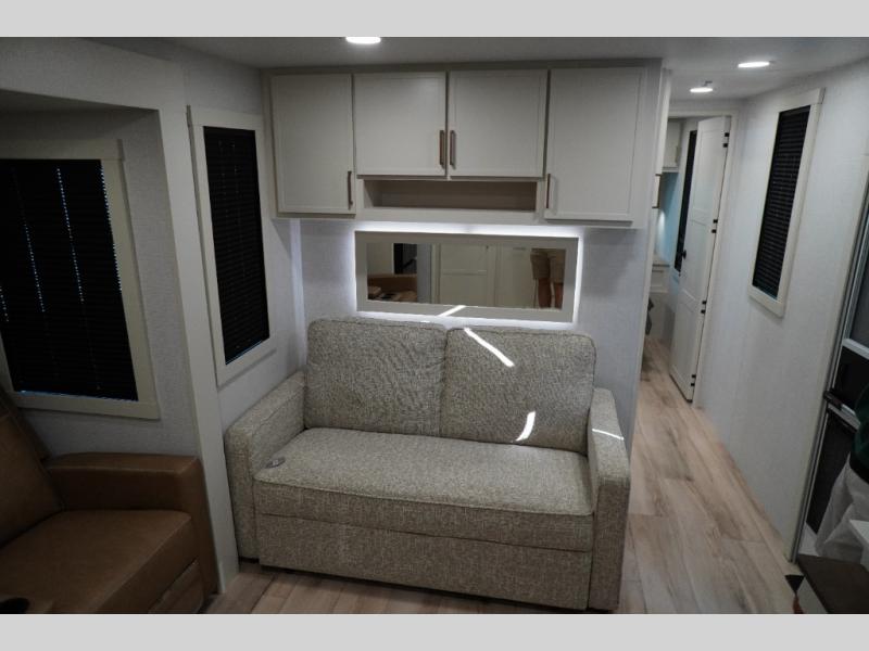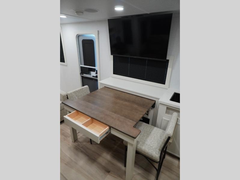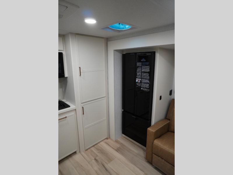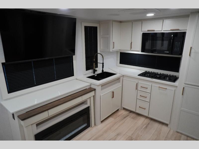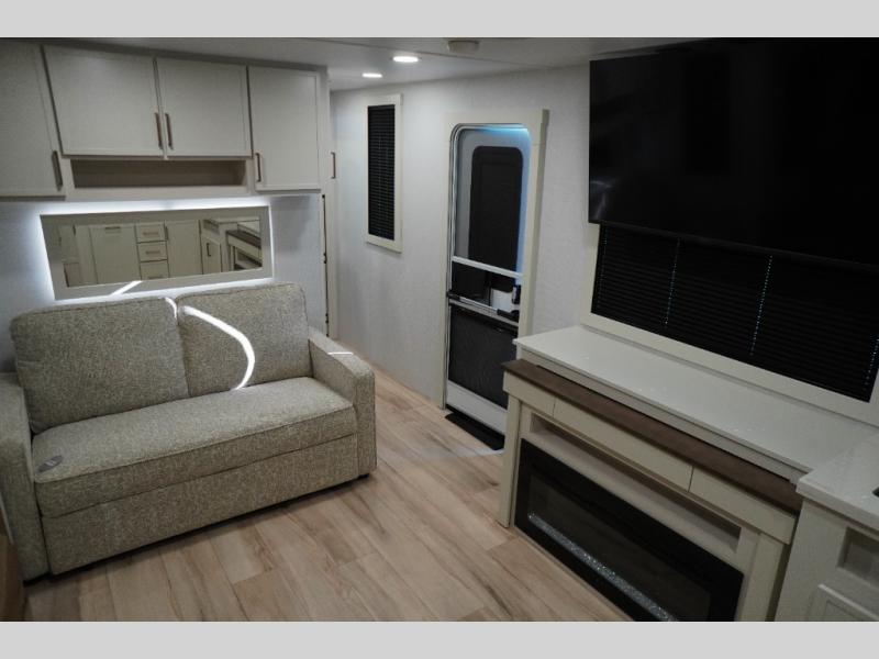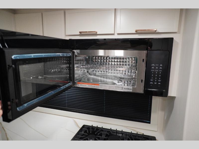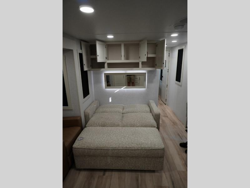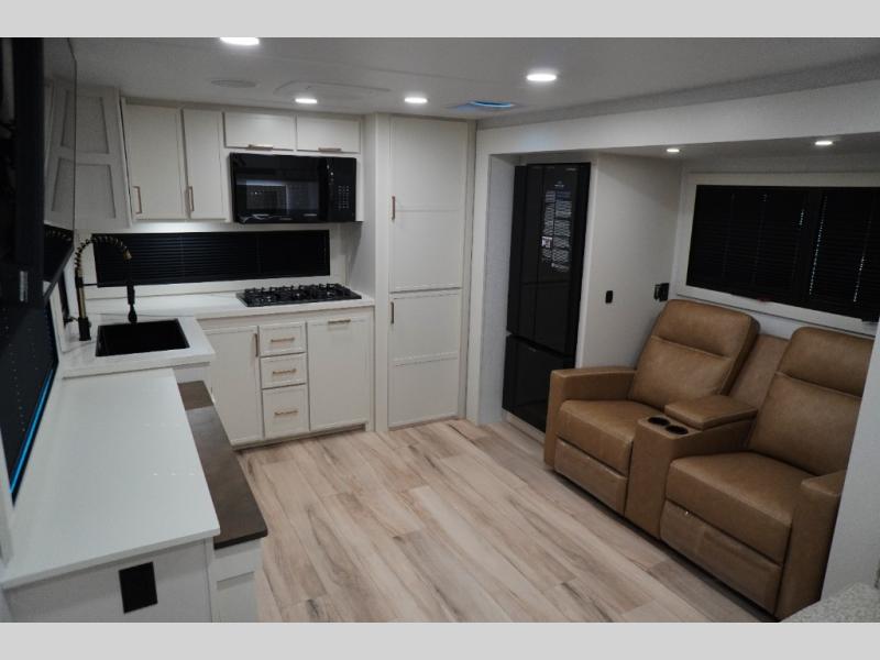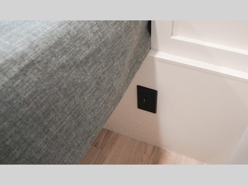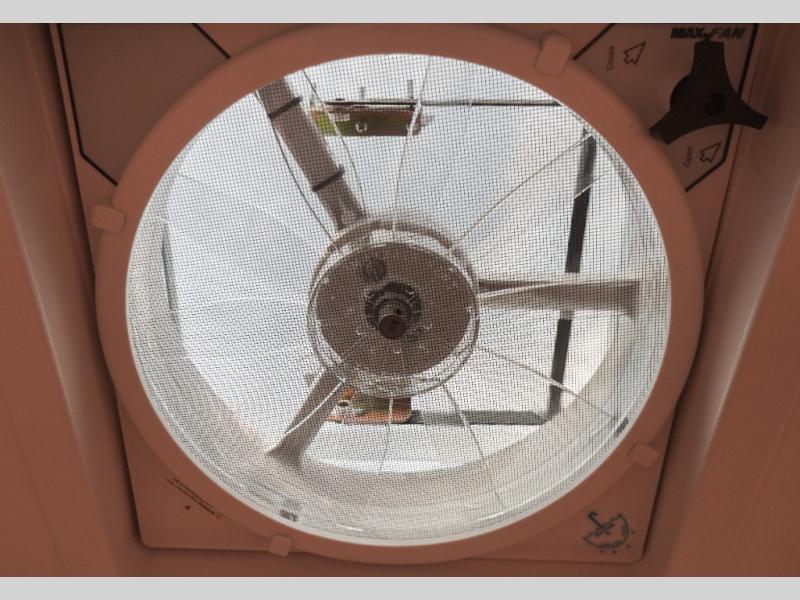 This travel trailer can comfortably sleep four with the king bed in the private bedroom and the tri-fold sofa in the main living area! The full bath features a spacious 42" x 30" shower with a built-in seat and Maxxair fan to name a few comforts. The front private bedroom features a 66" x 80" king bed with a MaxSpace Split-Level Wardrobe underneath to store shoes, clothes, and more! A slide out in the combined living area and rear kitchen makes your space more open, and you'll enjoy relaxing on the theater seating here in the evenings. The full kitchen includes a three burner stovetop, residential 30" convection microwave, 12 cu. ft. 12V refrigerator, plus a trash bin and Stow N' Go paper towel holder for added convenience. You can choose to eat outdoors under the 19' electric awning with LED lights or stay inside to dine at the pull-out dining table with a drawer for added storage!