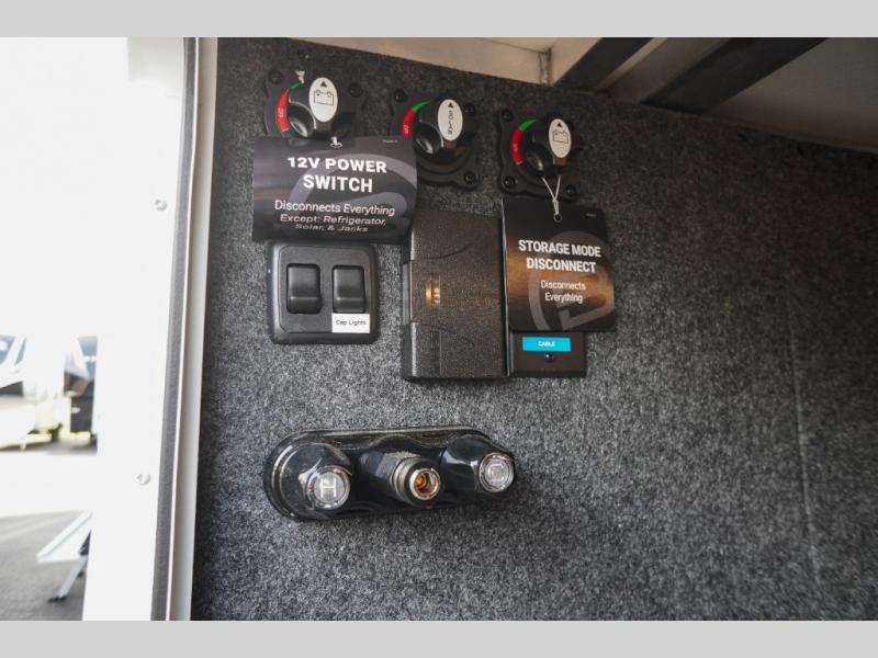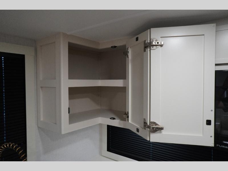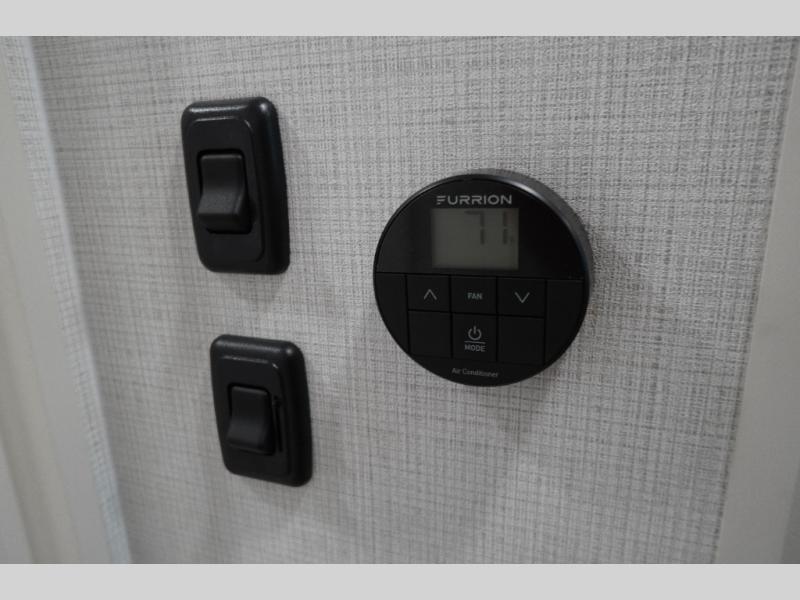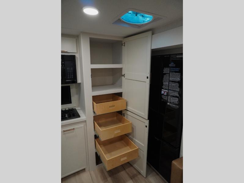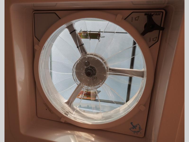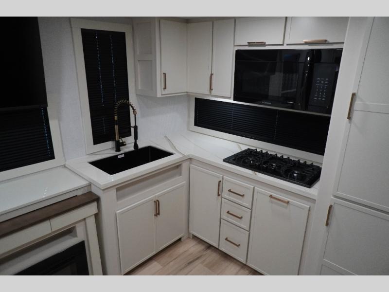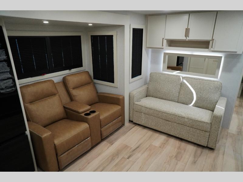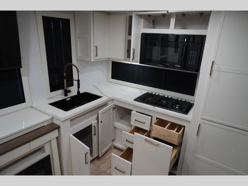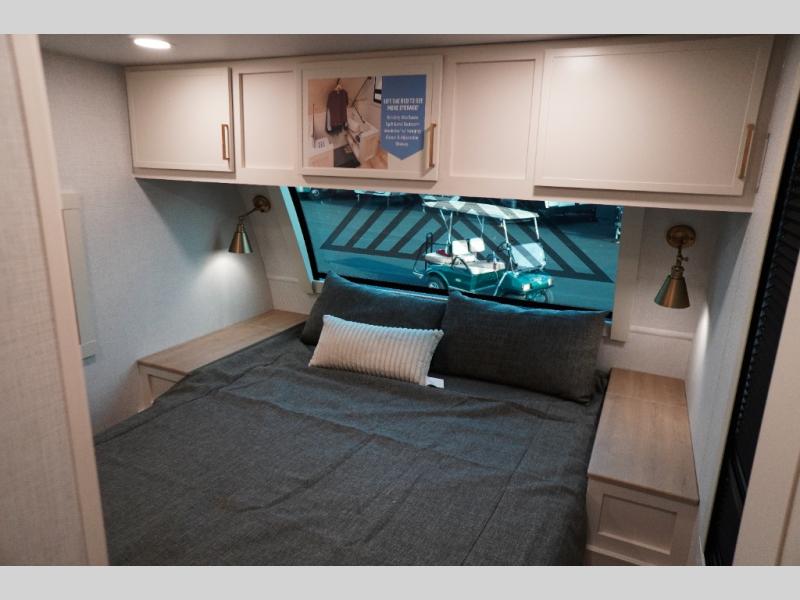 This travel trailer can comfortably sleep four with the king bed in the private bedroom and the tri-fold sofa in the main living area! The full bath features a spacious 42" x 30" shower with a built-in seat and Maxxair fan to name a few comforts. The front private bedroom features a 66" x 80" king bed with a MaxSpace Split-Level Wardrobe underneath to store shoes, clothes, and more! A slide out in the combined living area and rear kitchen makes your space more open, and you'll enjoy relaxing on the theater seating here in the evenings. The full kitchen includes a three burner stovetop, residential 30" convection microwave, 12 cu. ft. 12V refrigerator, plus a trash bin and Stow N' Go paper towel holder for added convenience. You can choose to eat outdoors under the 19' electric awning with LED lights or stay inside to dine at the pull-out dining table with a drawer for added storage!